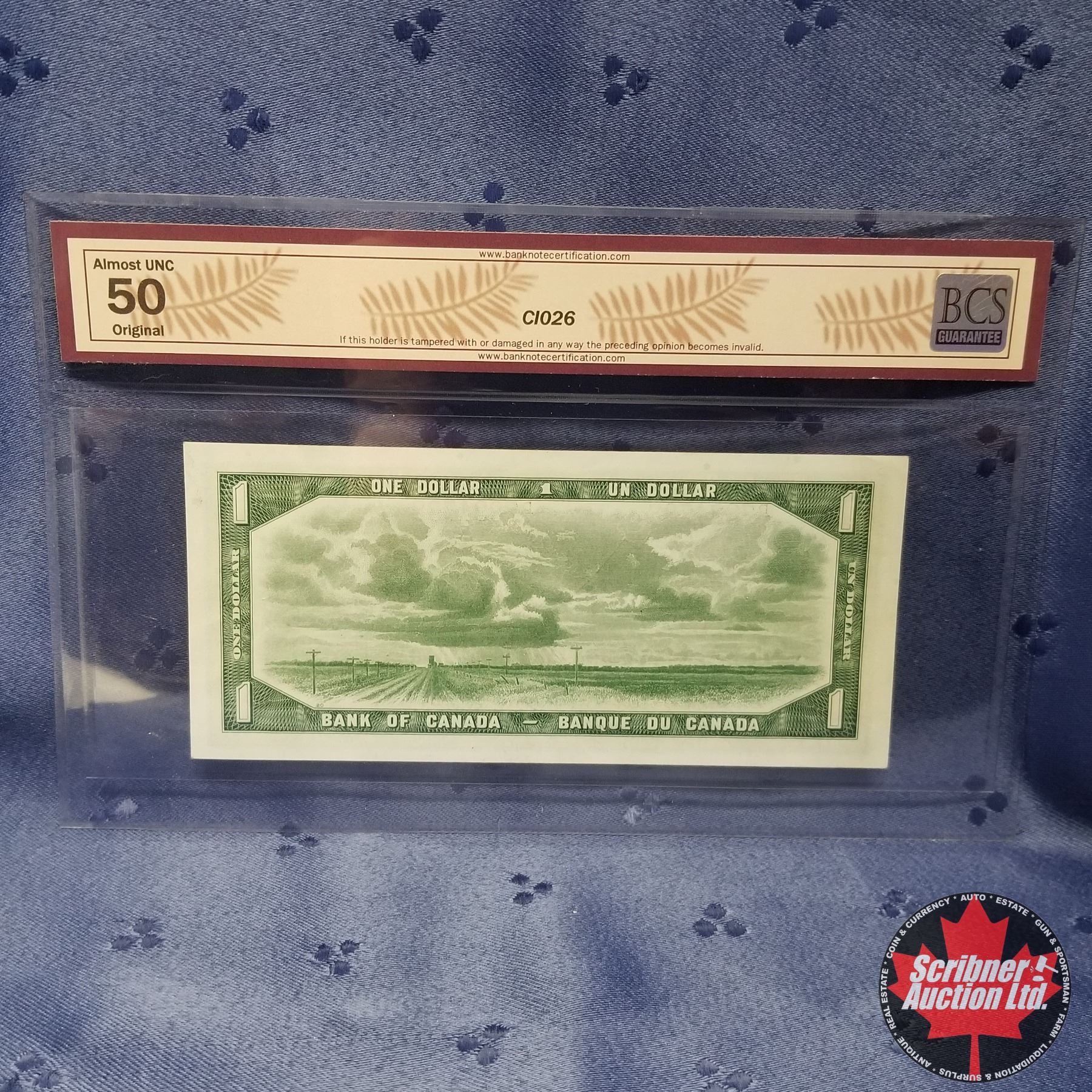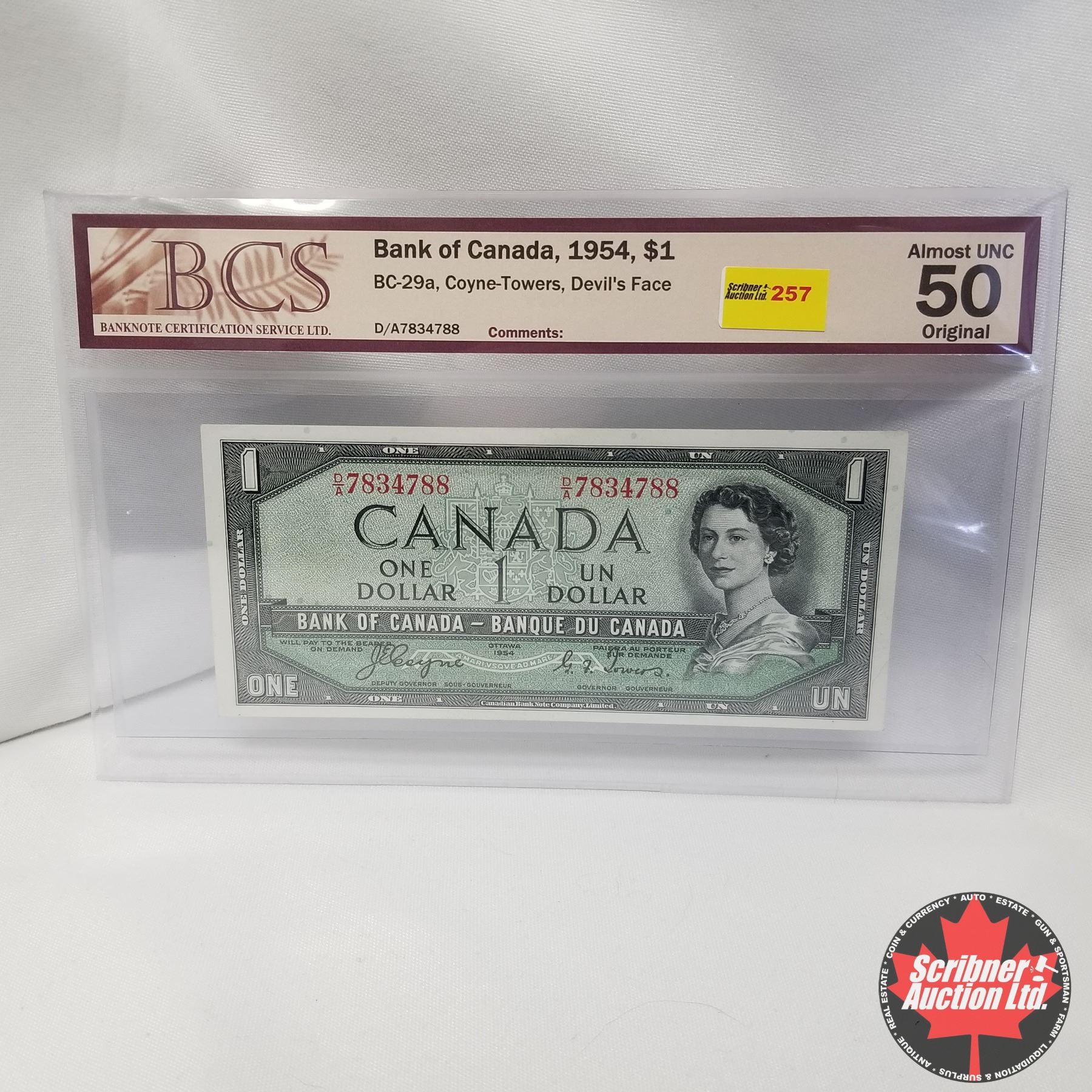 1954 Canada $1 Bill, Devil's Face, D/A7834788, Coyne/Towers (BCS Graded: Almost UNC 50 Original)