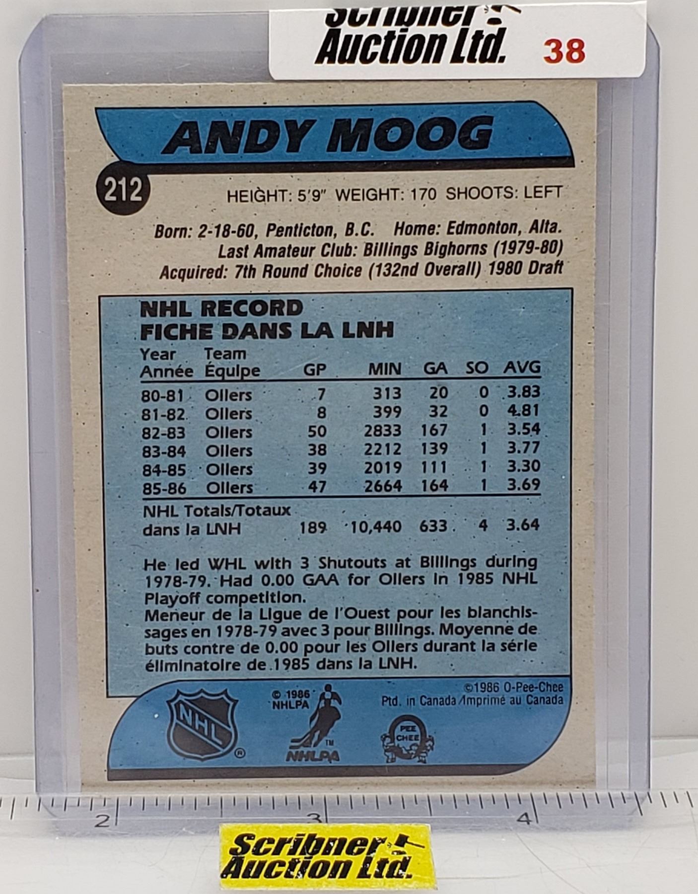 1986 O Pee Chee #212 Andy Moog : Oilers (Card Sleeve) (SEE PICS!)