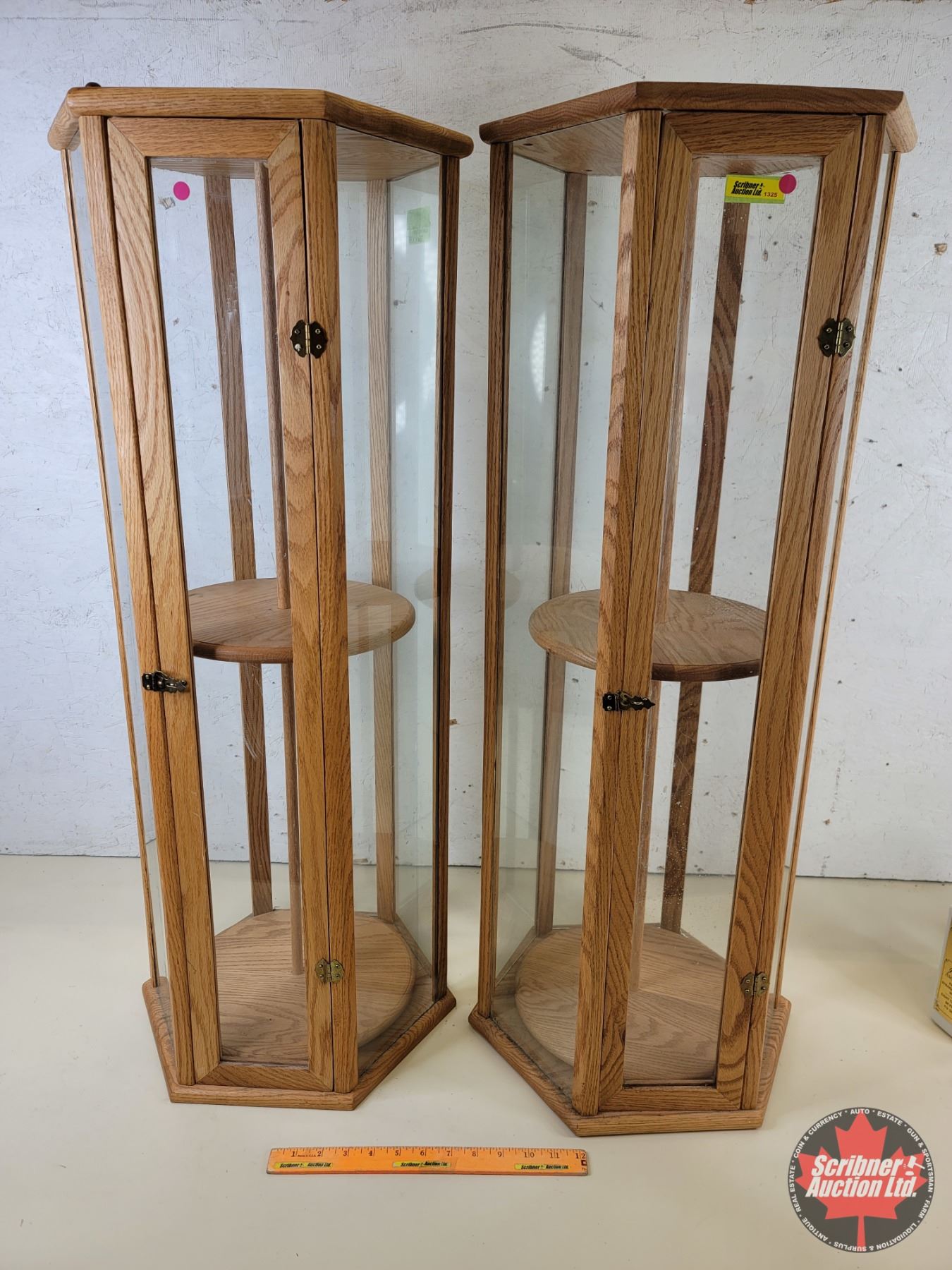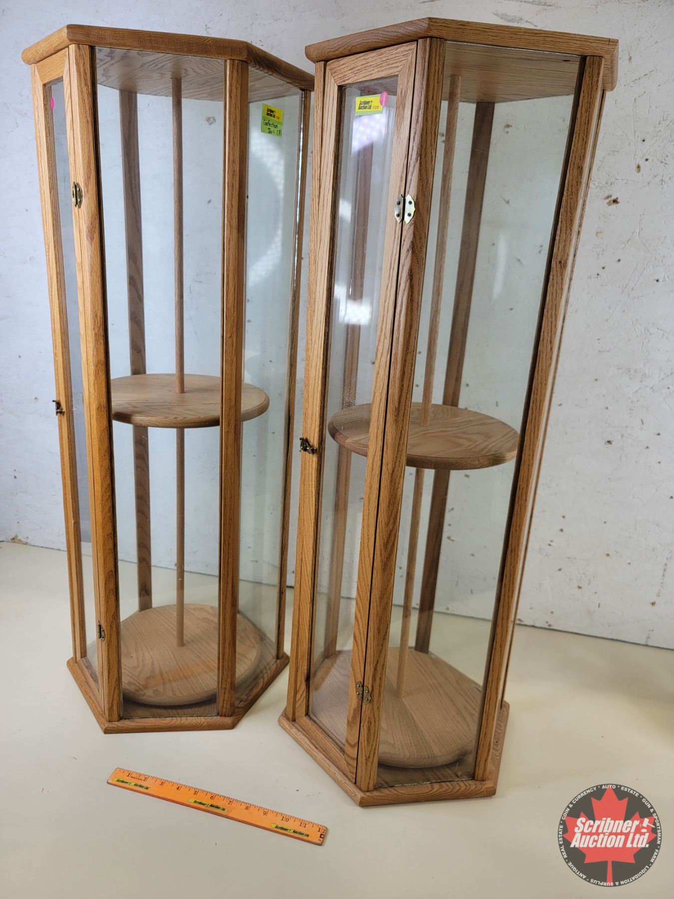 2 Counter Top Display Cases (Visible 6 Sides) (2 Interior Rotating Wood Shelves) (37"H x 15"Dia) (SEE PICS!)