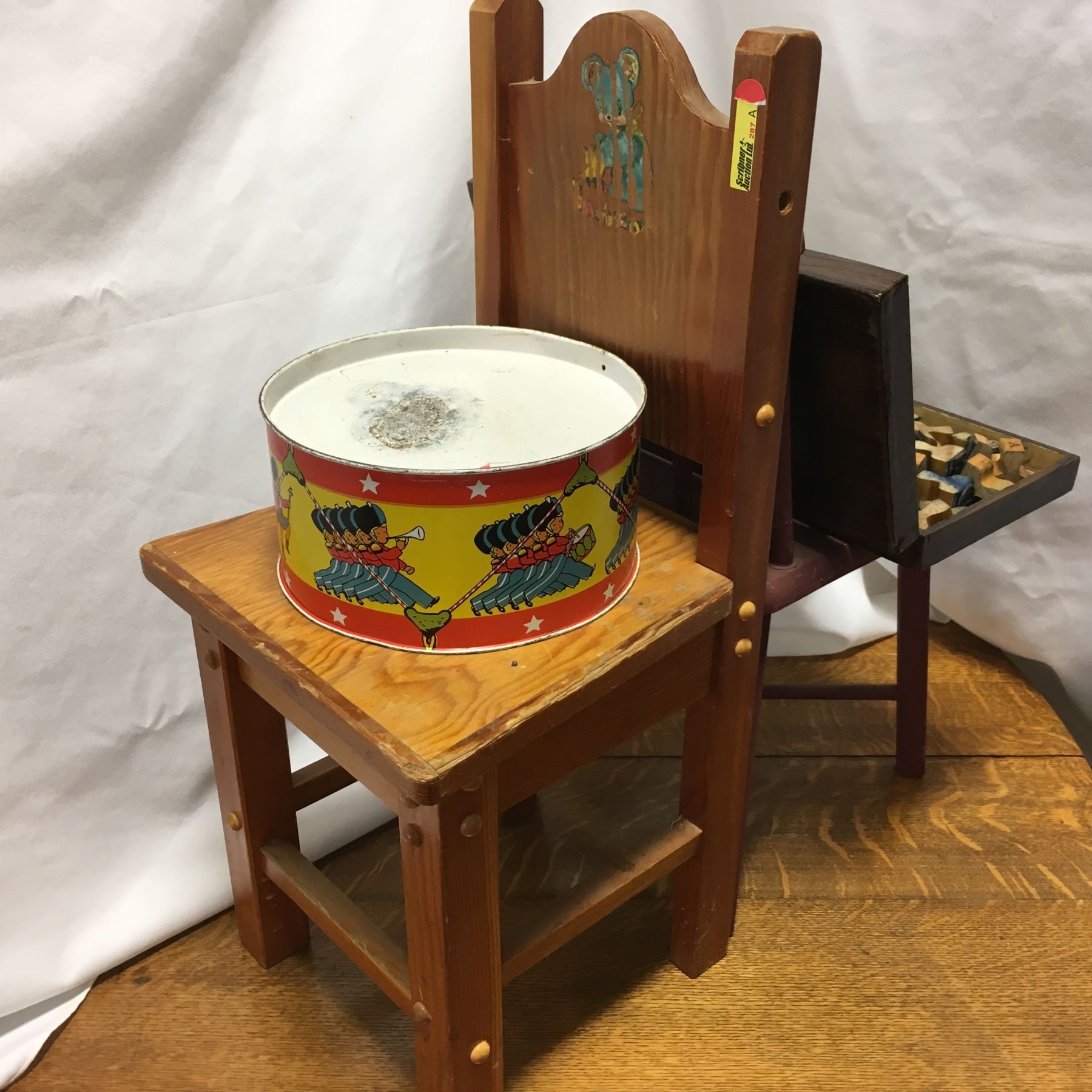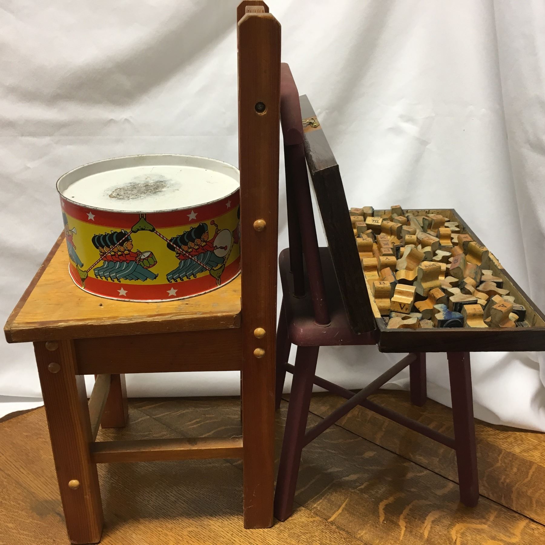 2 Small Children's Chairs, Vintage Letter/Number Stamp Wooden Stamp Set & Tin Drum