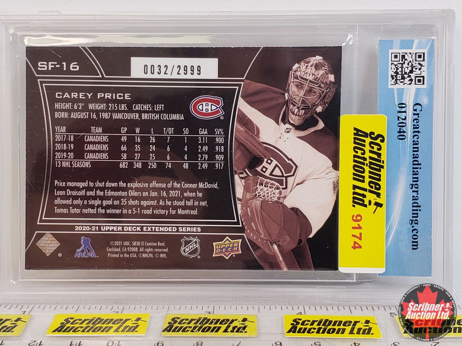 2020-21 SP Finite #SF-16 Carey Price Ltd Ed 0032/2999 : Canadiens (Certified GCG 9.5) (SEE PICS!)