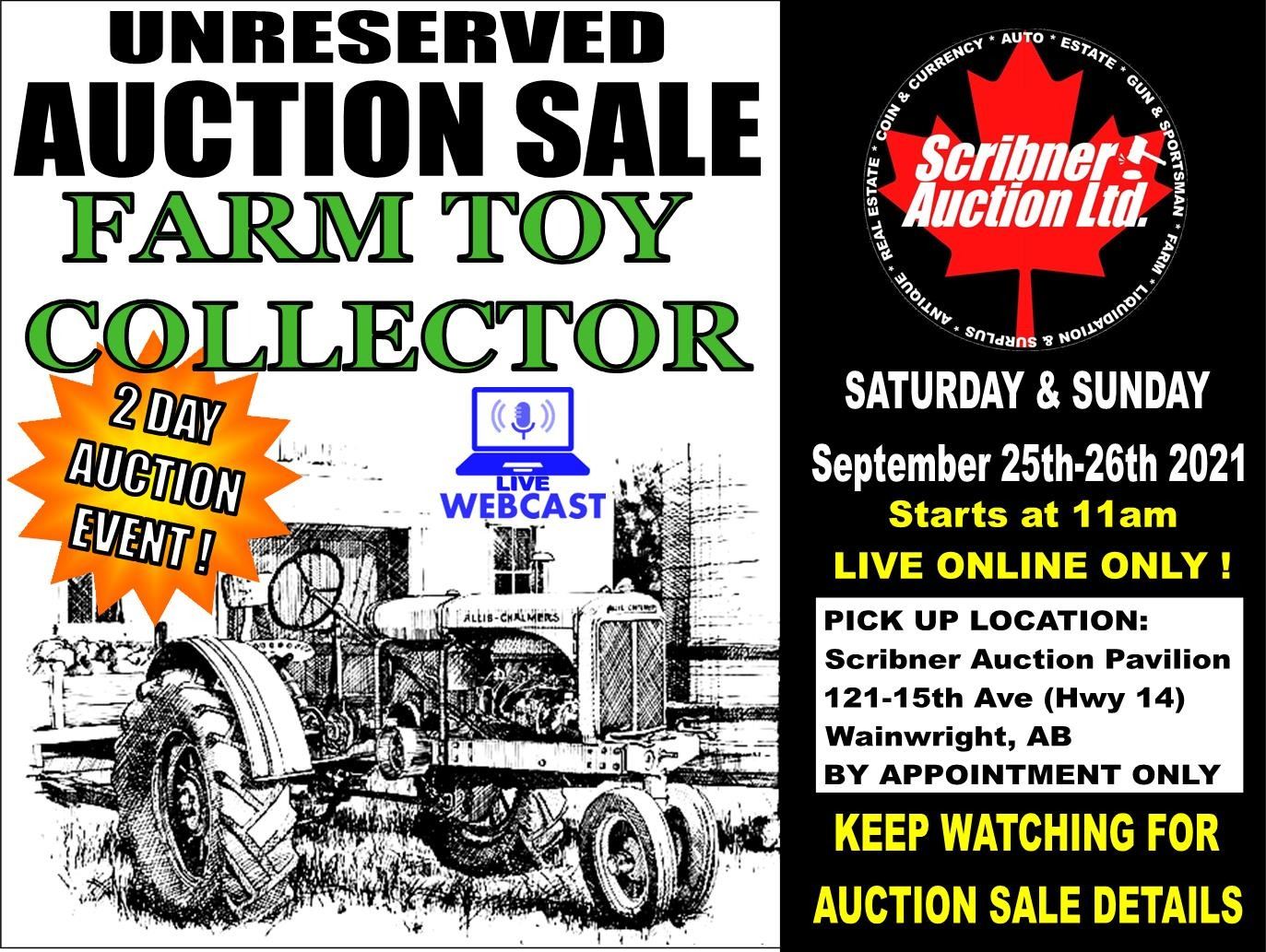 After an item has been sold, that item is the sole responsibility of the purchaser. All merchandise is sold AS IS/WHERE IS. No Guarantees or Warranties Given or Implied. Scribner Auction is not responsible for missing parts. No bidder shall retract his/her bid. All sales are final. Open house Preview on Thursday September 23rd from 2pm - 7pm at the Auction location (121 - 15 Ave Wainwright, AB) AND ONLY IF SAFE TO DO SO DURING COVID 19 GOVERNMENT REGULATIONS.