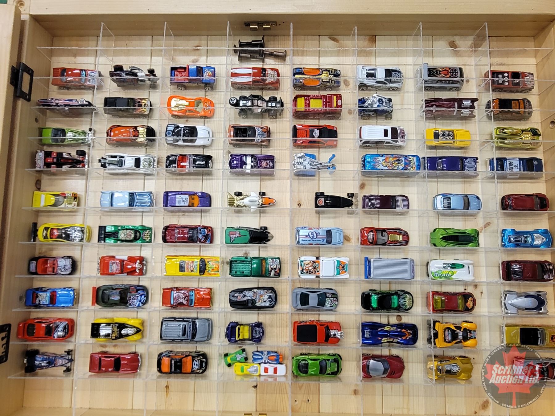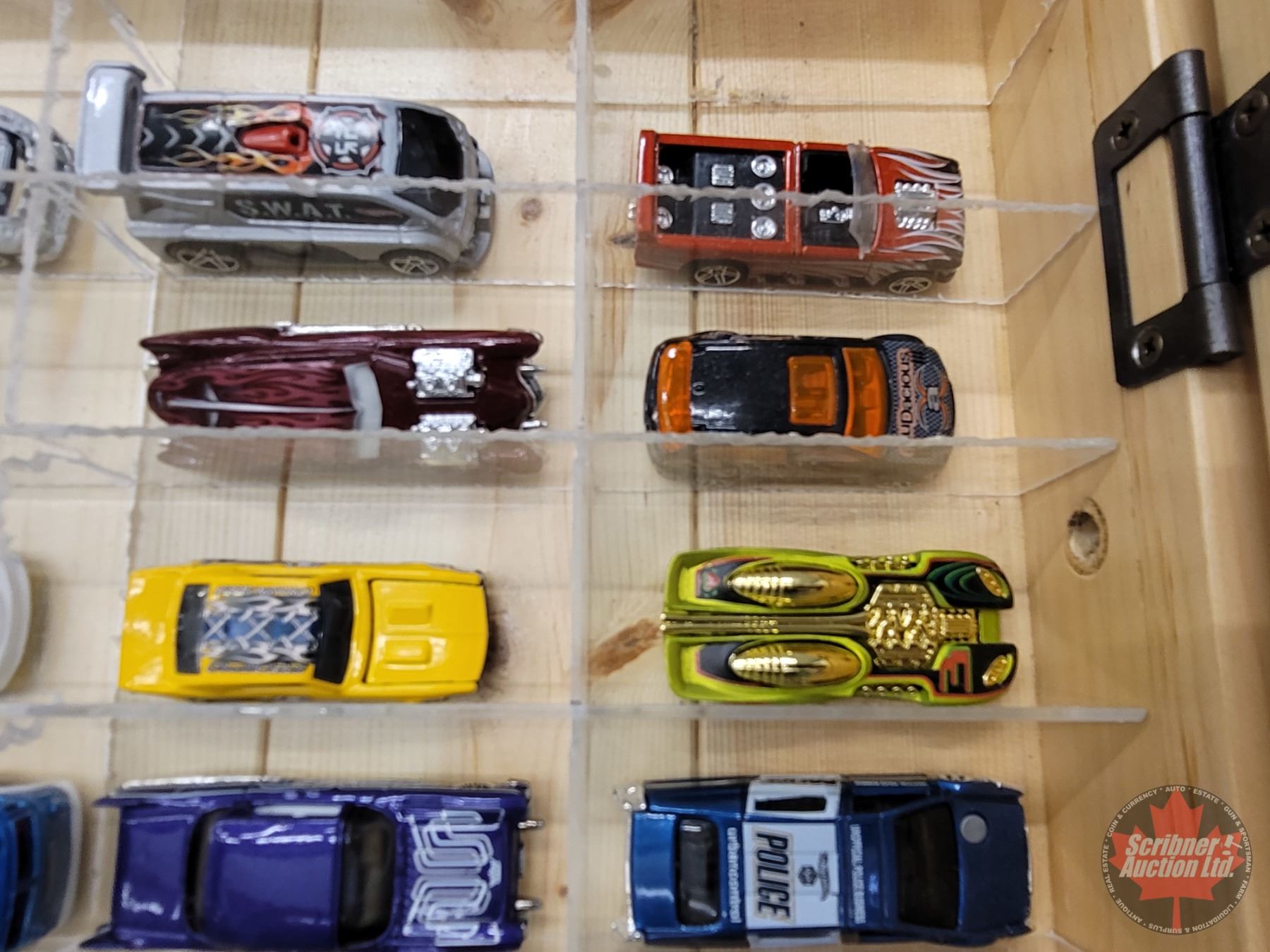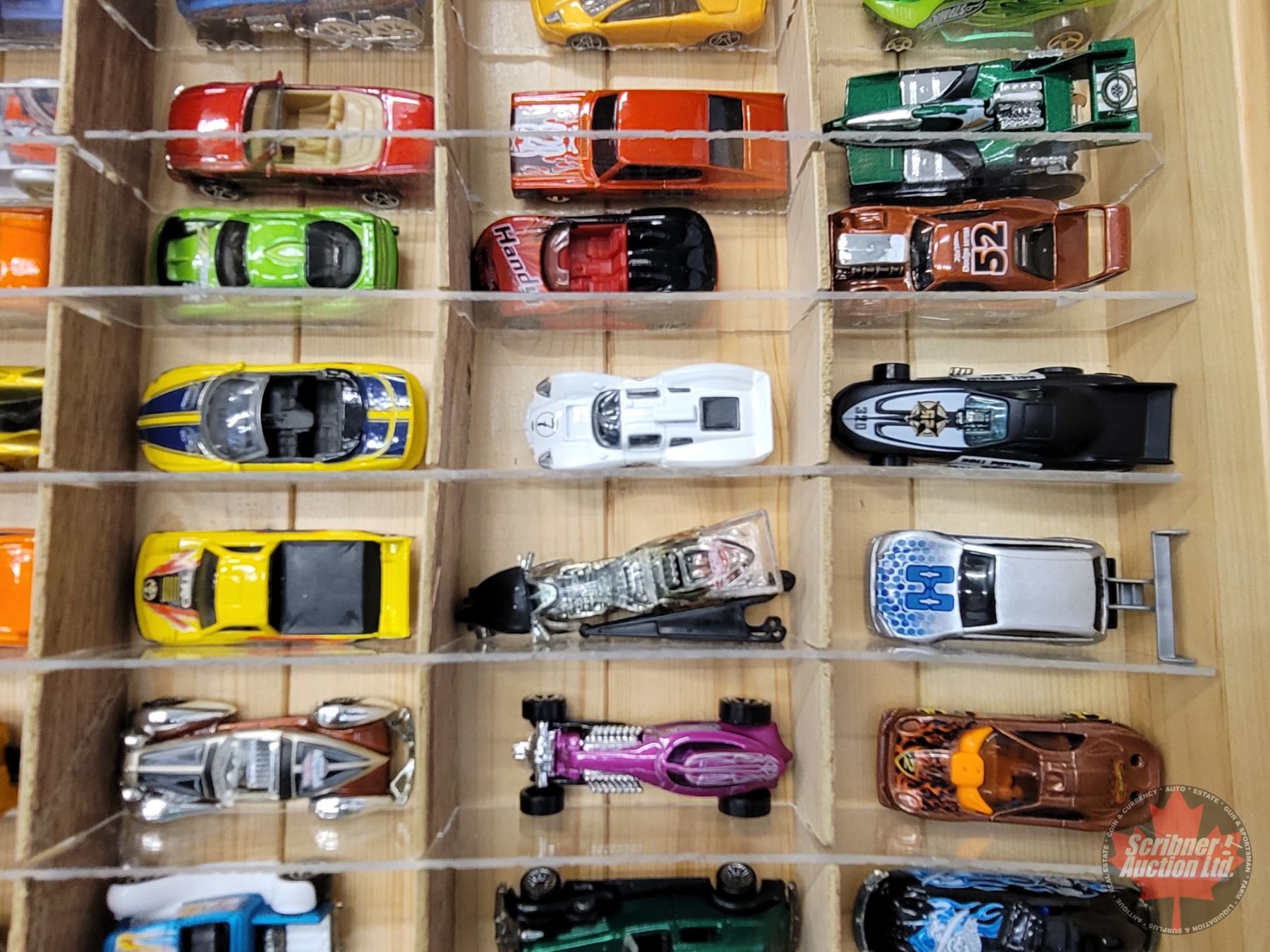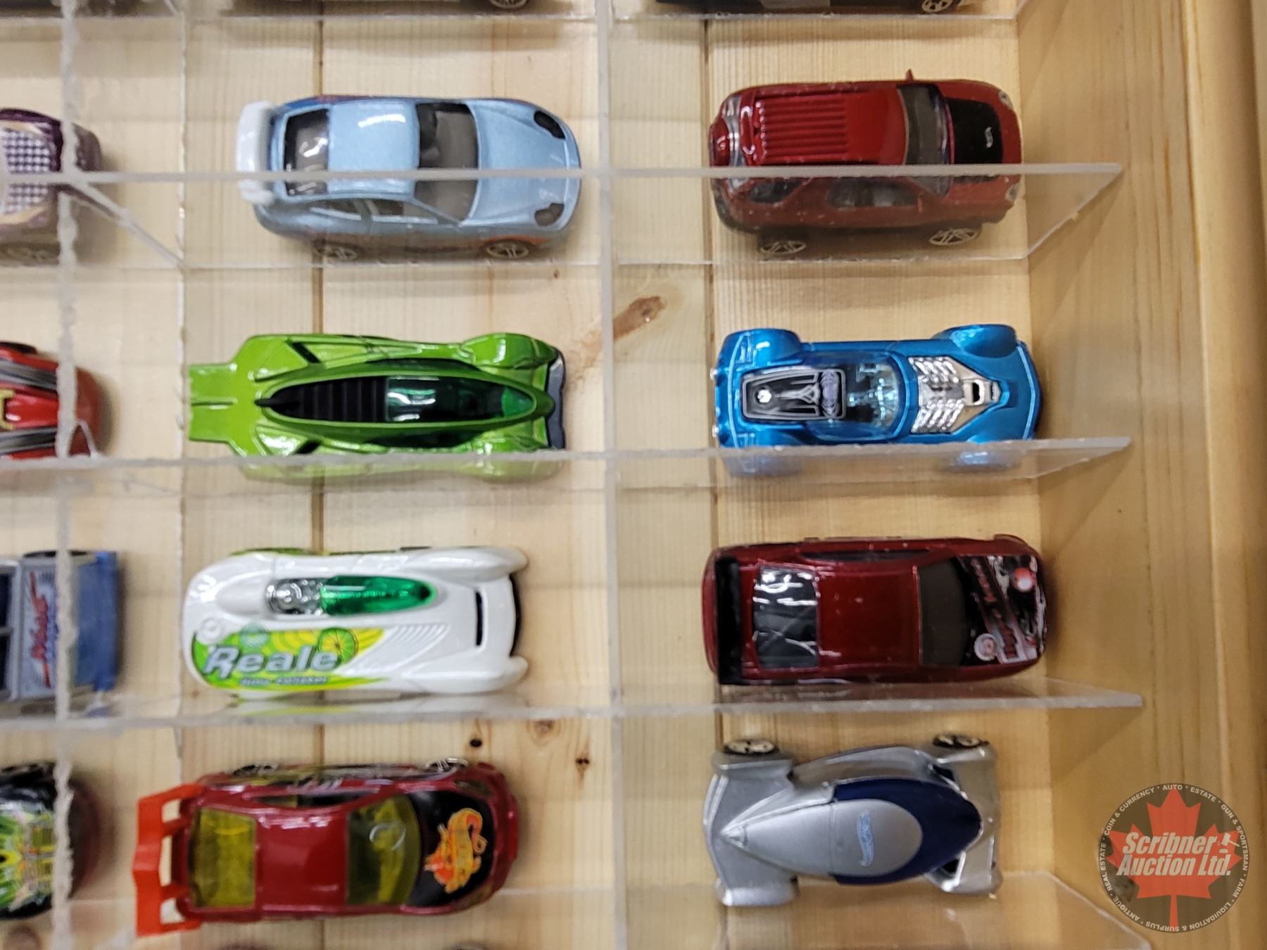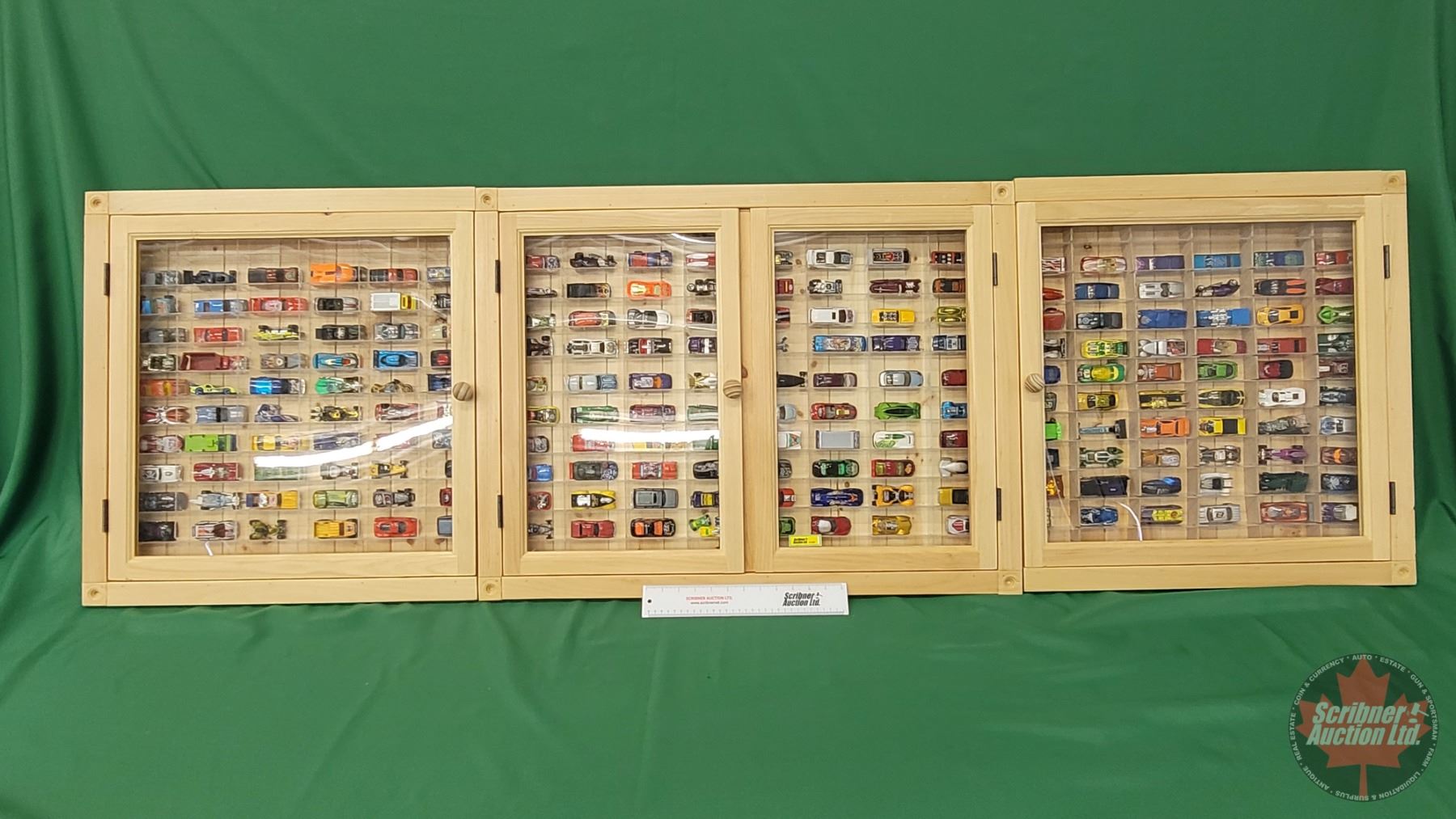 (3) Piece Display Cabinet (w/Plexi-Glass & Wood Doors) c/w (200) Hot Wheels (Total Outside Measures 25-1/2"H x 81-3/4"W x 2-1/2"D)