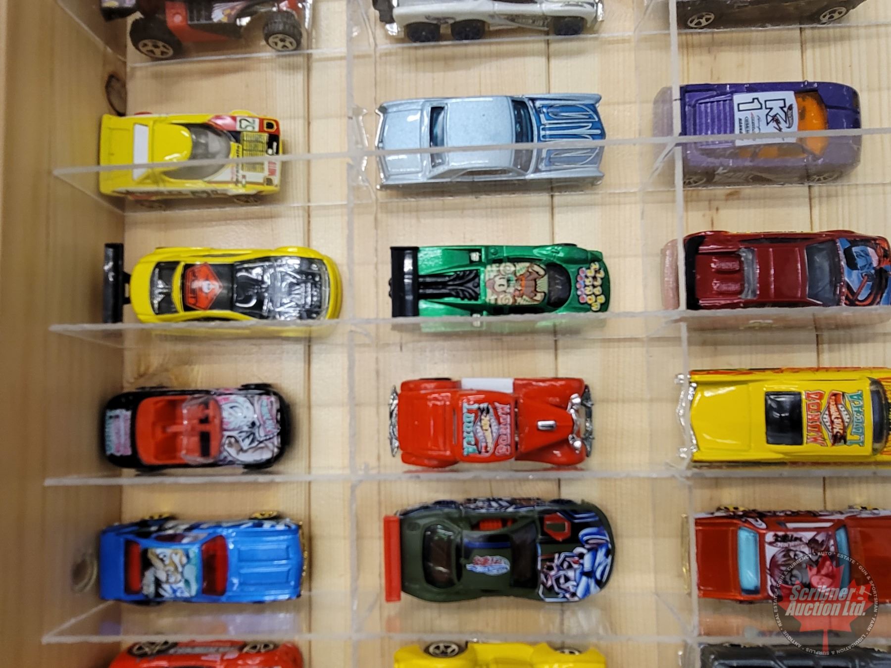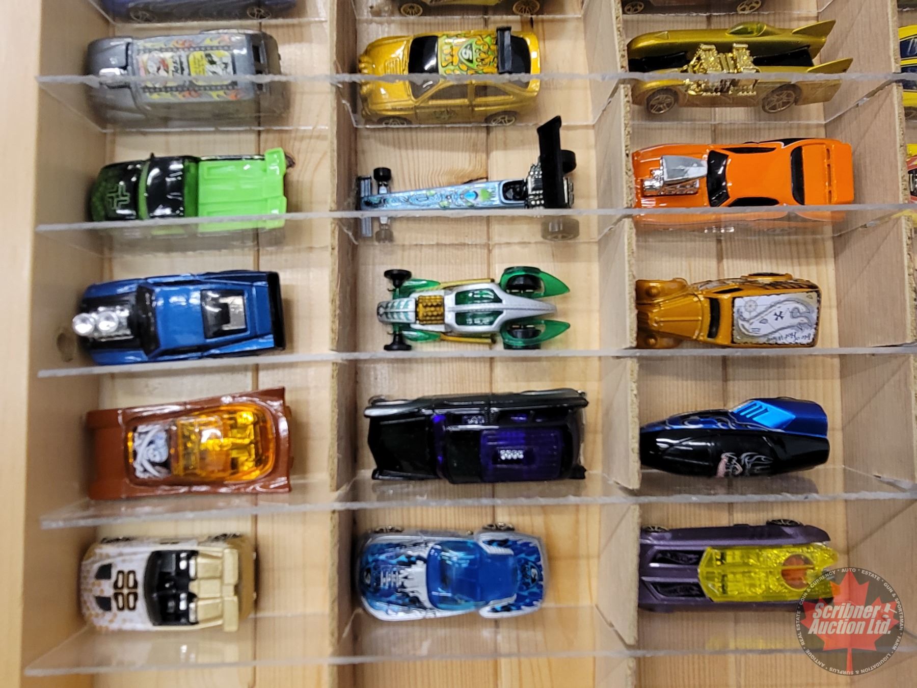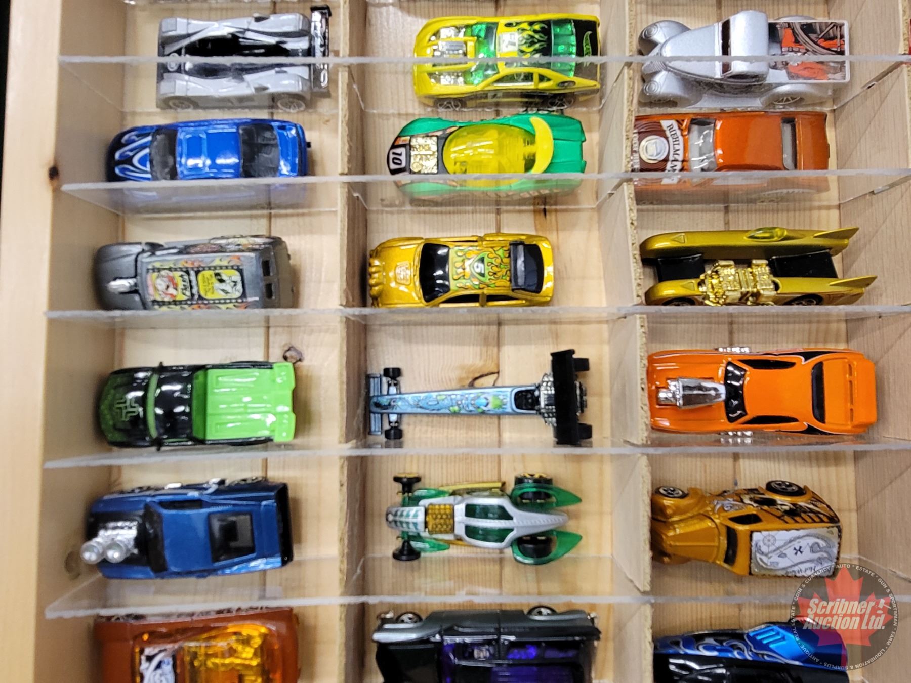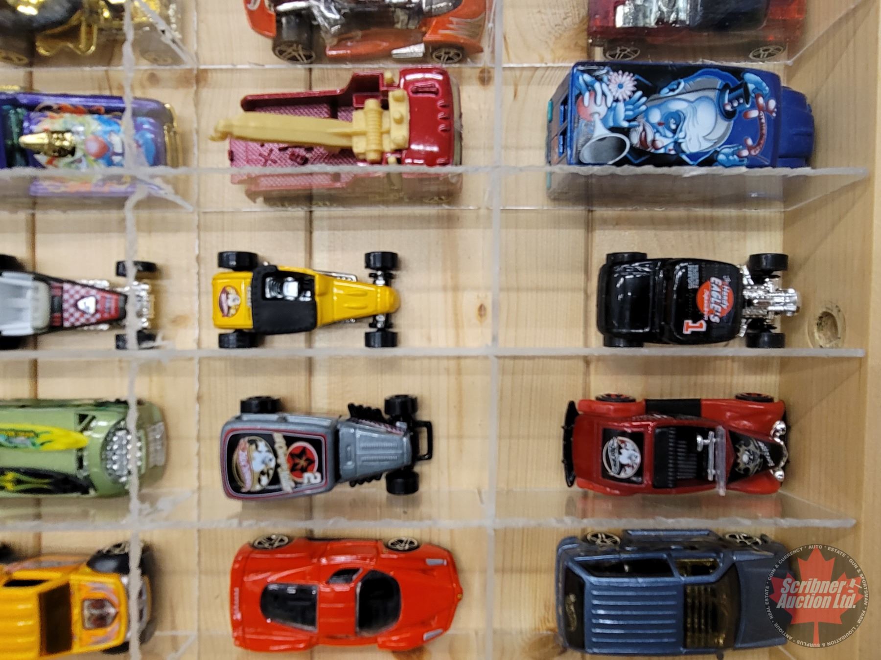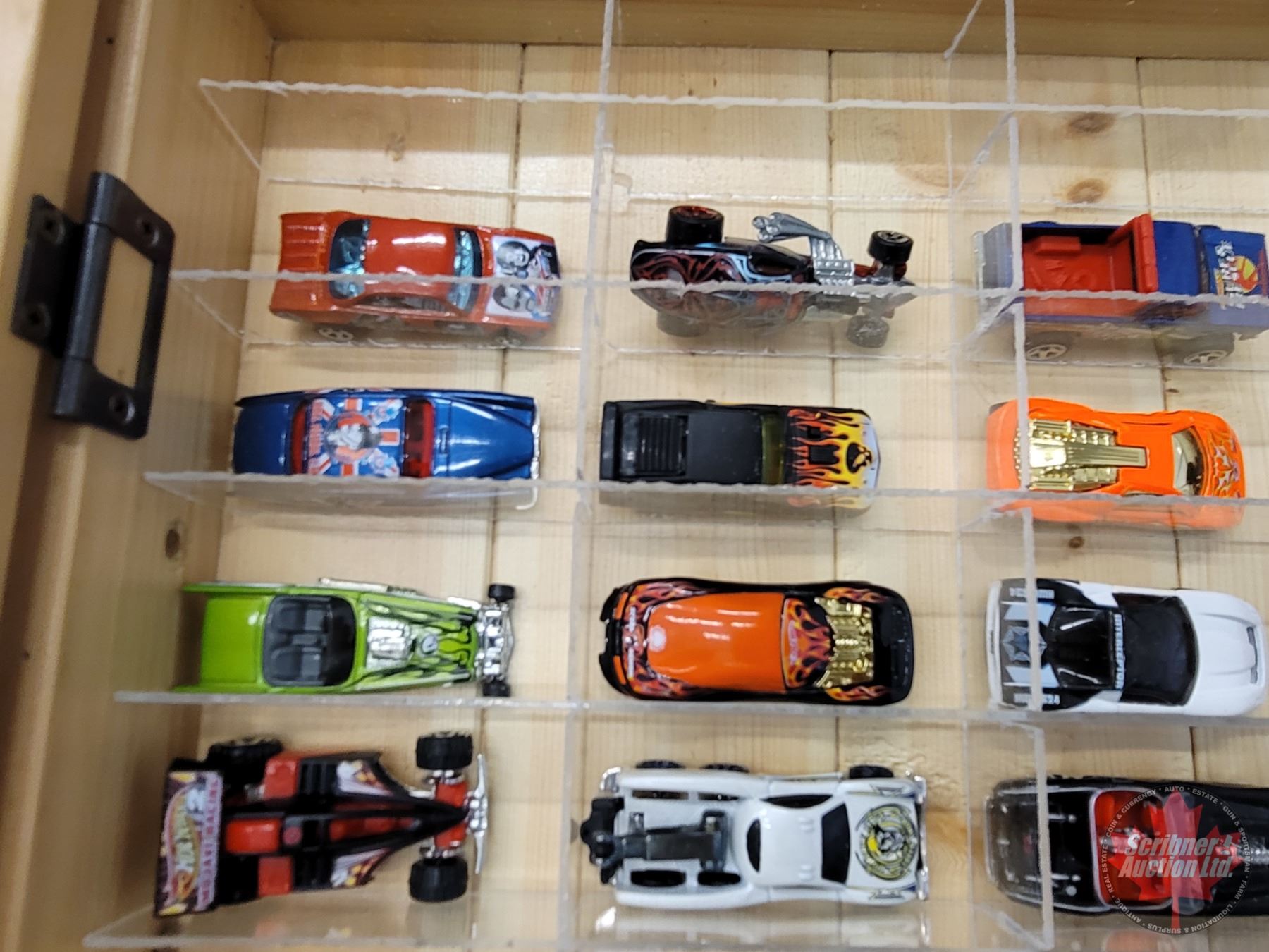 (3) Piece Display Cabinet (w/Plexi-Glass & Wood Doors) c/w (200) Hot Wheels (Total Outside Measures 25-1/2"H x 81-3/4"W x 2-1/2"D)