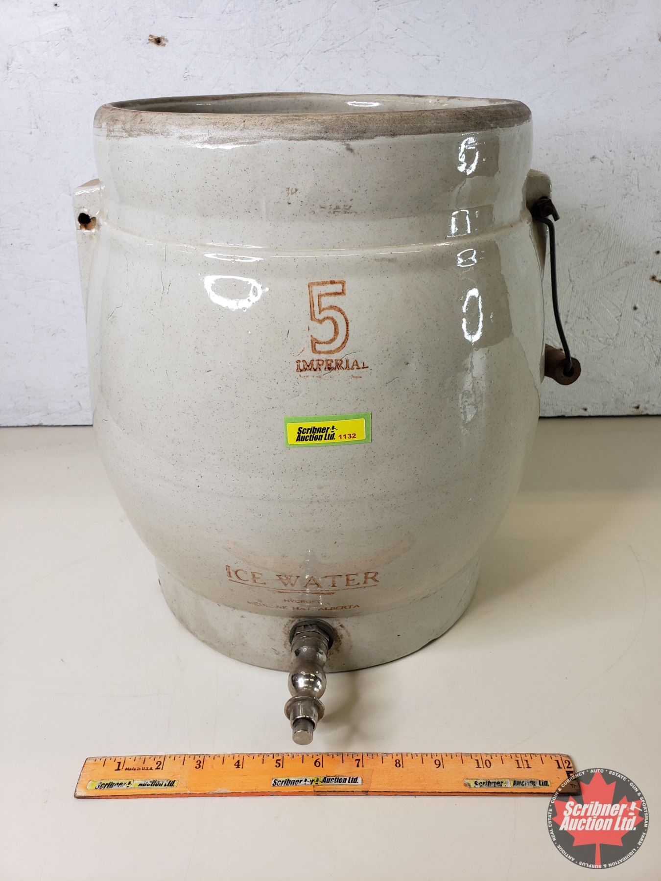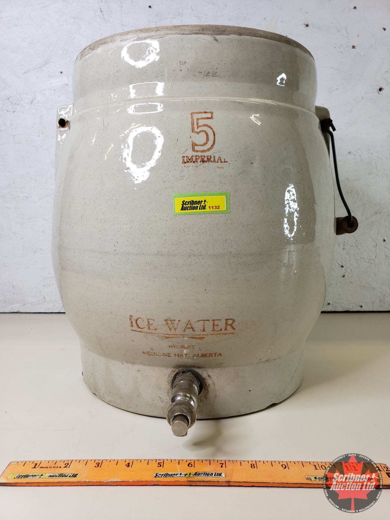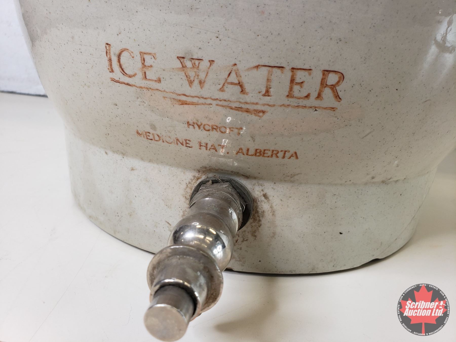 5gal Imperial ICE WATER Crock "Hycroft Medicine Hat, Alberta" (Note: Missing Handle / No Lid / Crock has hairline crack inside bottom) (15"H) (SEE PICS!)