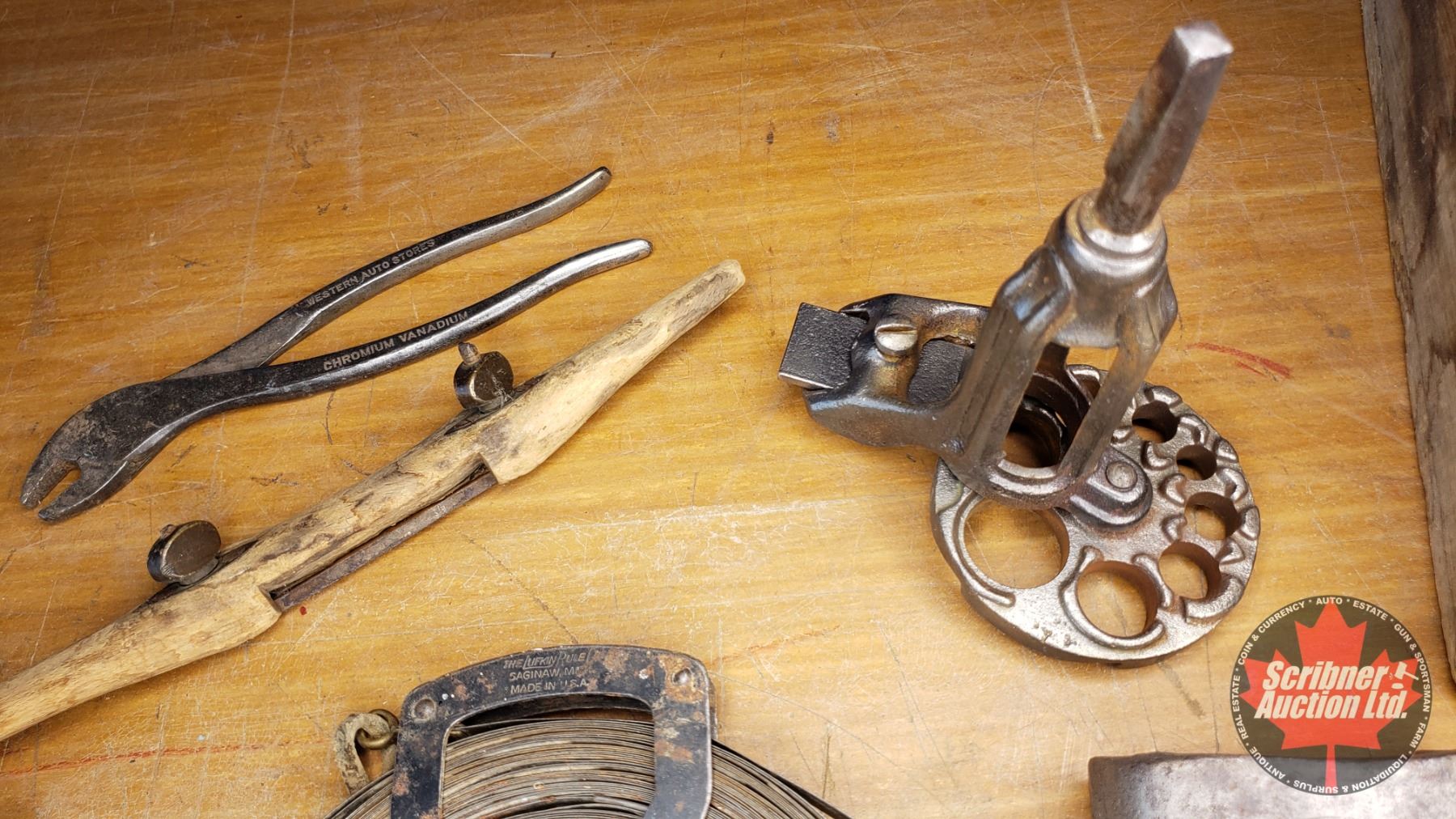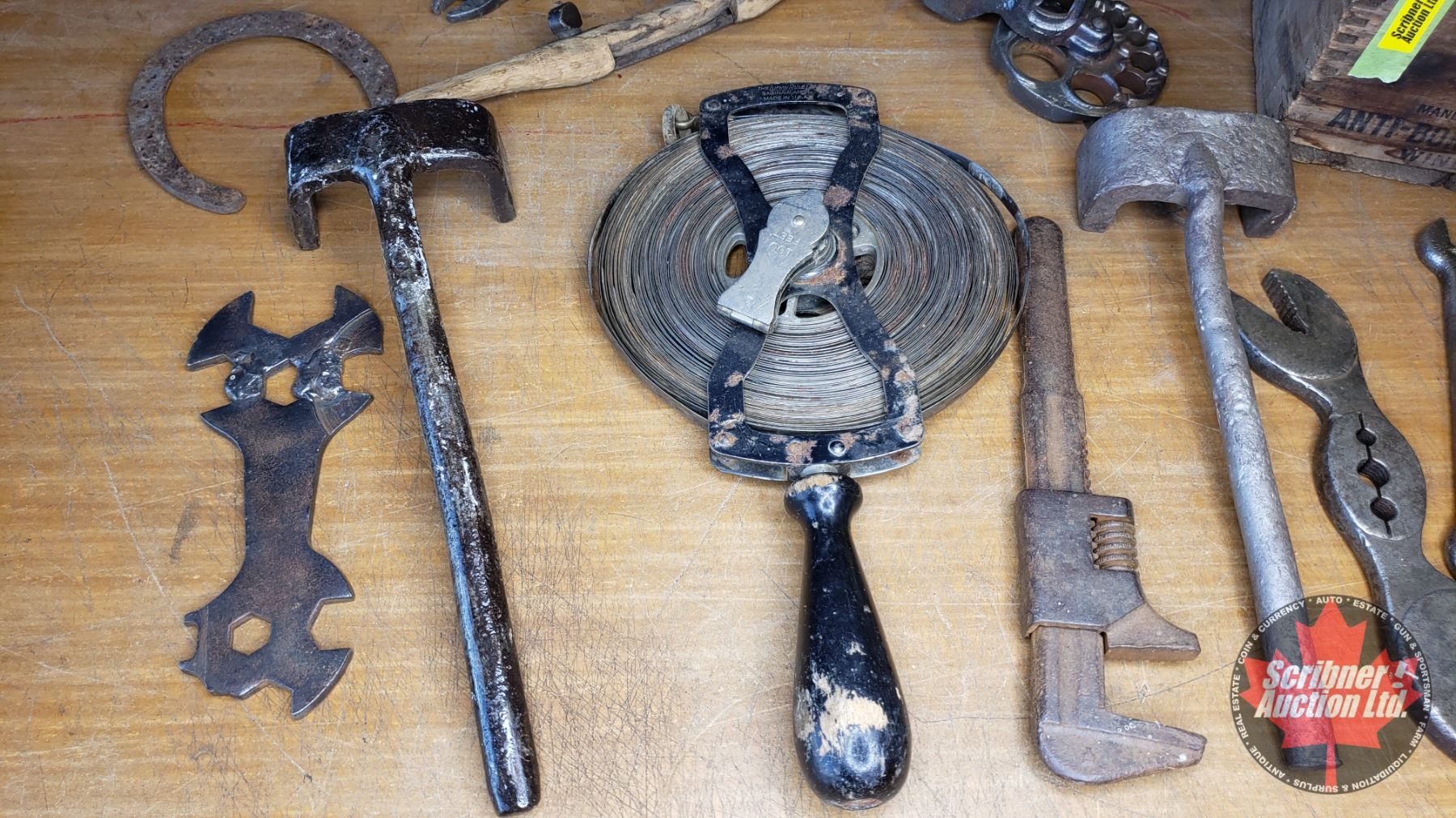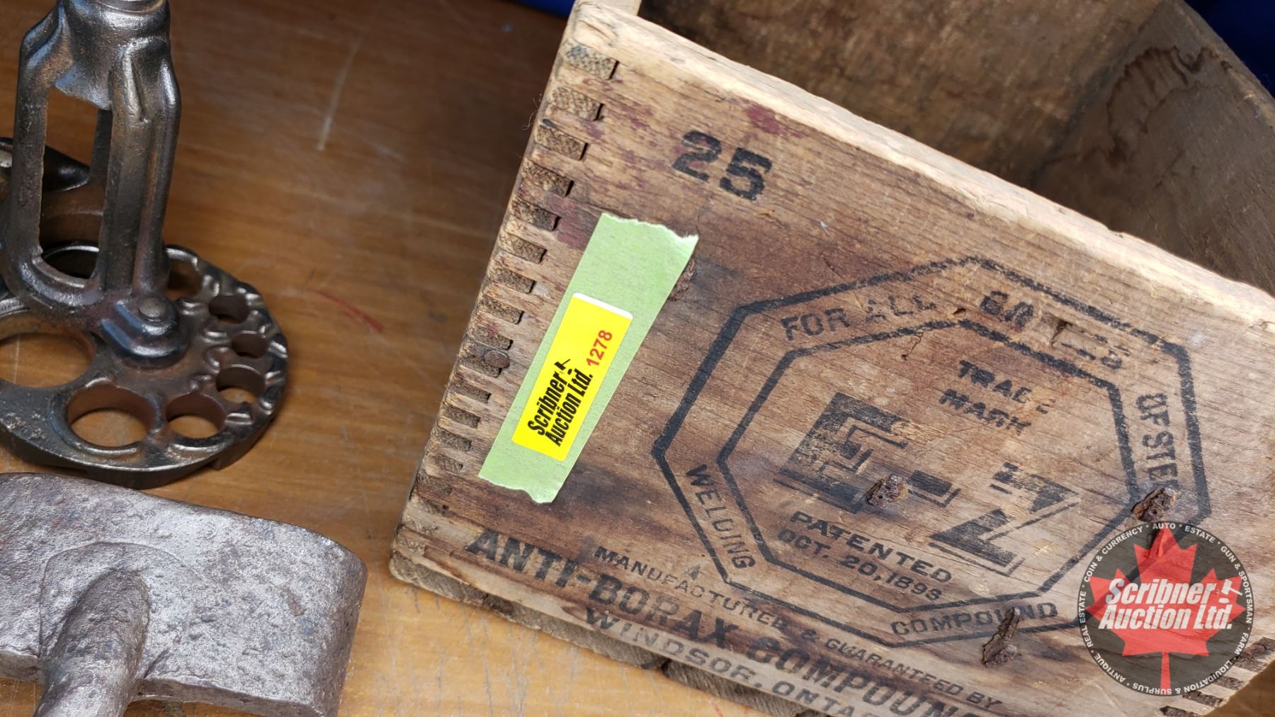 "Anti-Borax Compound Co" Wood Box Lot: Wagon Wheel Wrenches, 100ft Metal Measuring Tape, Wrenches, Stearns Hollow Auger Tenon Buggy Spoke Cutter, etc (See Pics)