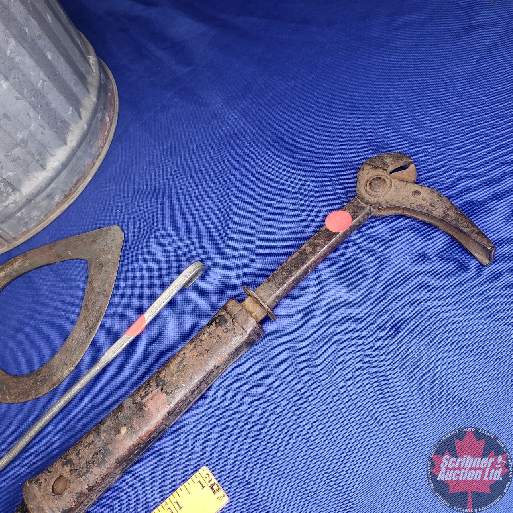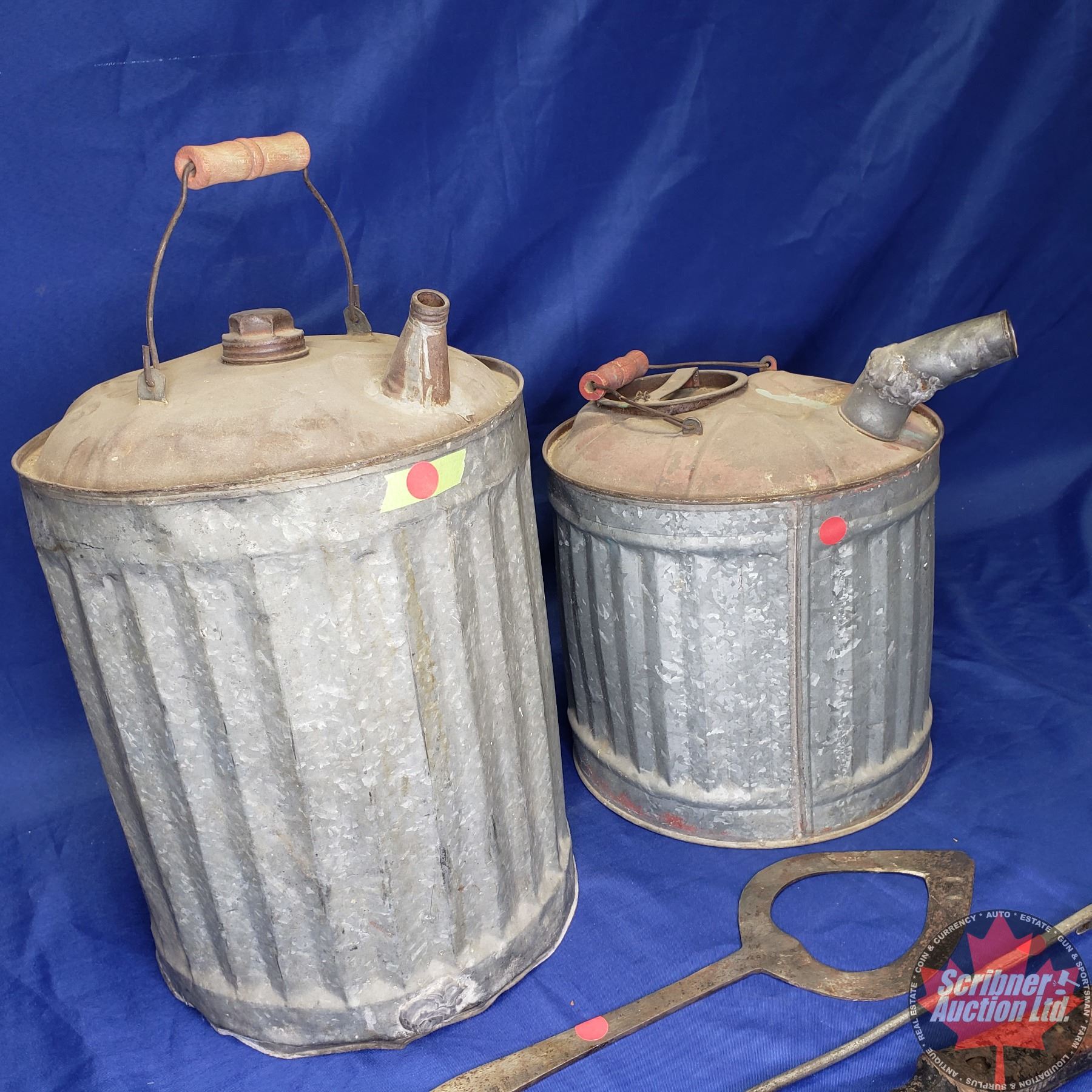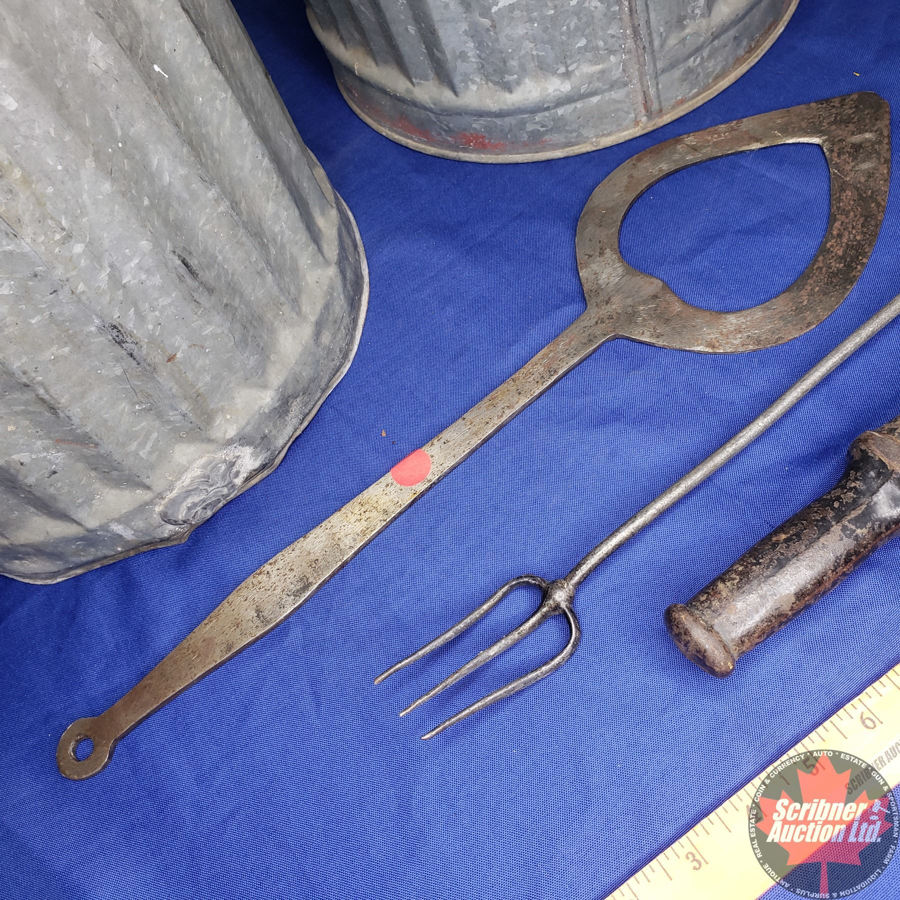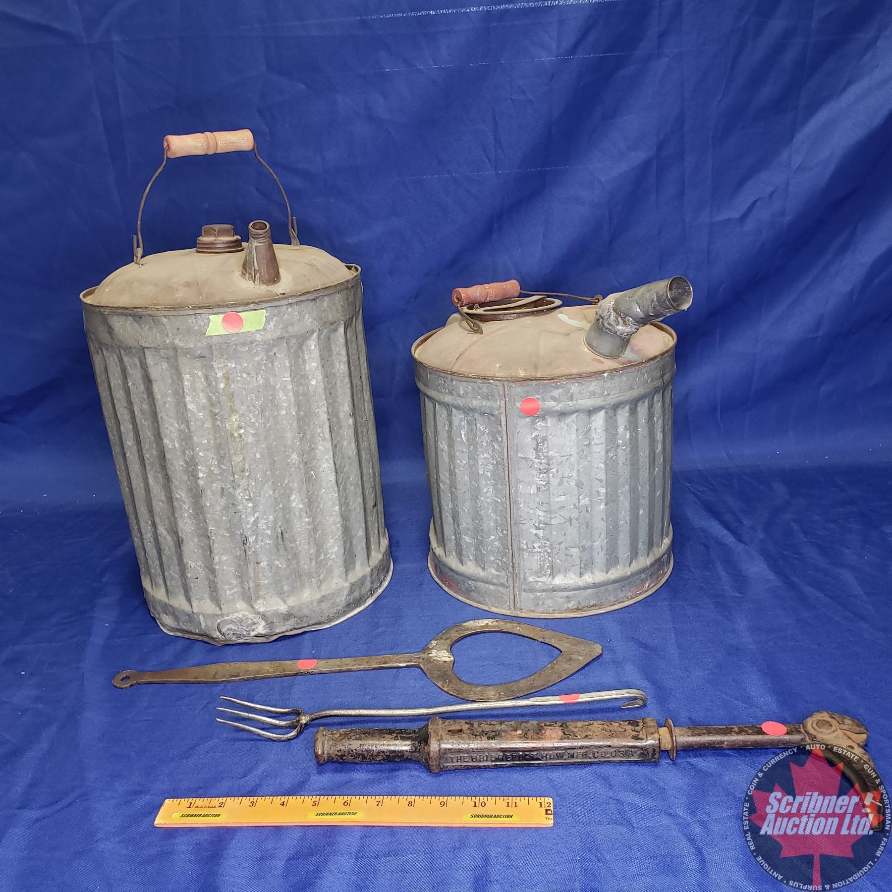 Antique Combo: 2 Galvanized Fuel Cans, Rug Beater, Meat Fork & Nail Puller (See Pics!)