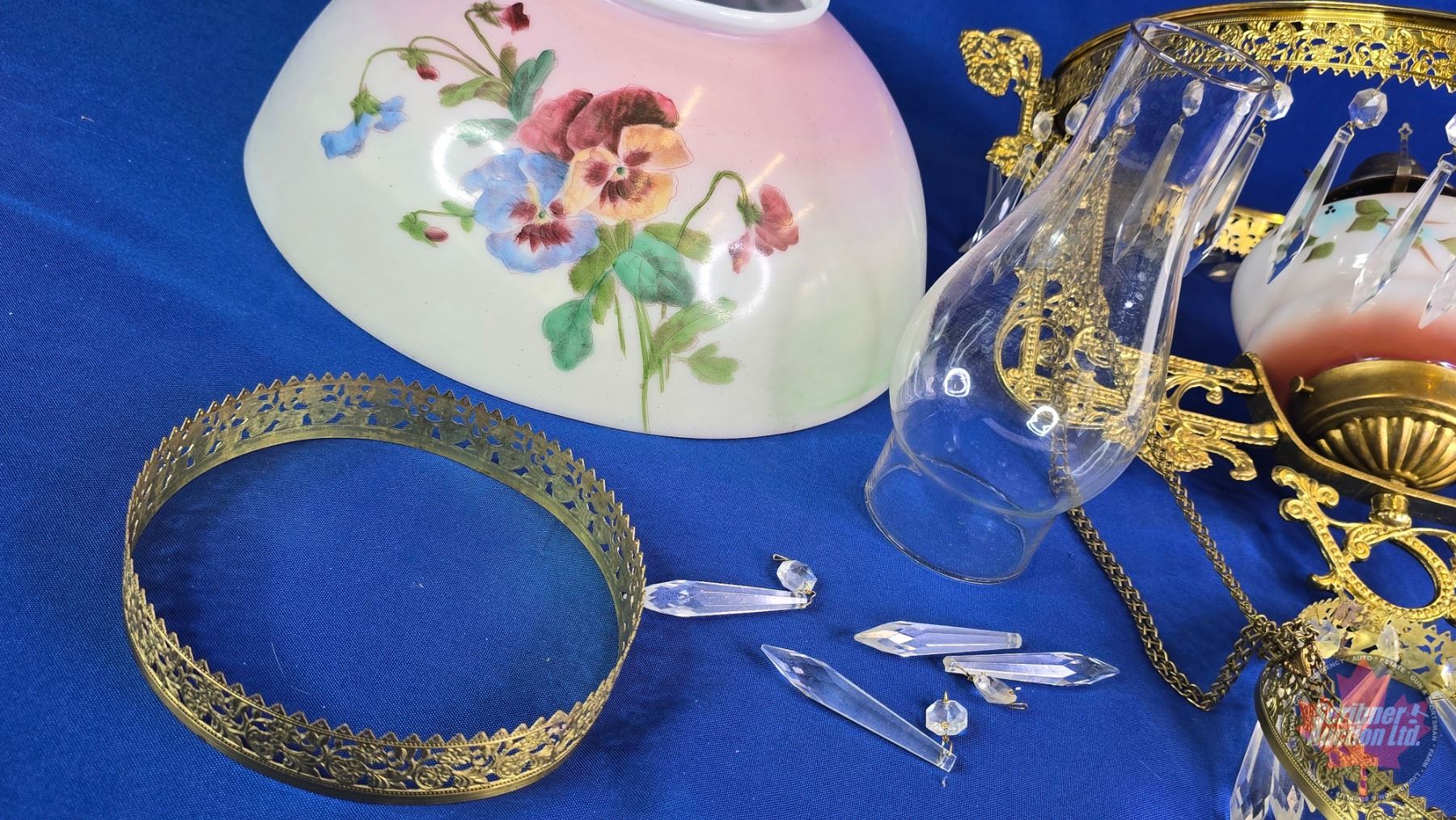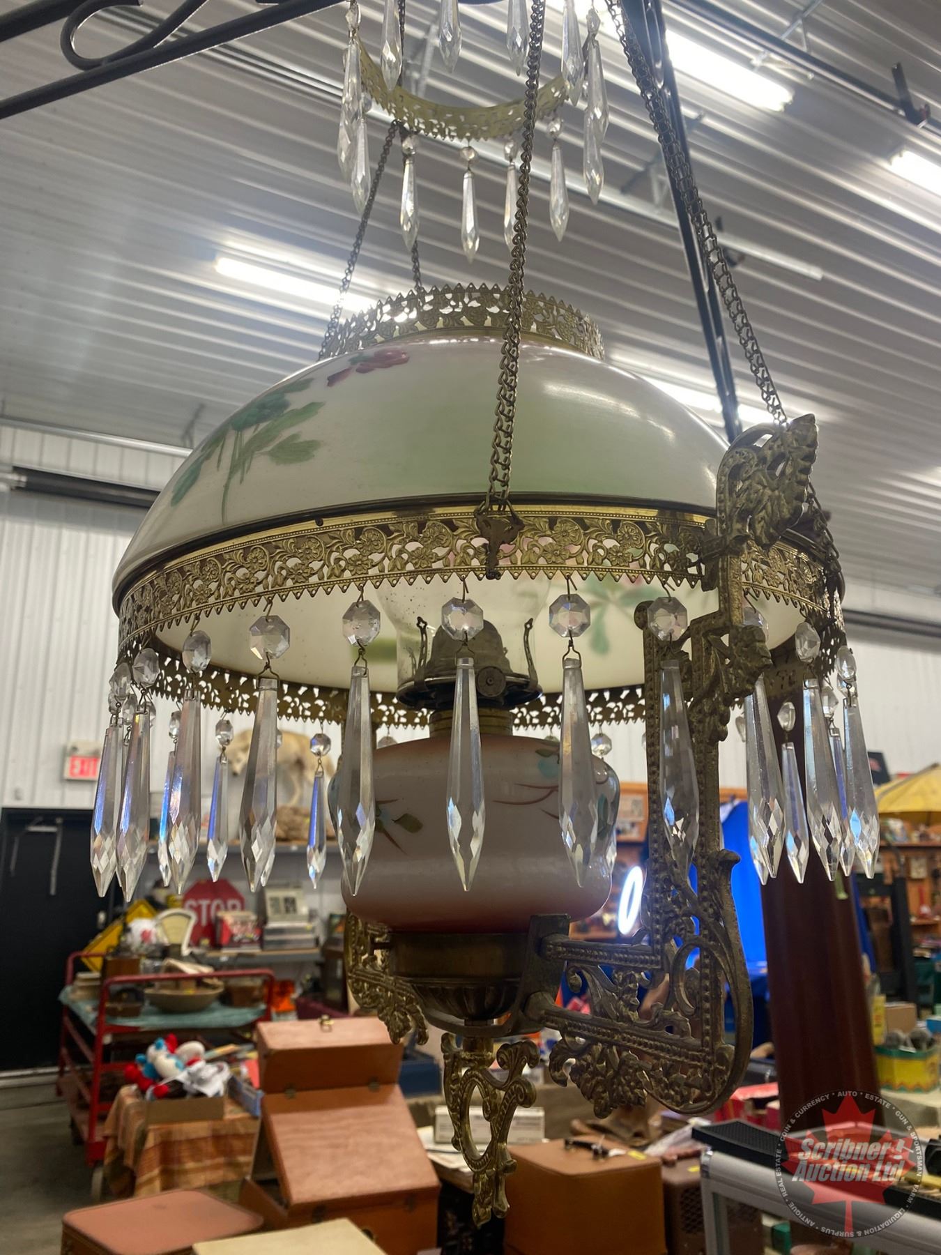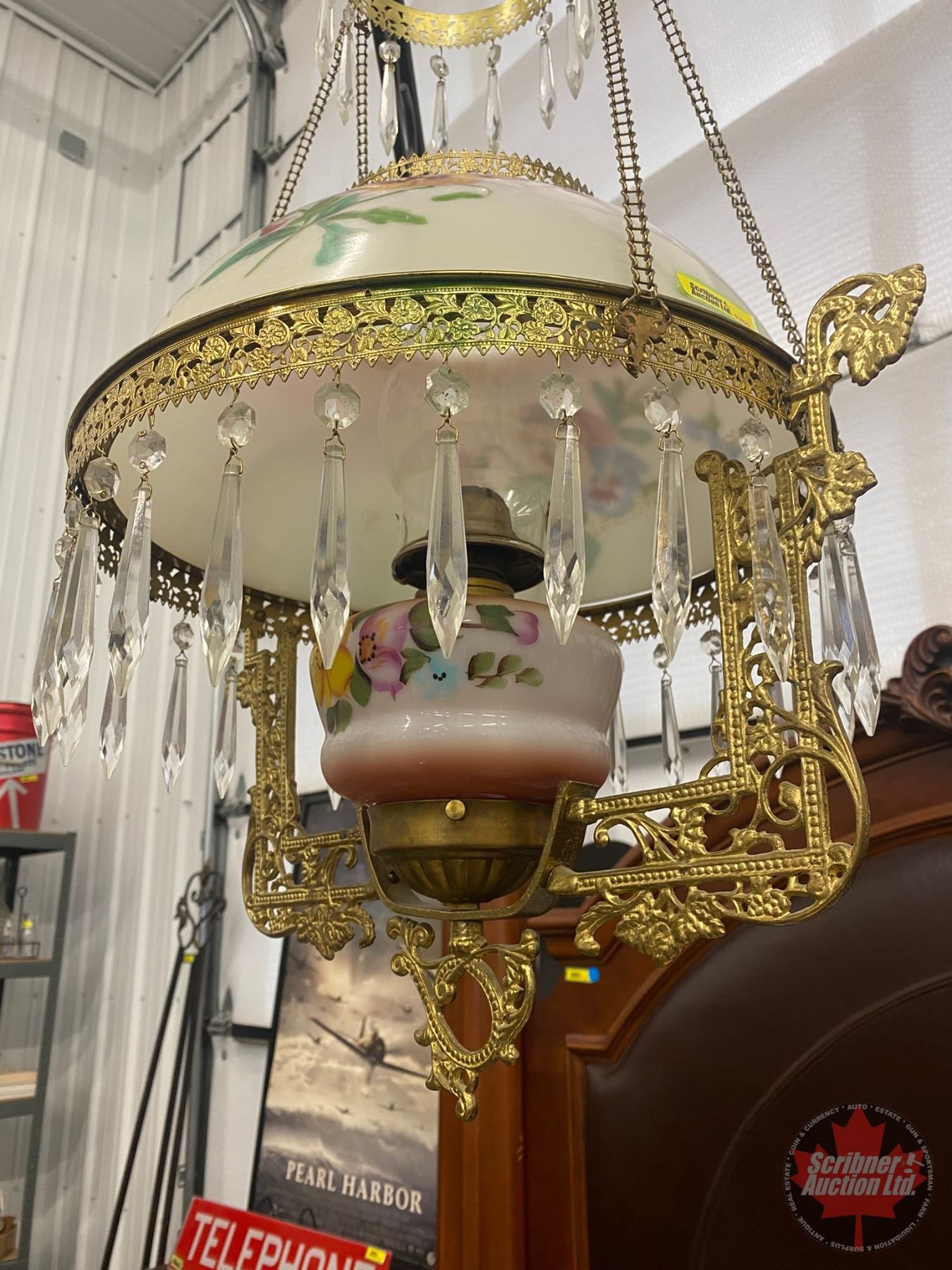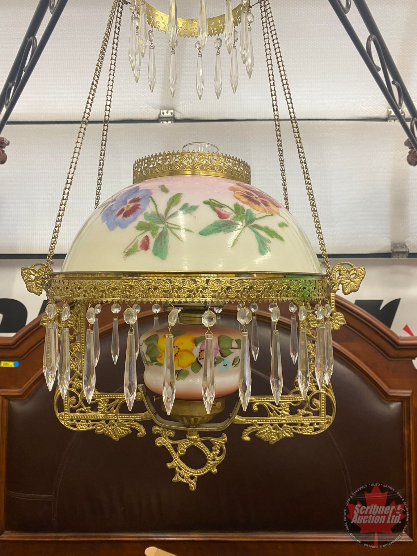Antique Hanging Kero Lamp : Floral Glass Shade (Shade 14"Dia) (White Flame Burner) (SEE PICS!)