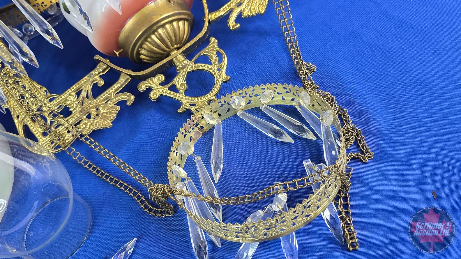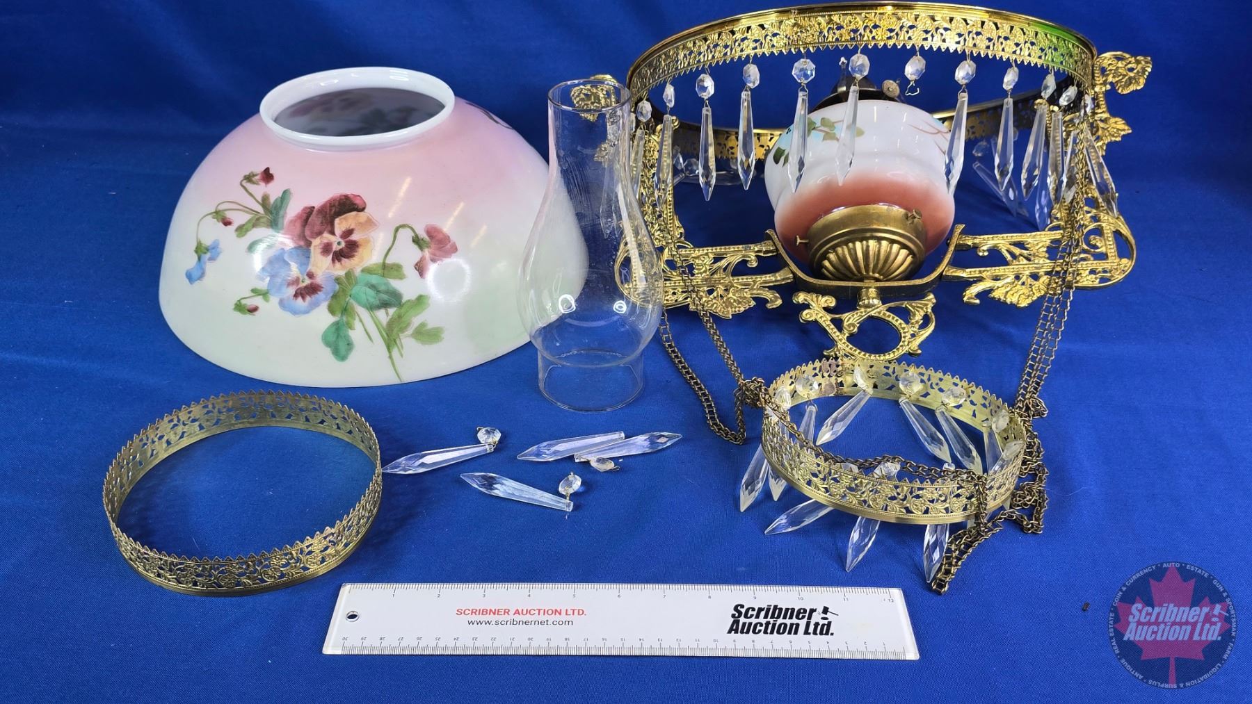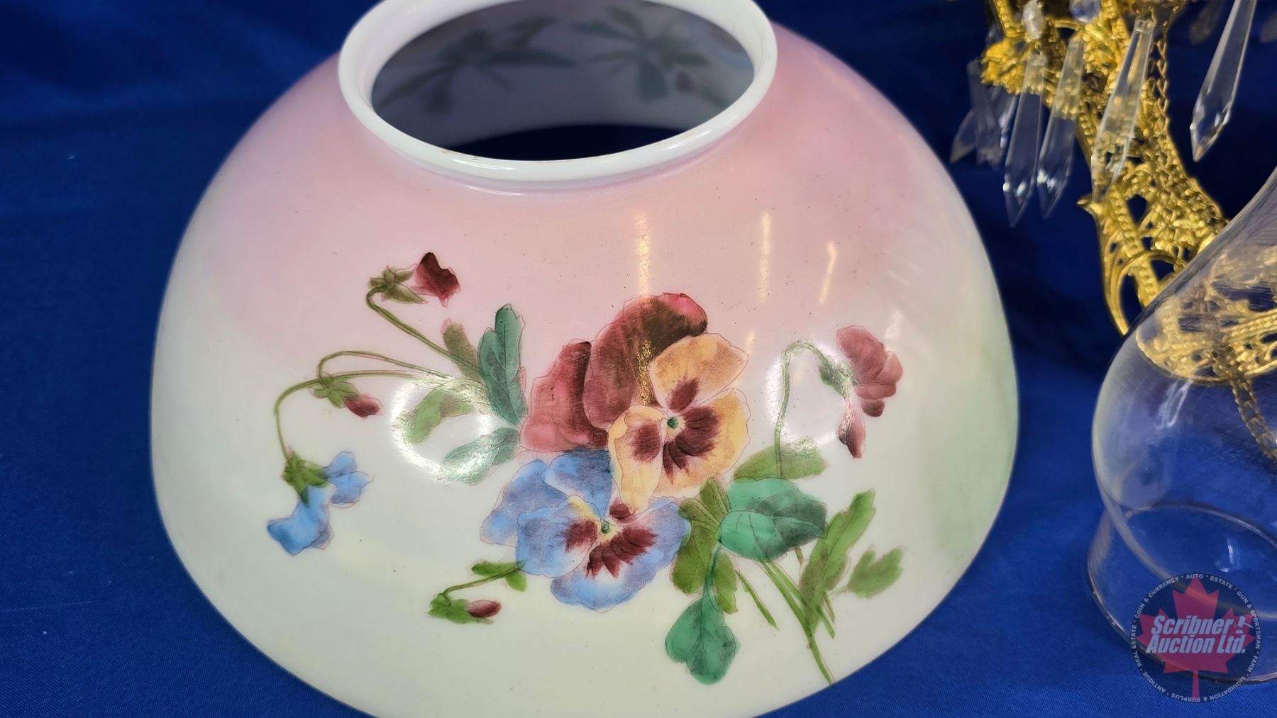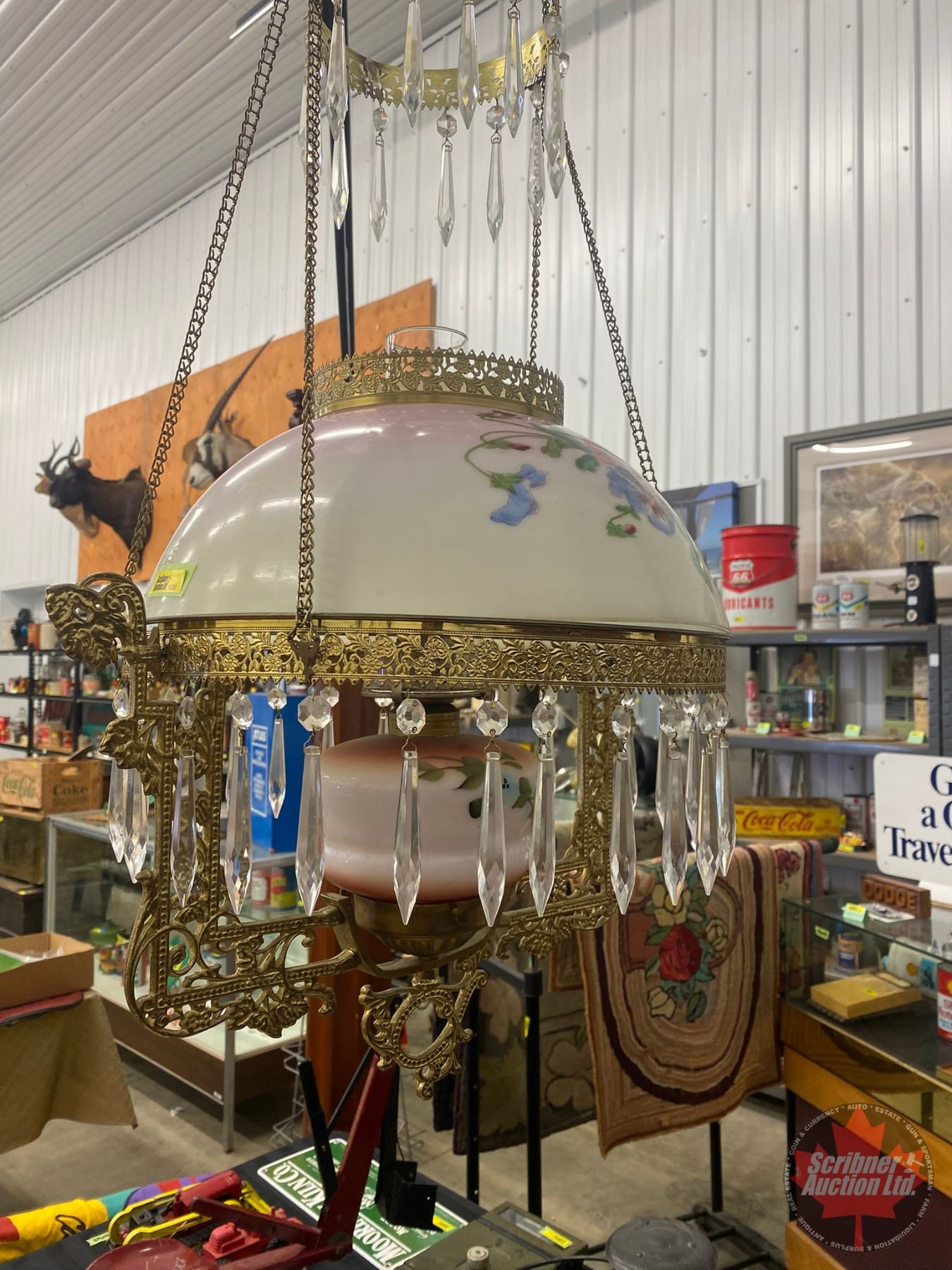 Antique Hanging Kero Lamp : Floral Glass Shade (Shade 14"Dia) (White Flame Burner) (SEE PICS!)