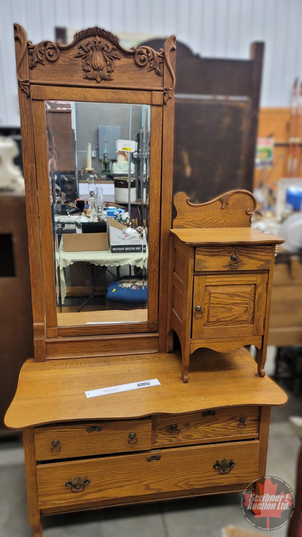 Antique Oak Commode Dresser (3 Drawer w/Beveled Mirror) (80"H x 43-1/4"W x 21-1/2"D)