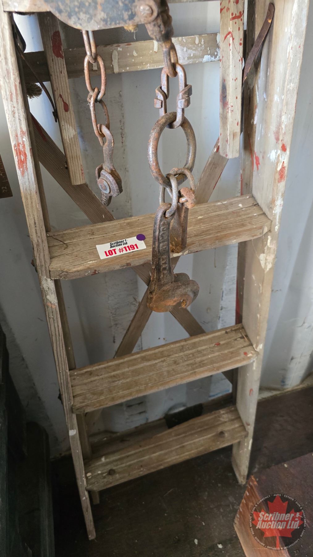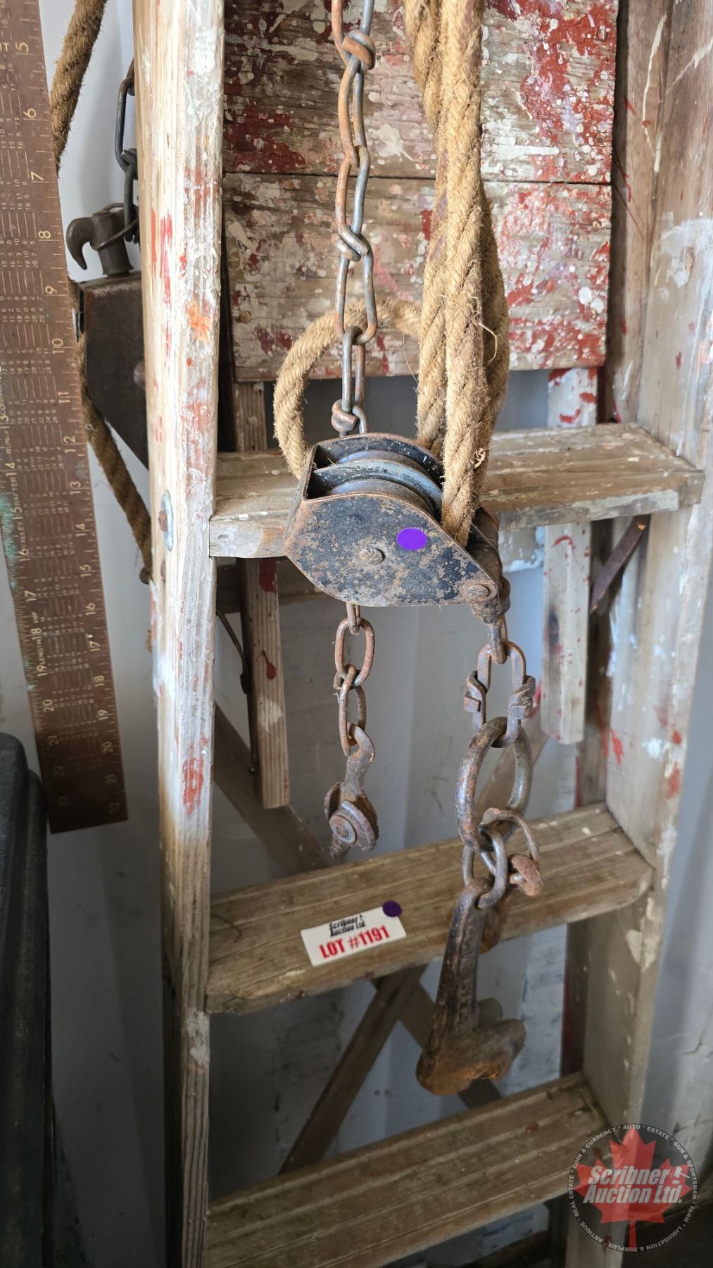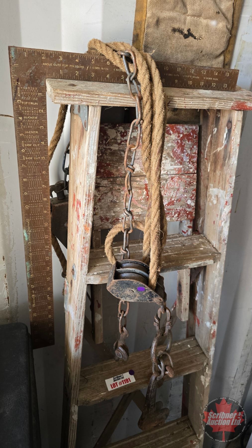 Antique Tool Trio : Wooden Step Ladder (5ft), Black and Tackle & Framing Square