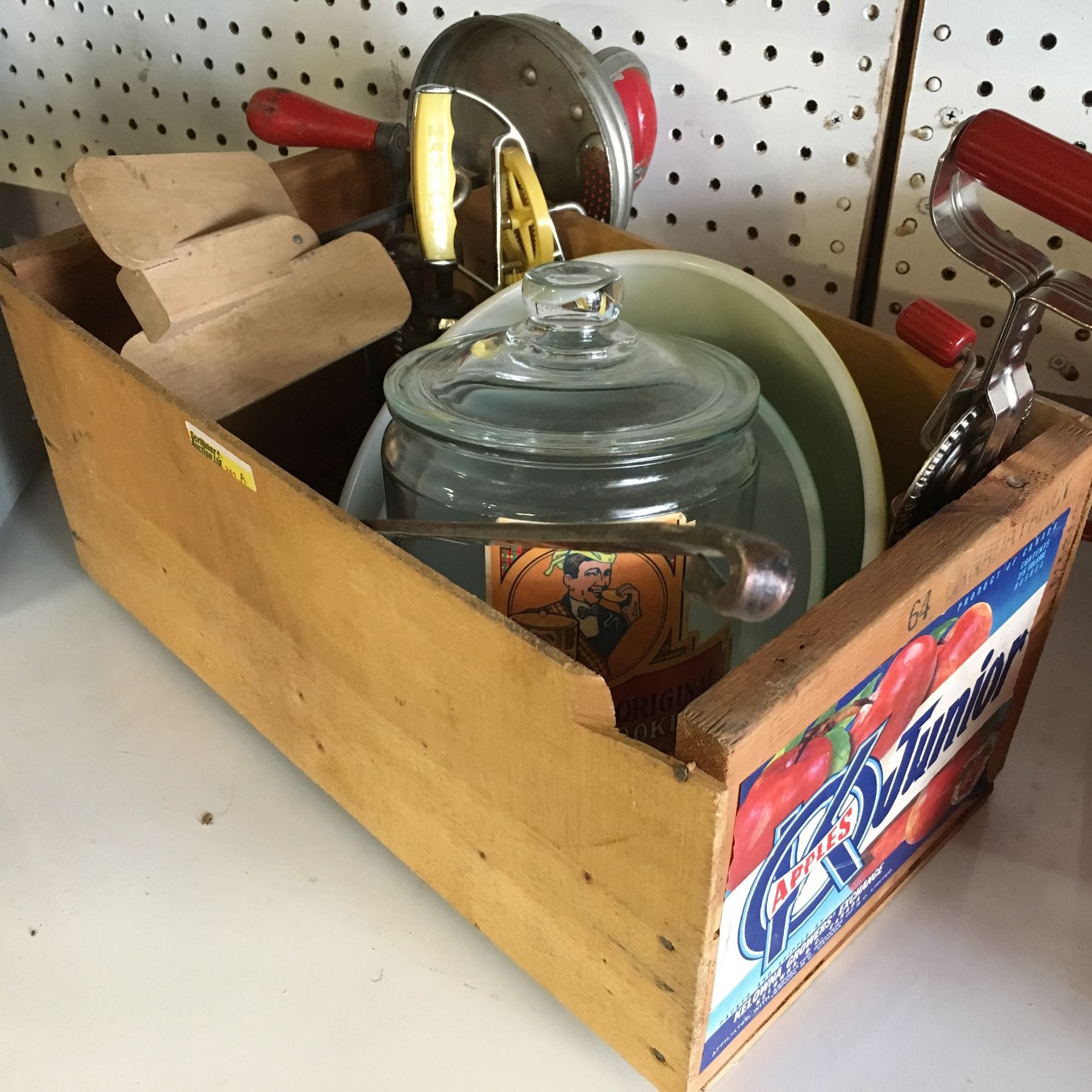 Apple Crate w/Vintage Kitchen Grouping (Pyrex Bowls, Churn Lid, Meat Grinder, Egg Beaters, Dad's Cookie Jar, etc)