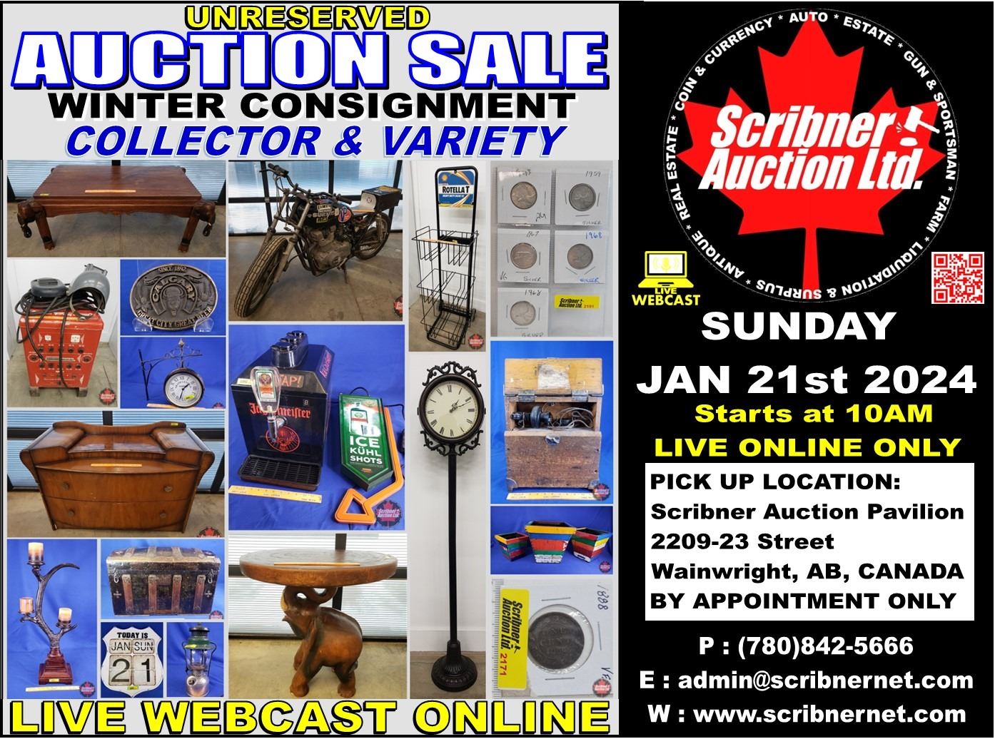After an item has been sold, that item is the sole responsibility of the purchaser. All merchandise is sold AS IS/WHERE IS. No Guarantees or Warranties Given or Implied. Scribner Auction is not responsible for missing parts. No bidder shall retract his/her bid. All sales are final. Open House Preview NOT Available for this Auction. Items are located at our Main Offices & Auction location (2209 - 23 Street, Wainwright, AB, Canada)