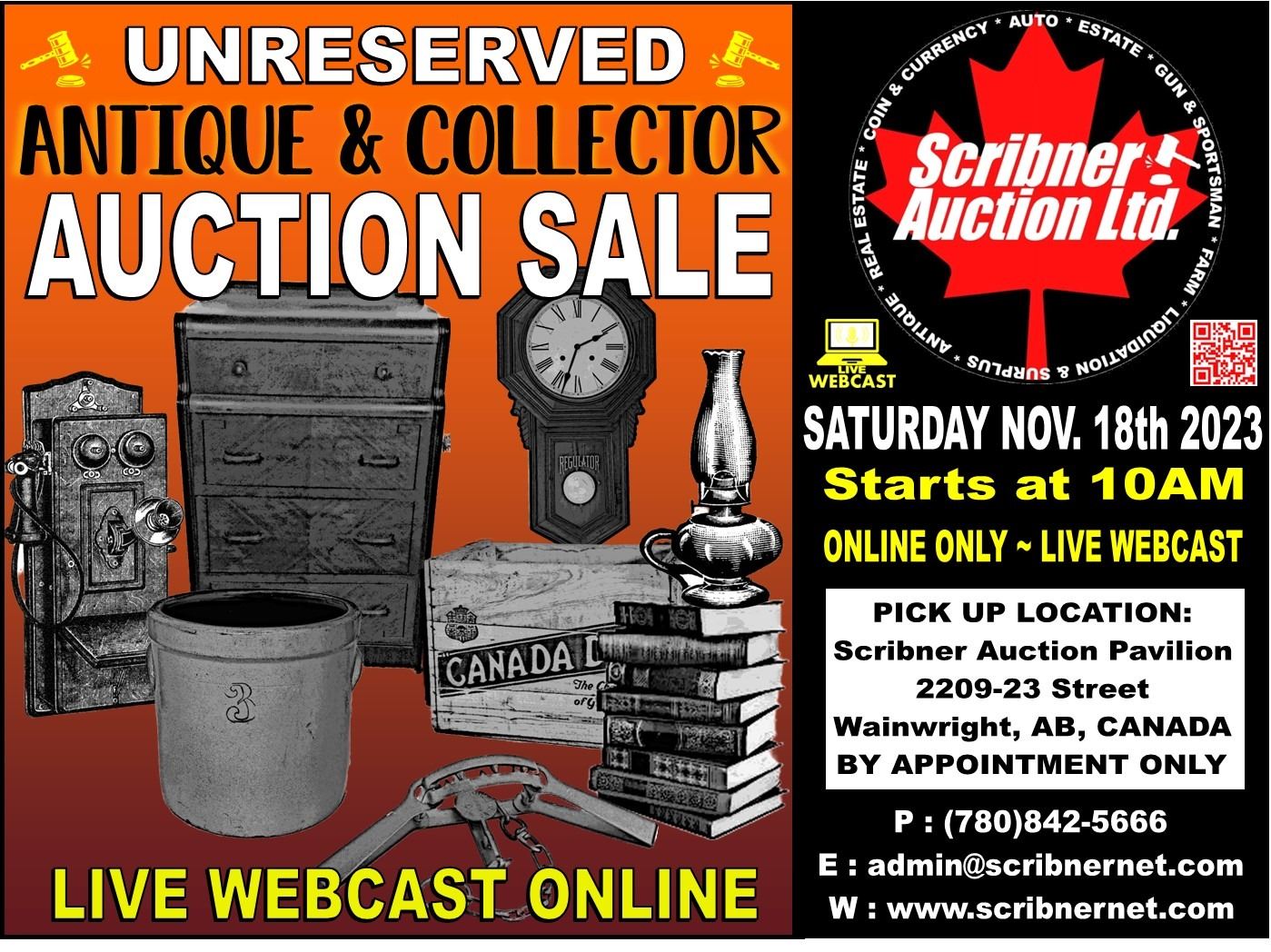 3. If you wish to pick up your items and pay with either Debit or Cash, this must be approved/arranged by Scribner Auction Ltd.