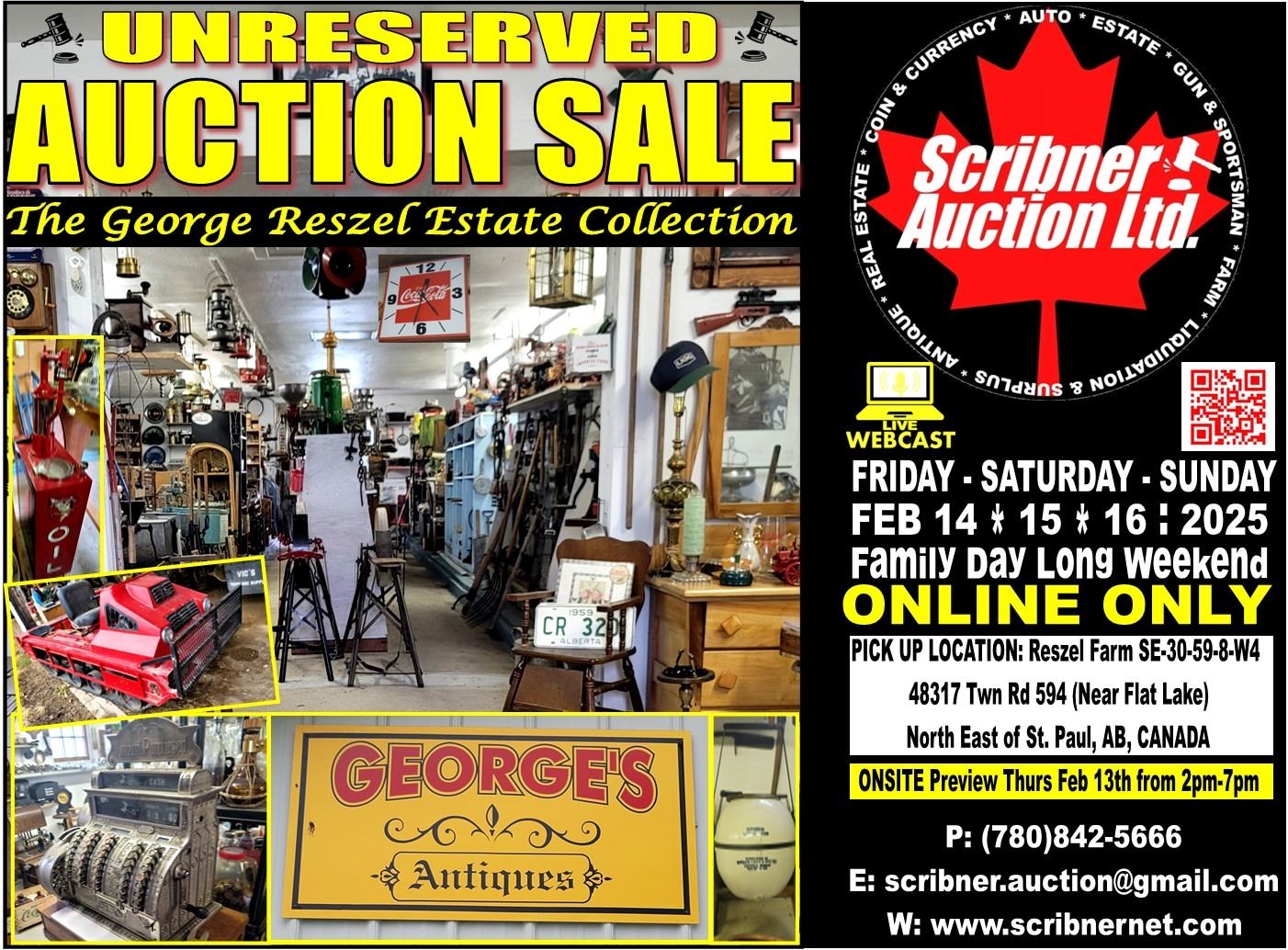 FRIDAY - SATURDAY - SUNDAY : Purchases will be packaged up after the auction and shipped via Canada Post or PUROLATOR (for dangerous goods) within 12-16 days of the auction sale. Please contact us via email (scribner.auction@gmail.com) or call 780-842-5666 prior to the auction if you wish to arrange alternate shipping. Shipping & Handling Charges will be charged to your credit card at the time of shipping. Most packages shipped via Canada Post come with $100 insurance. Please review Canada Post Terms & Conditions for Canada Post Insurance Policies. Scribner Auction Ltd. will not be responsible for any damage or breakage to any item for any reason (shipping, handling or otherwise).