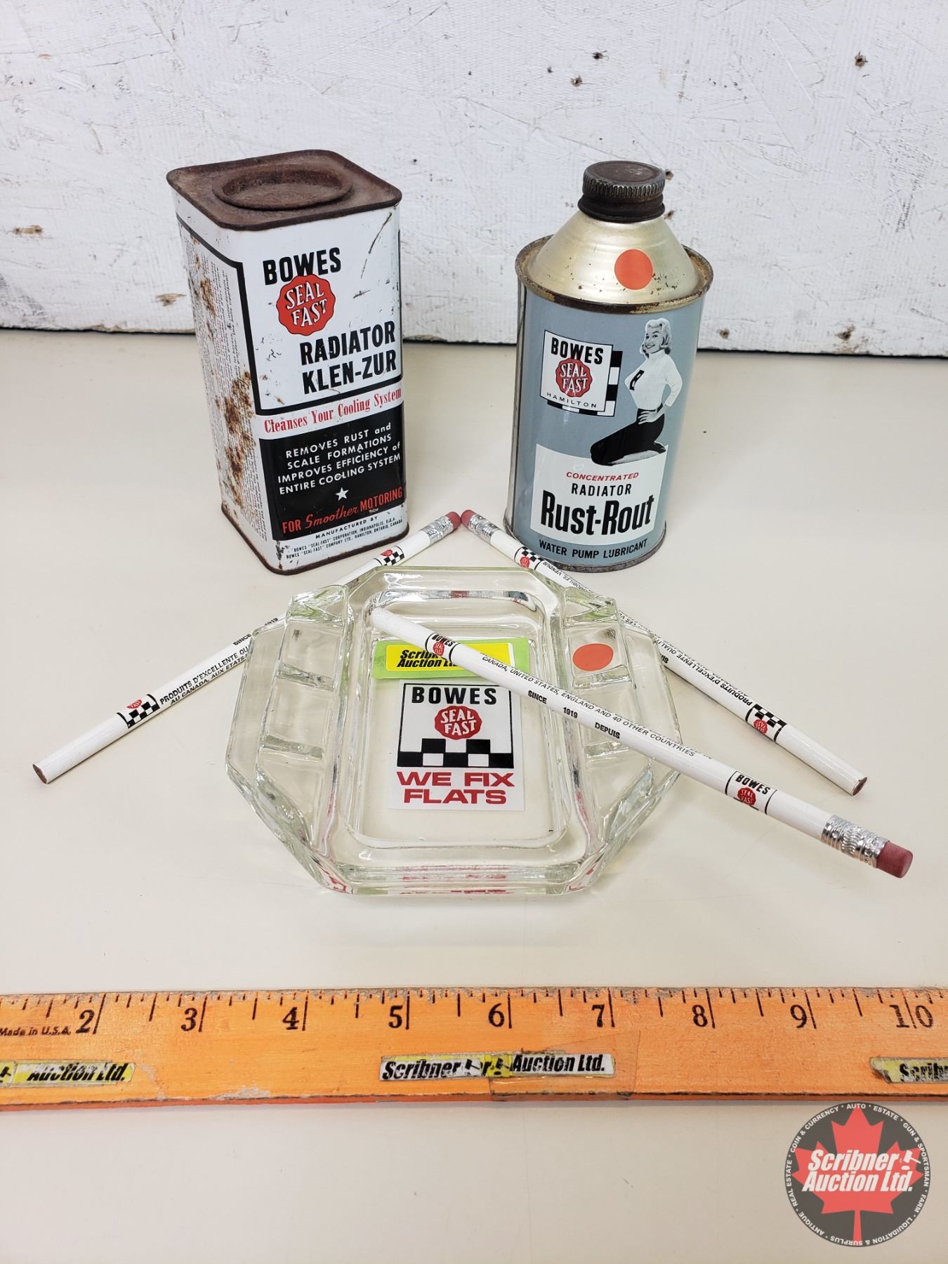 BOWES Combo Lot: - Ashtray - Pencils (3) - Radiator Rust-Rout Tin - Radiator KLEN-ZUR Tin (5-1/4"H)
