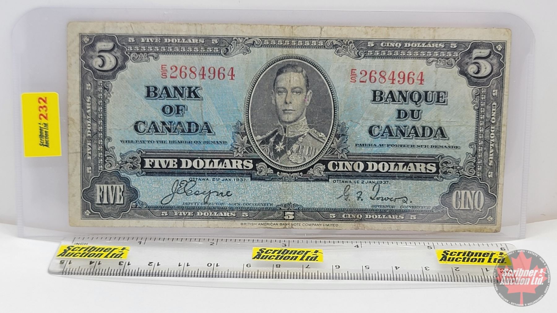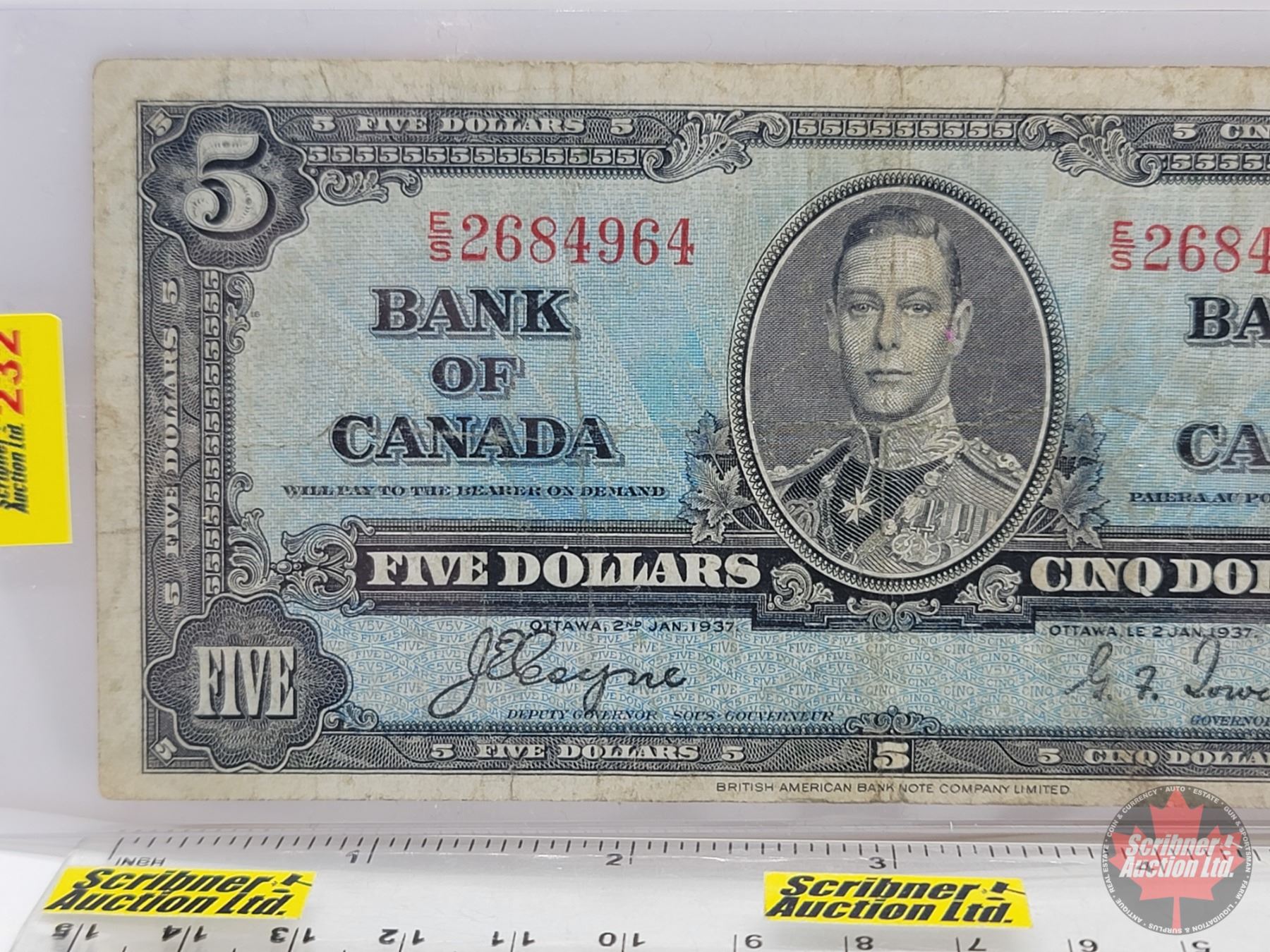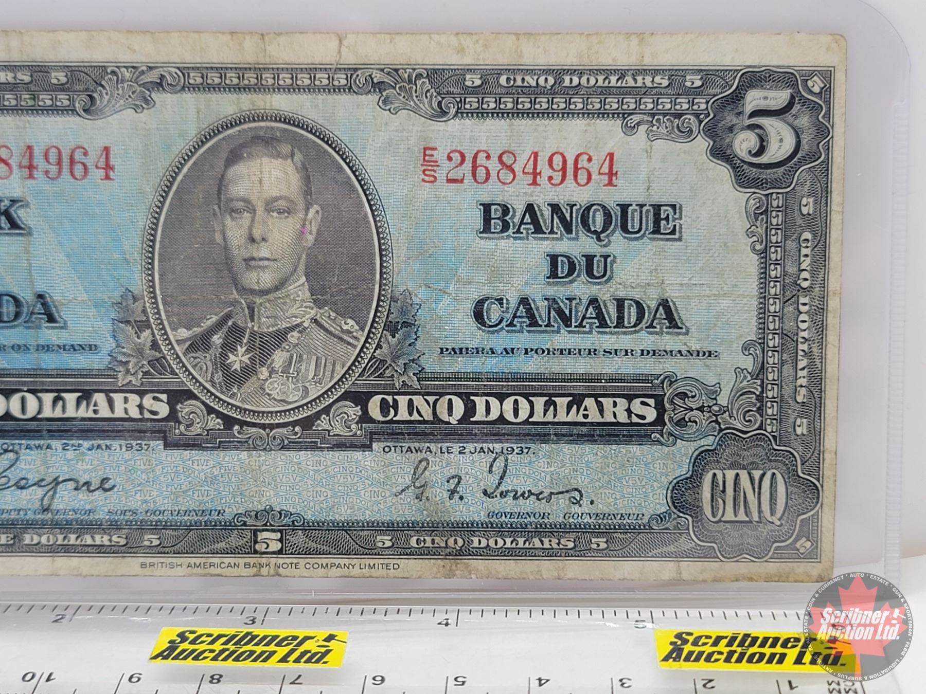 Bank of Canada $5 Bill 1937 : Coyne/Towers #ES2684964 (See Pics for Varieties, Conditions, Serial Nu