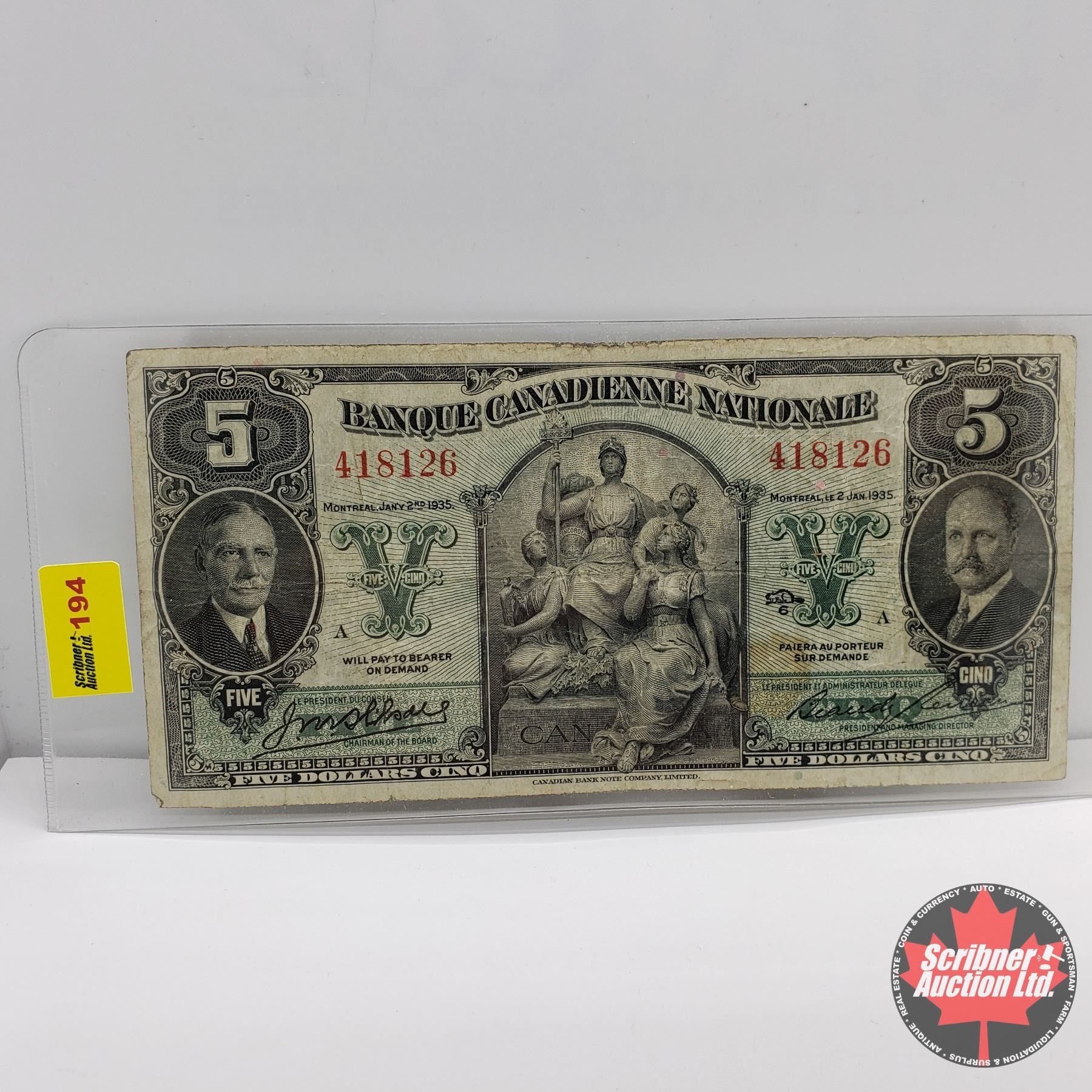 Banque Canadienne Nationale $5 Bill 1935 : S/N#418126