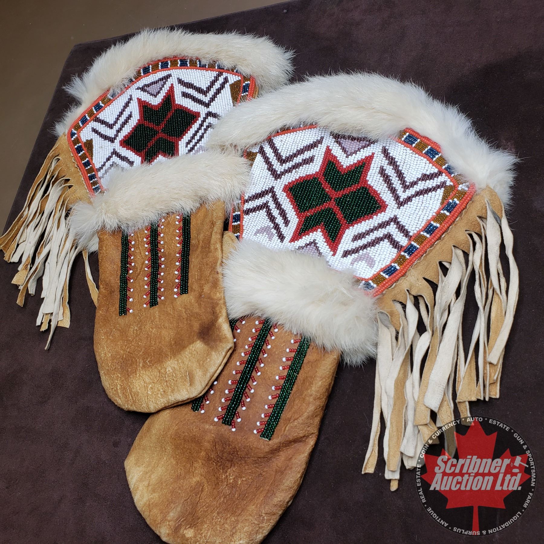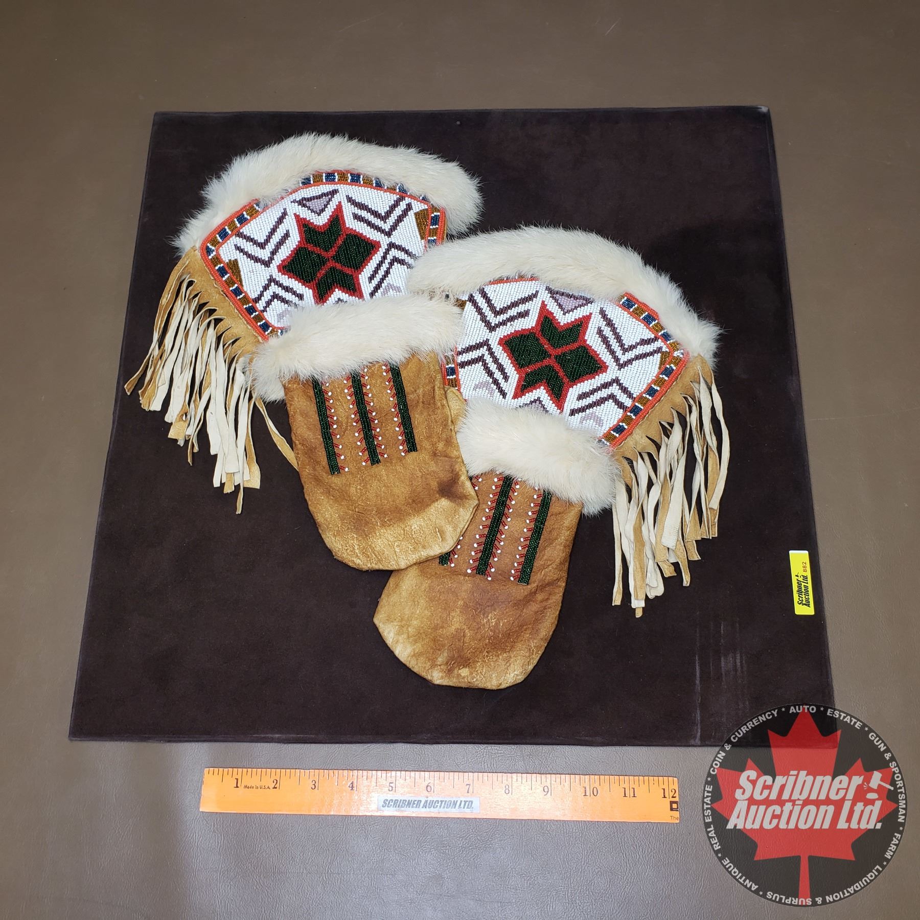 Beaded Leather Mittens - Fur Clad w/Fringe (Mounted on Board) (20"H x 20"W)