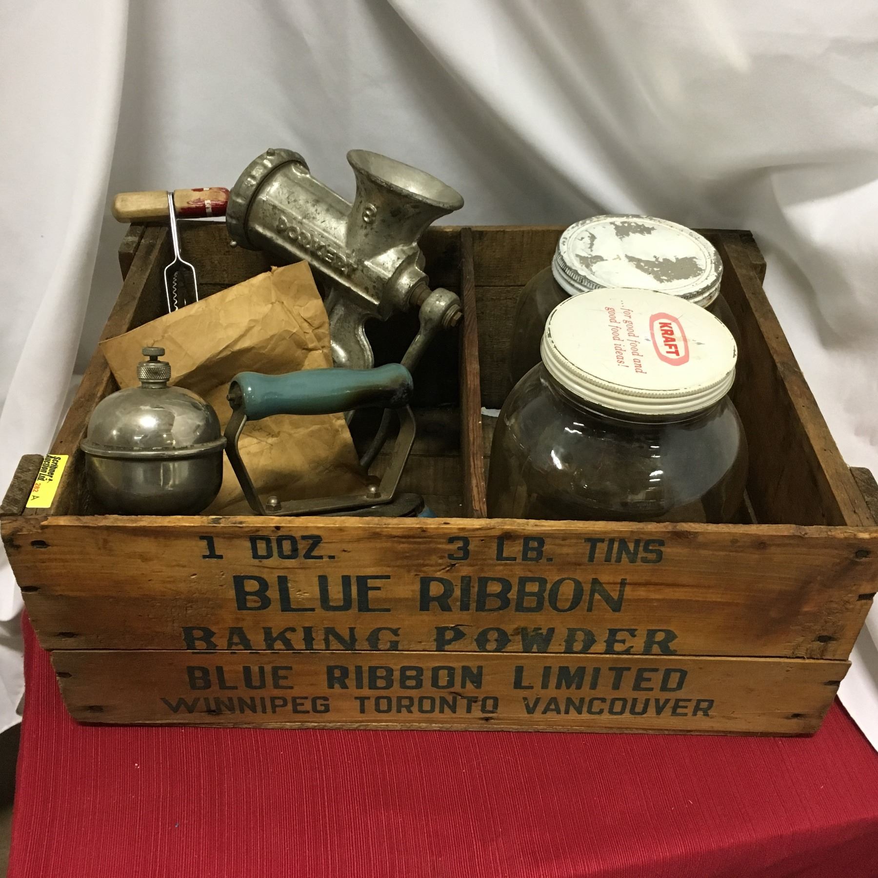 Blue Ribbon Wood Crate w/Coleman Clothes Iron, Meat Grinder "8", Egg Beater, Jars