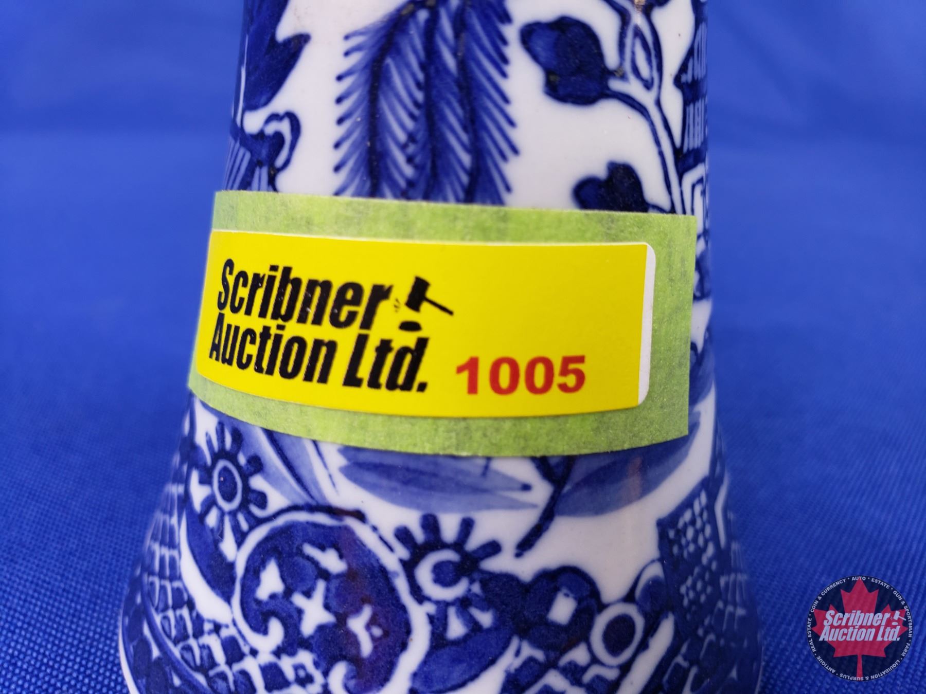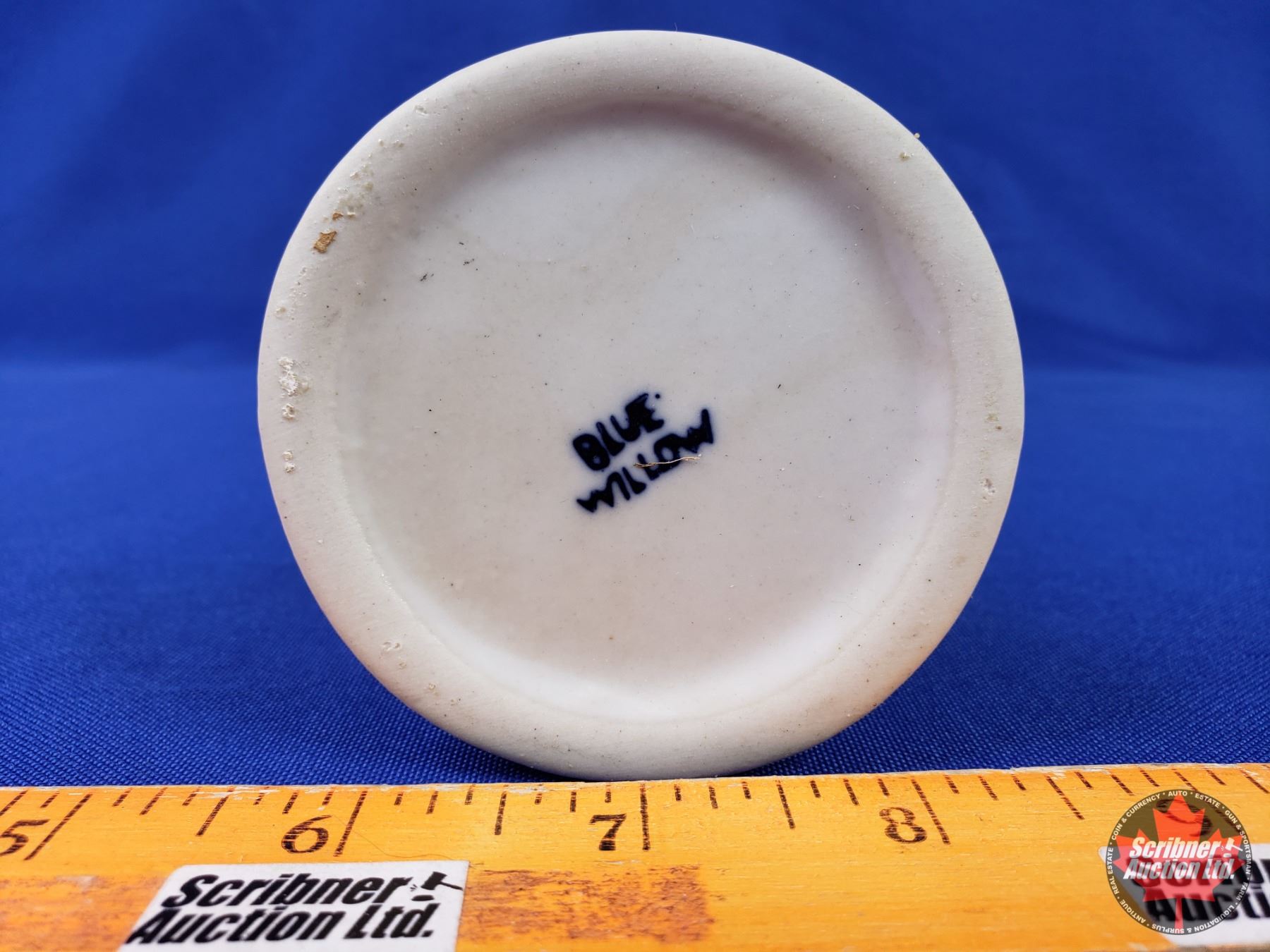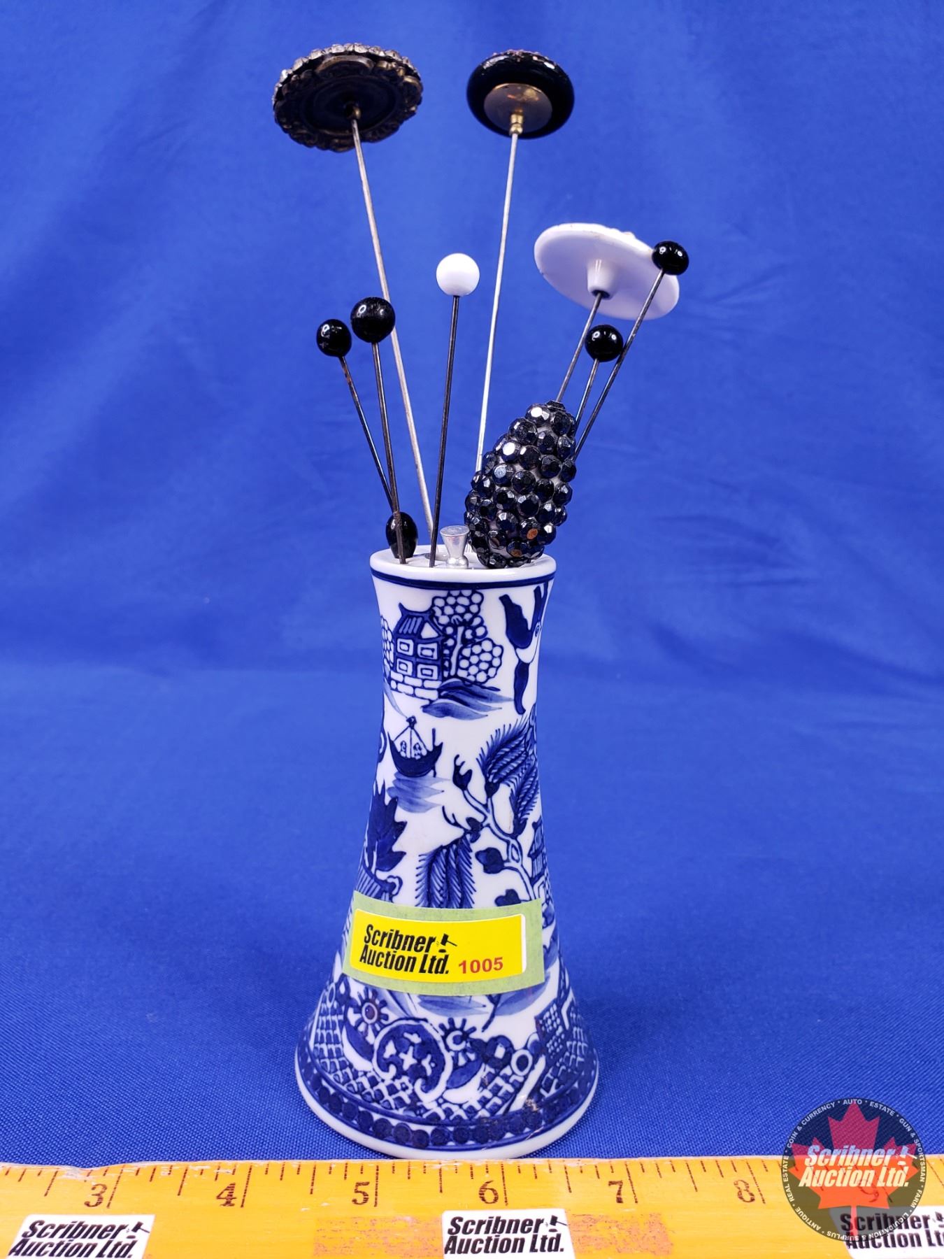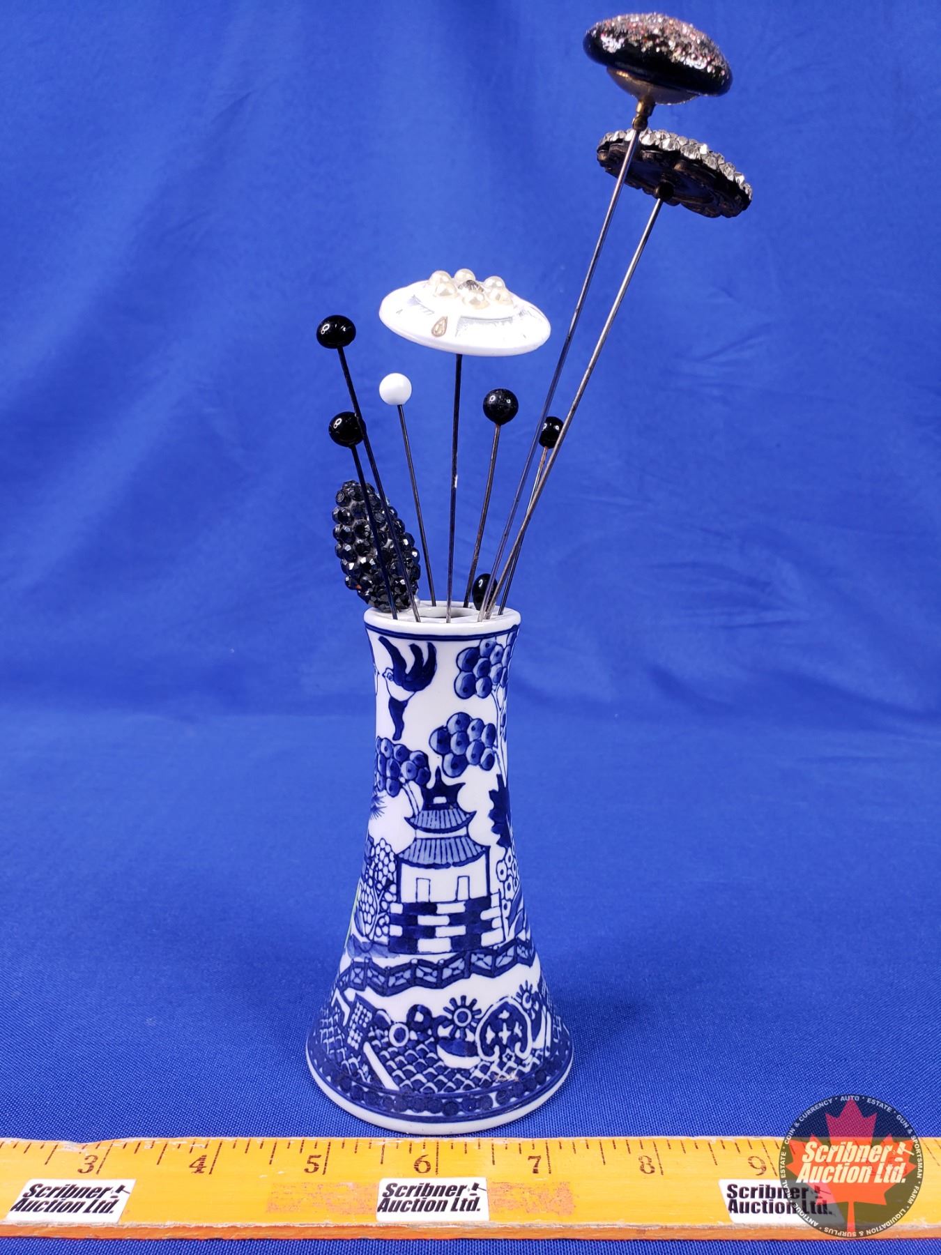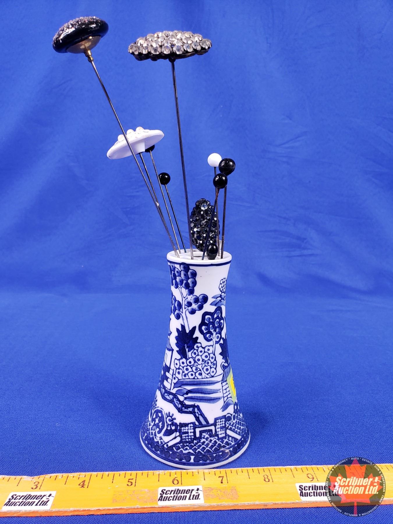 Blue Willow Bud Vase/Hat Pin Holder with Hat Pin Selection (Vase 5"H x 3"Dia) (SEE PICS!)