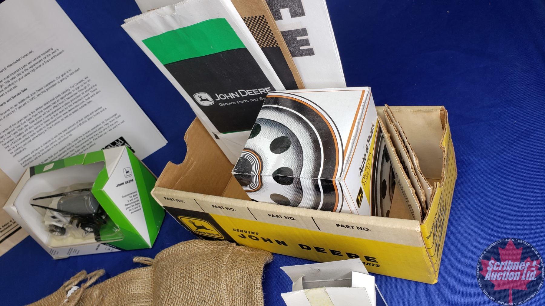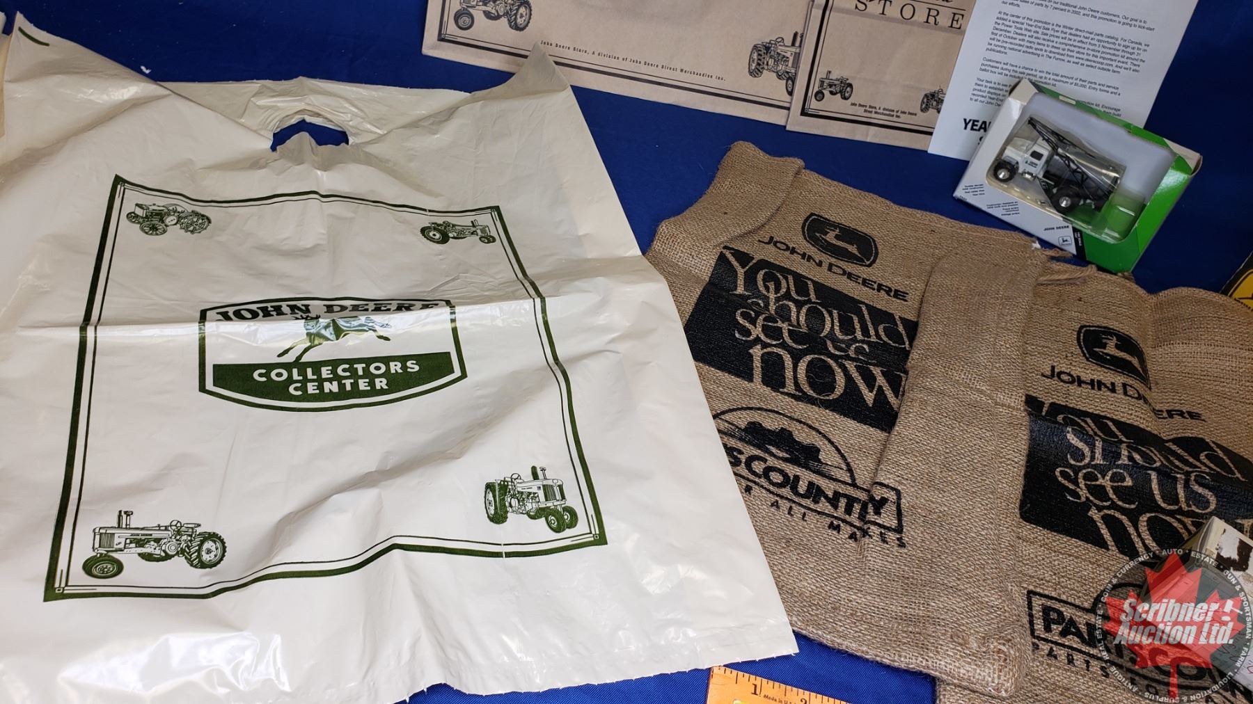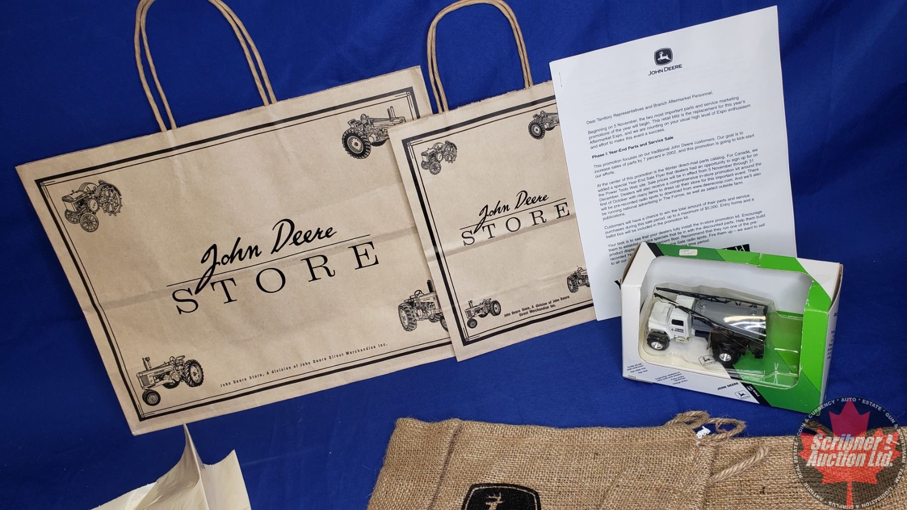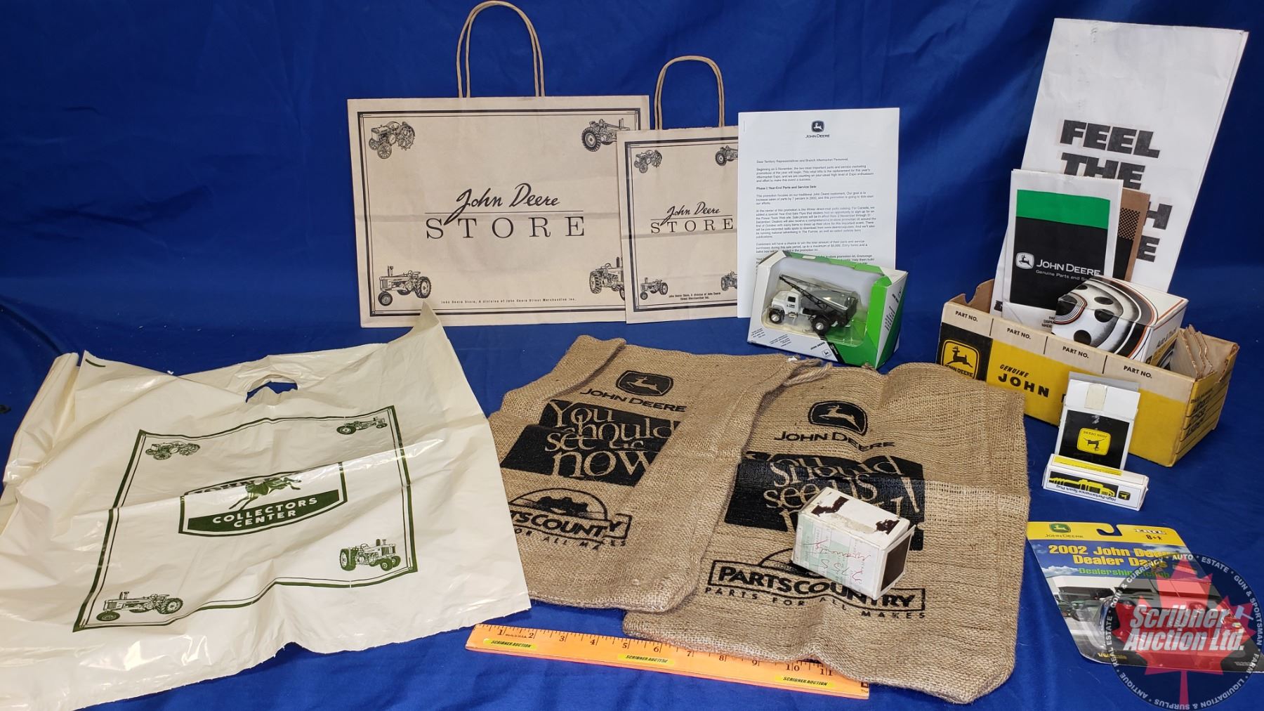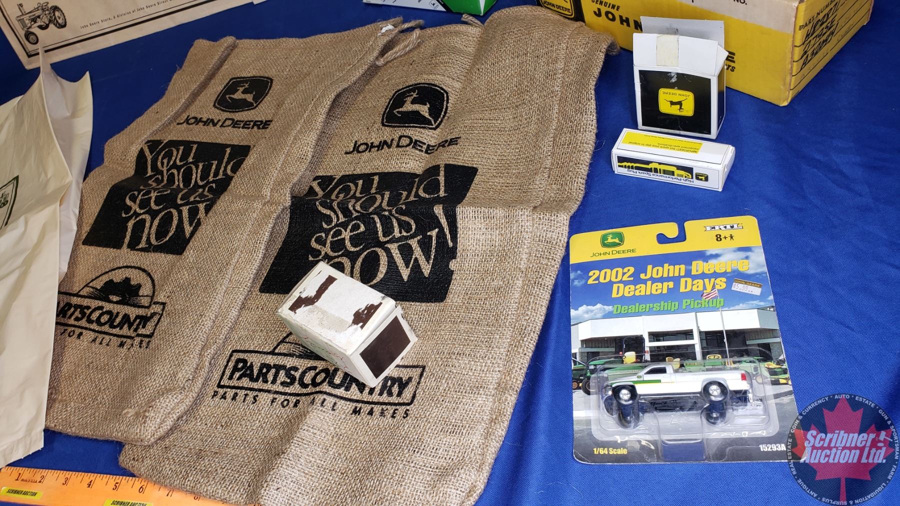Box Lot: John Deere Collectibles : Parts in Boxes, Fertilizer Truck 1/64 Scale, Customer Bags, Burlap Bag Promo (Mailer to Deere Personnel) etc. (See Pics!)