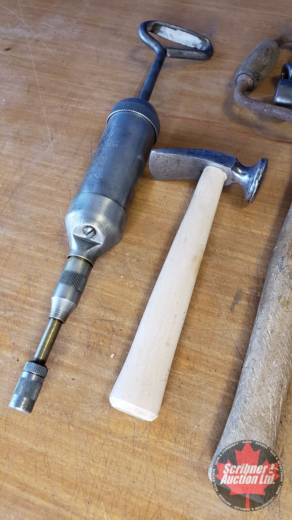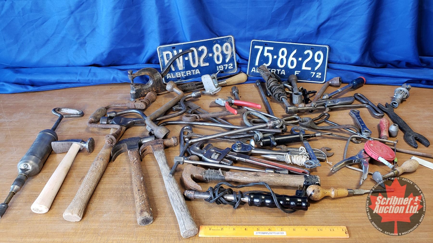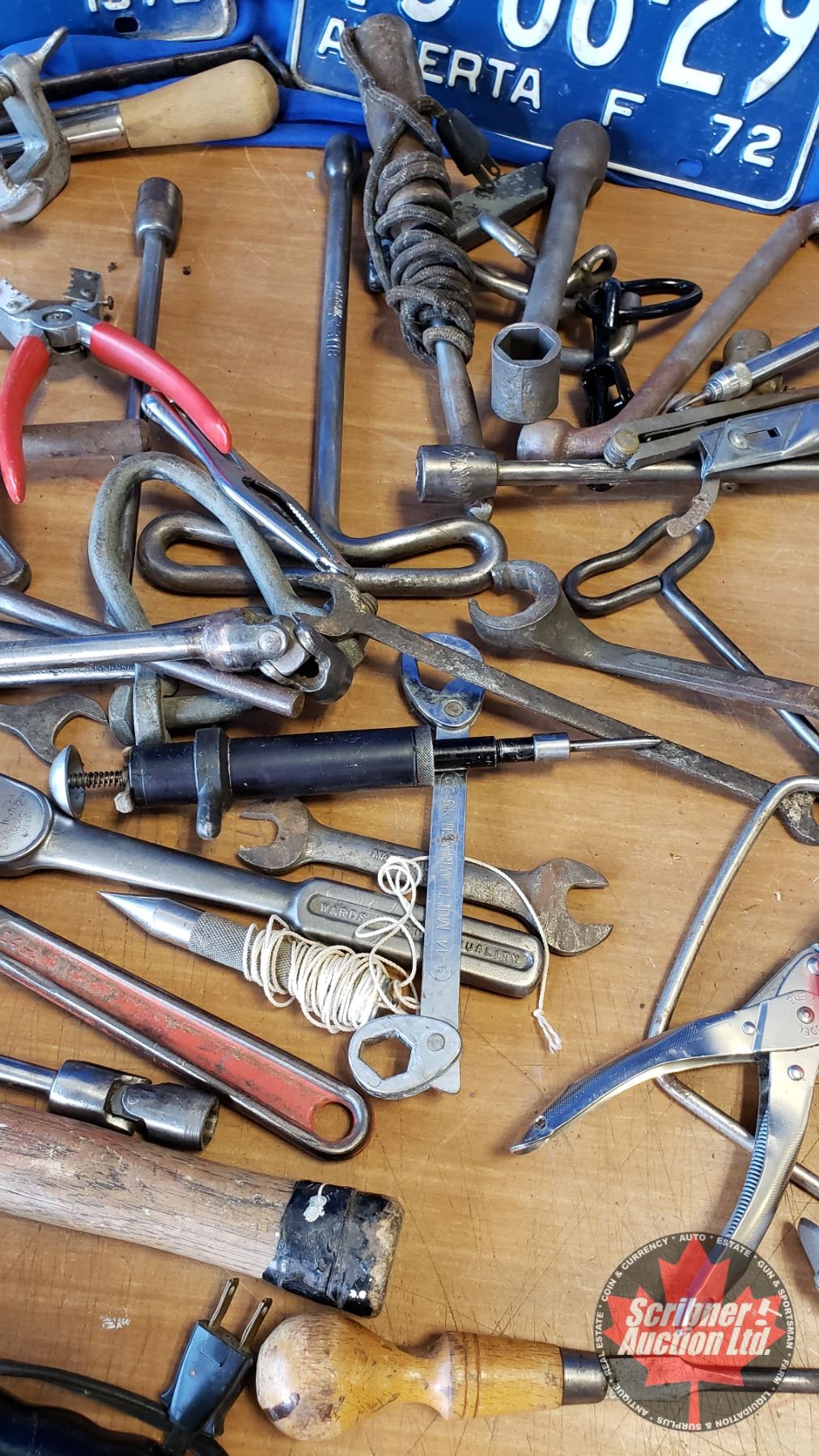 Box Lot - Tools: Grease Gun, Soldering Iron, Hammer, Pipe Wrench, Lic Plate, etc (See Pics)