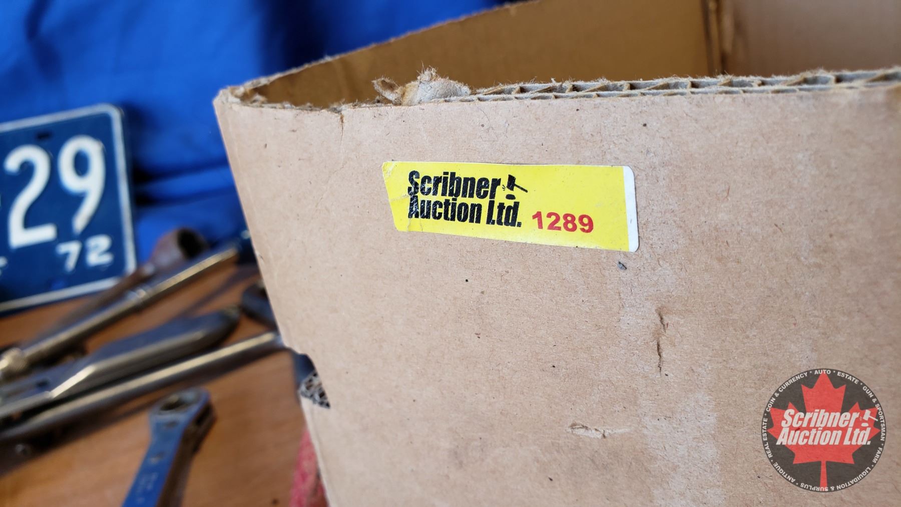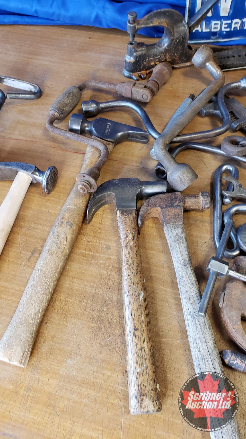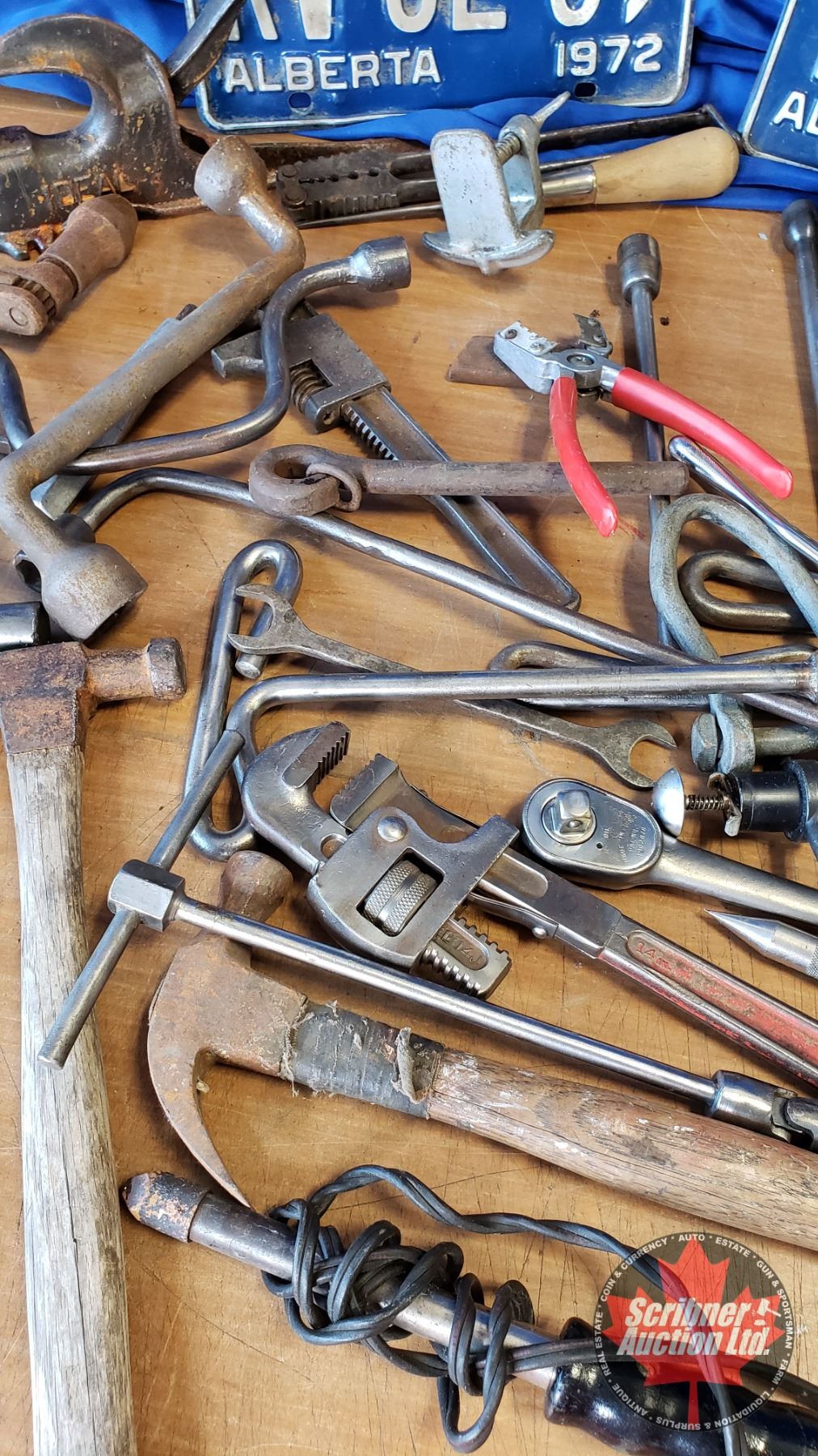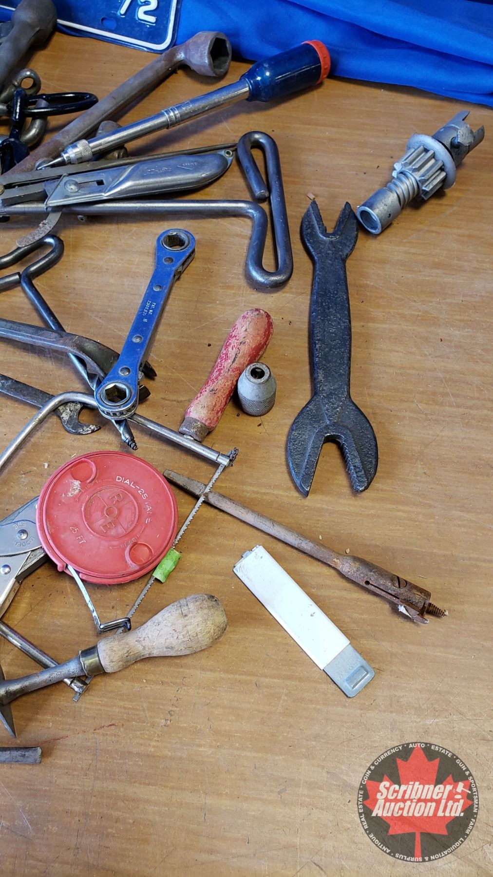 Box Lot - Tools: Grease Gun, Soldering Iron, Hammer, Pipe Wrench, Lic Plate, etc (See Pics)