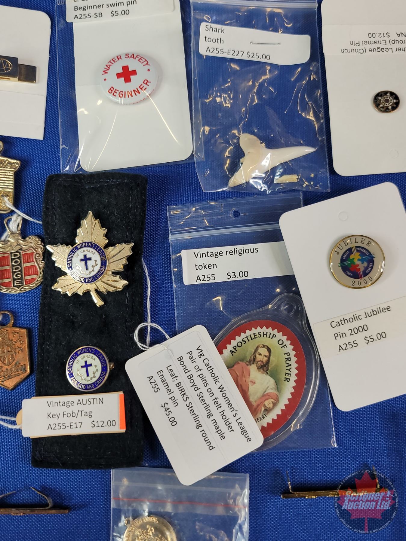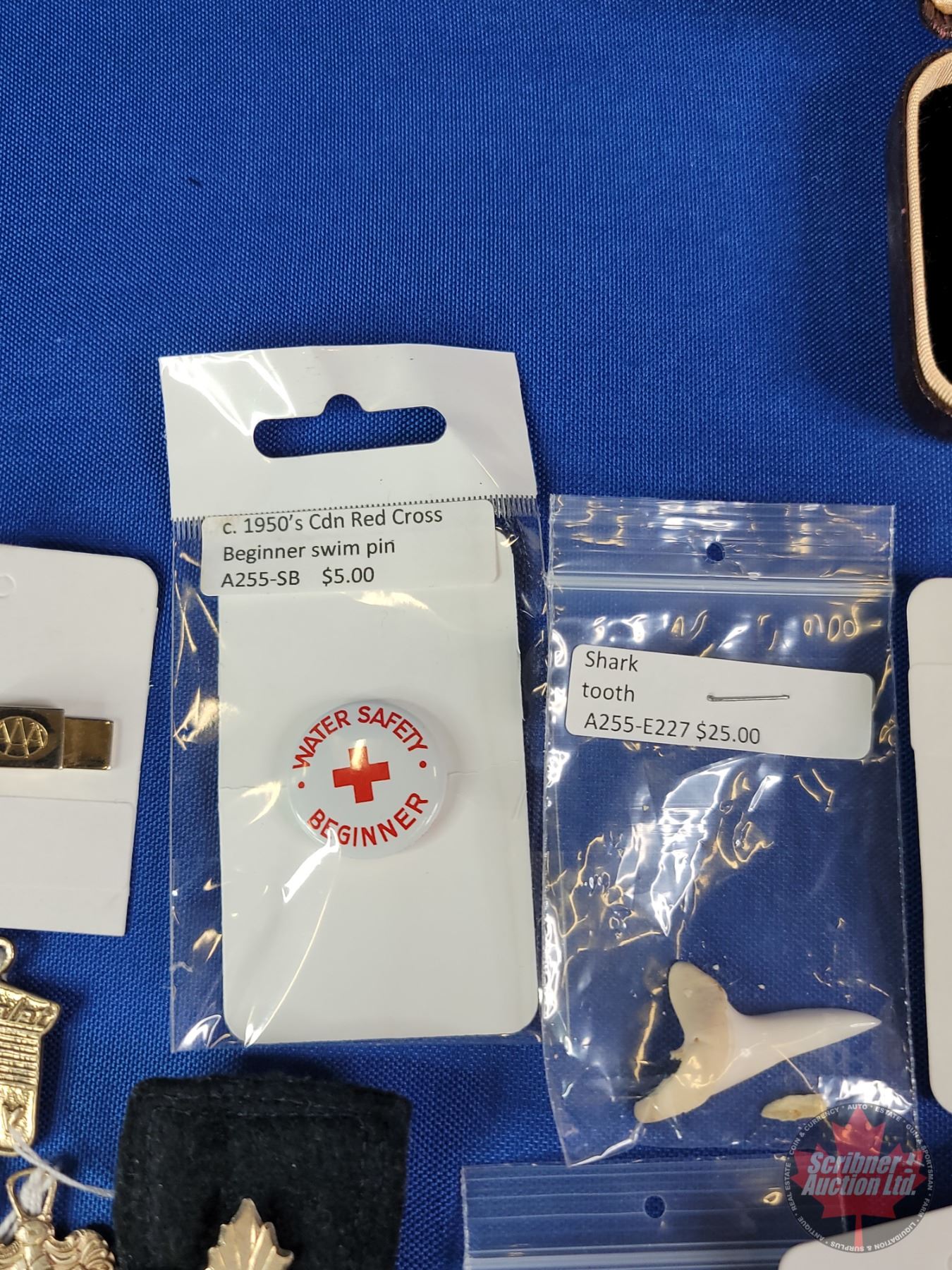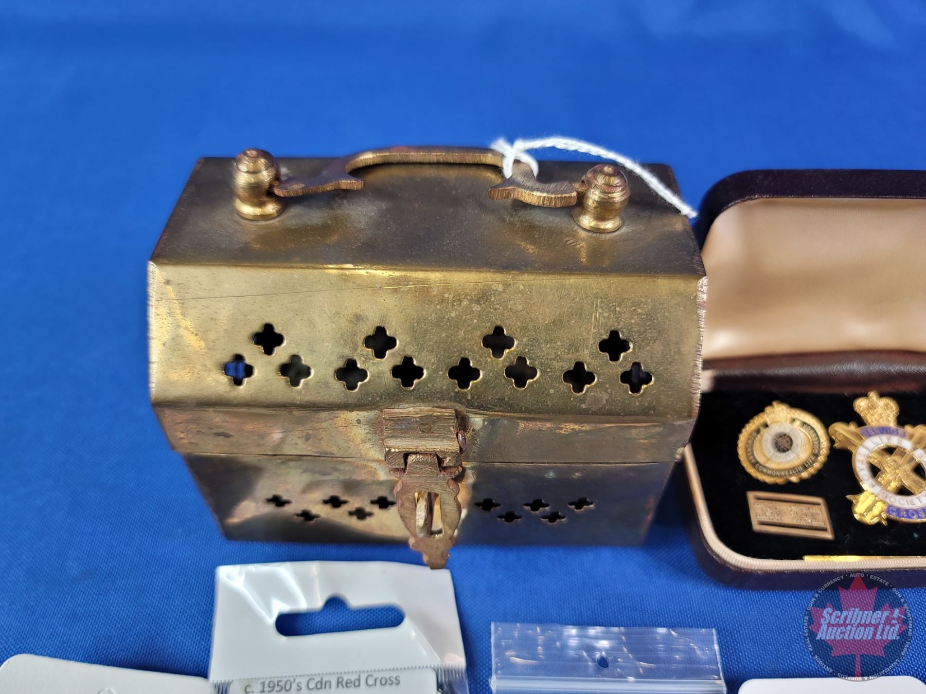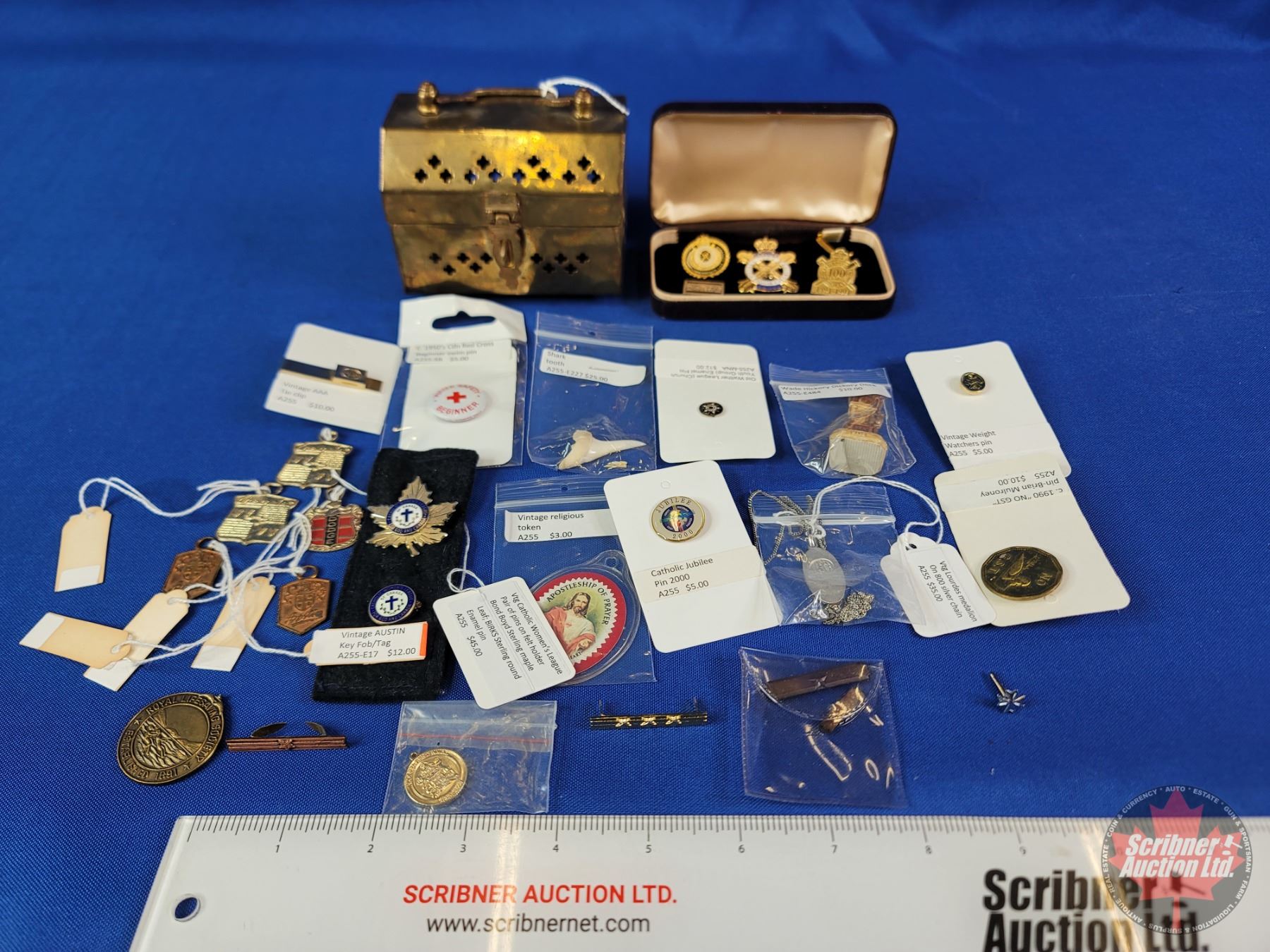 Brass Cricket Box w/Pins, Medallions, Tokens, Shark Tooth, Wade Ornament, Tie Clip, Key Tag, etc
