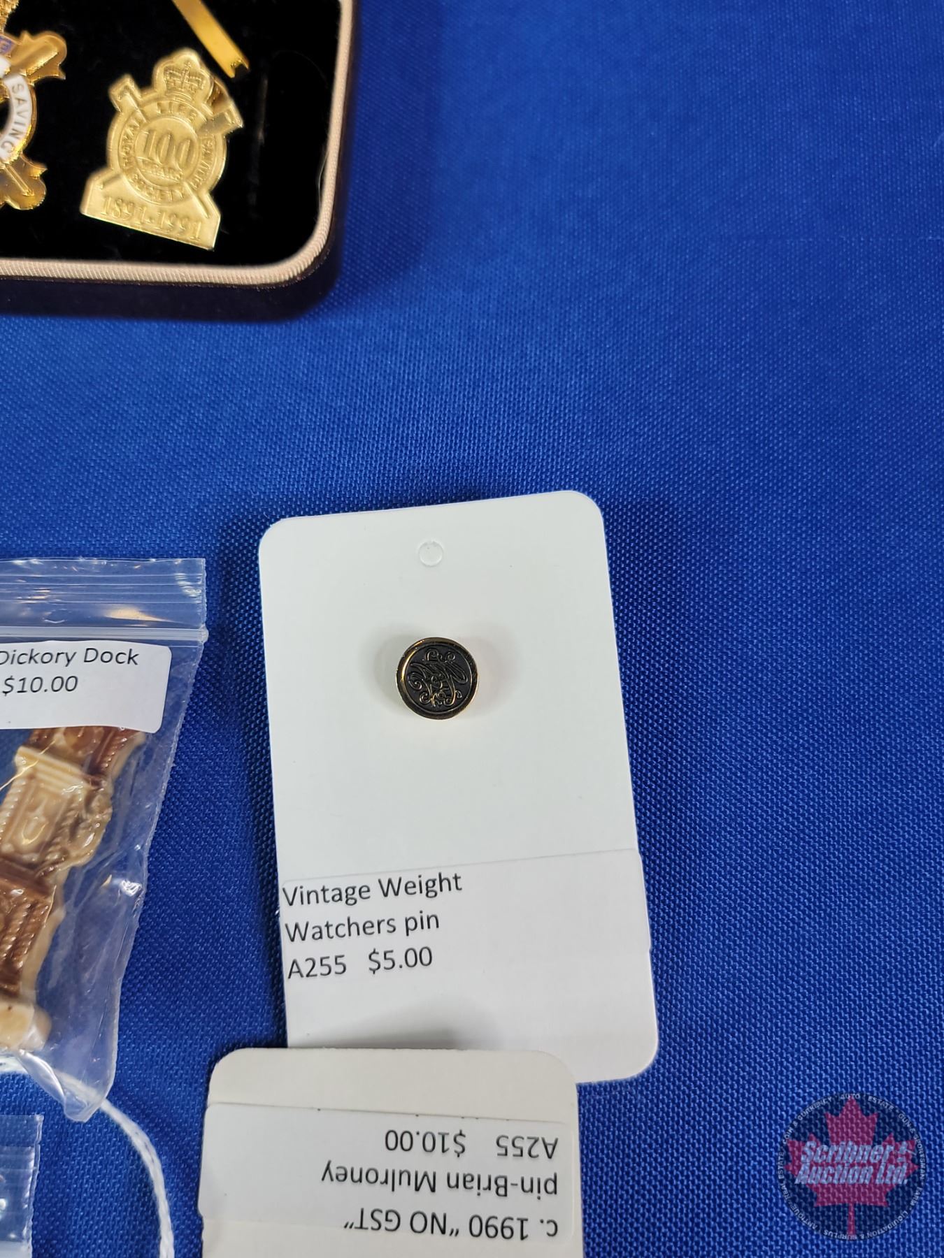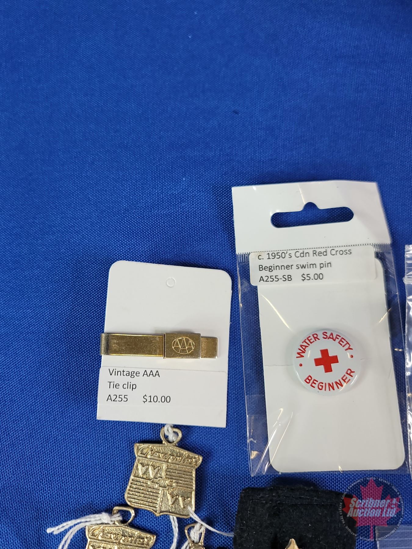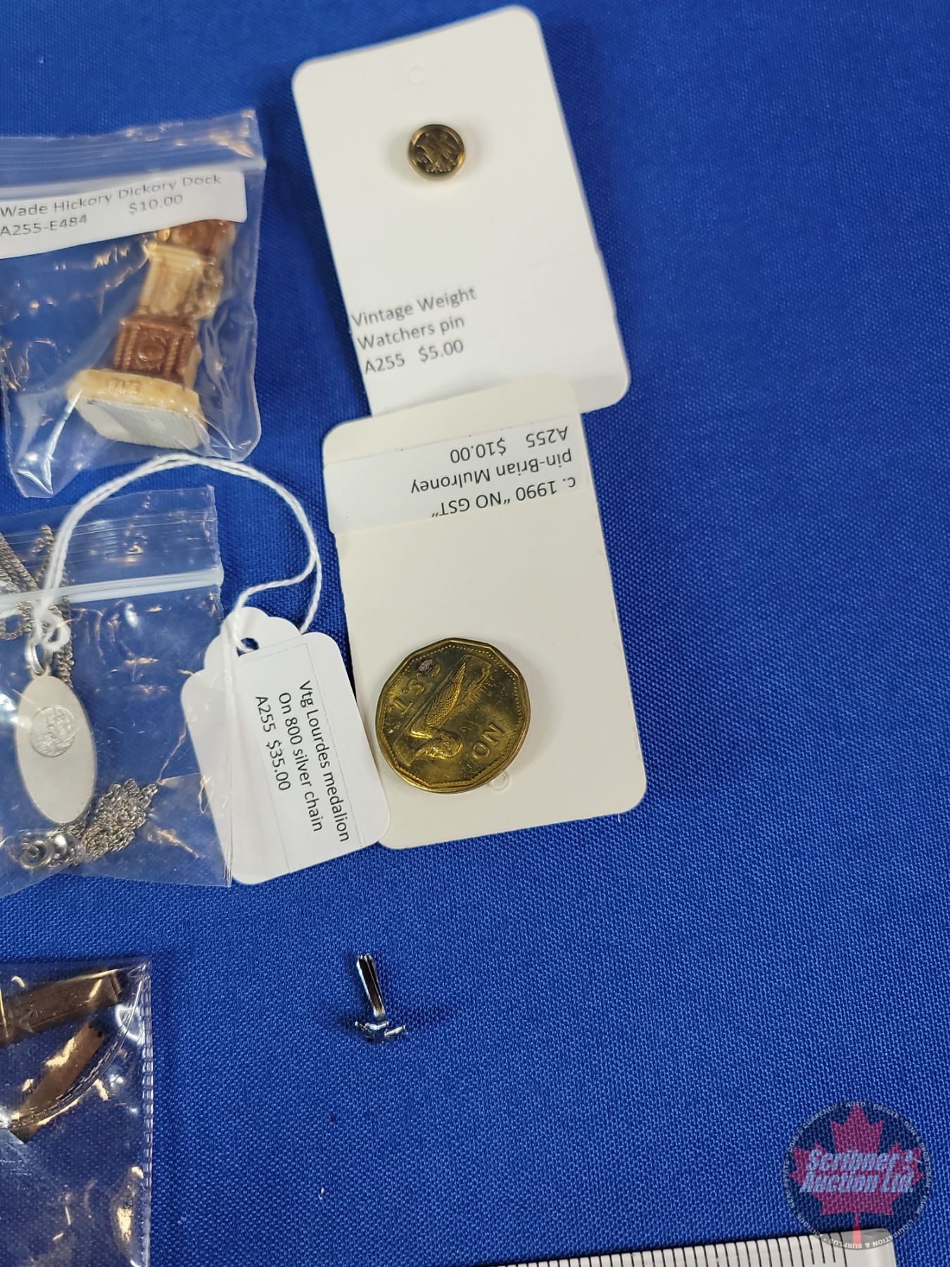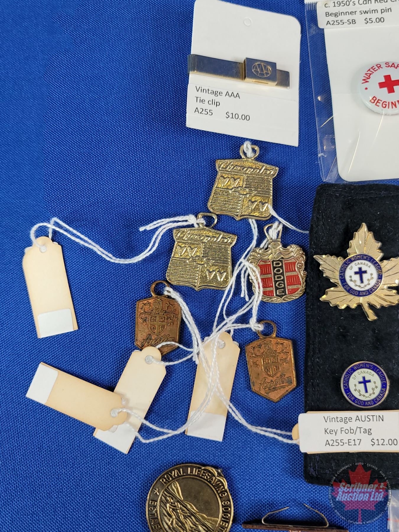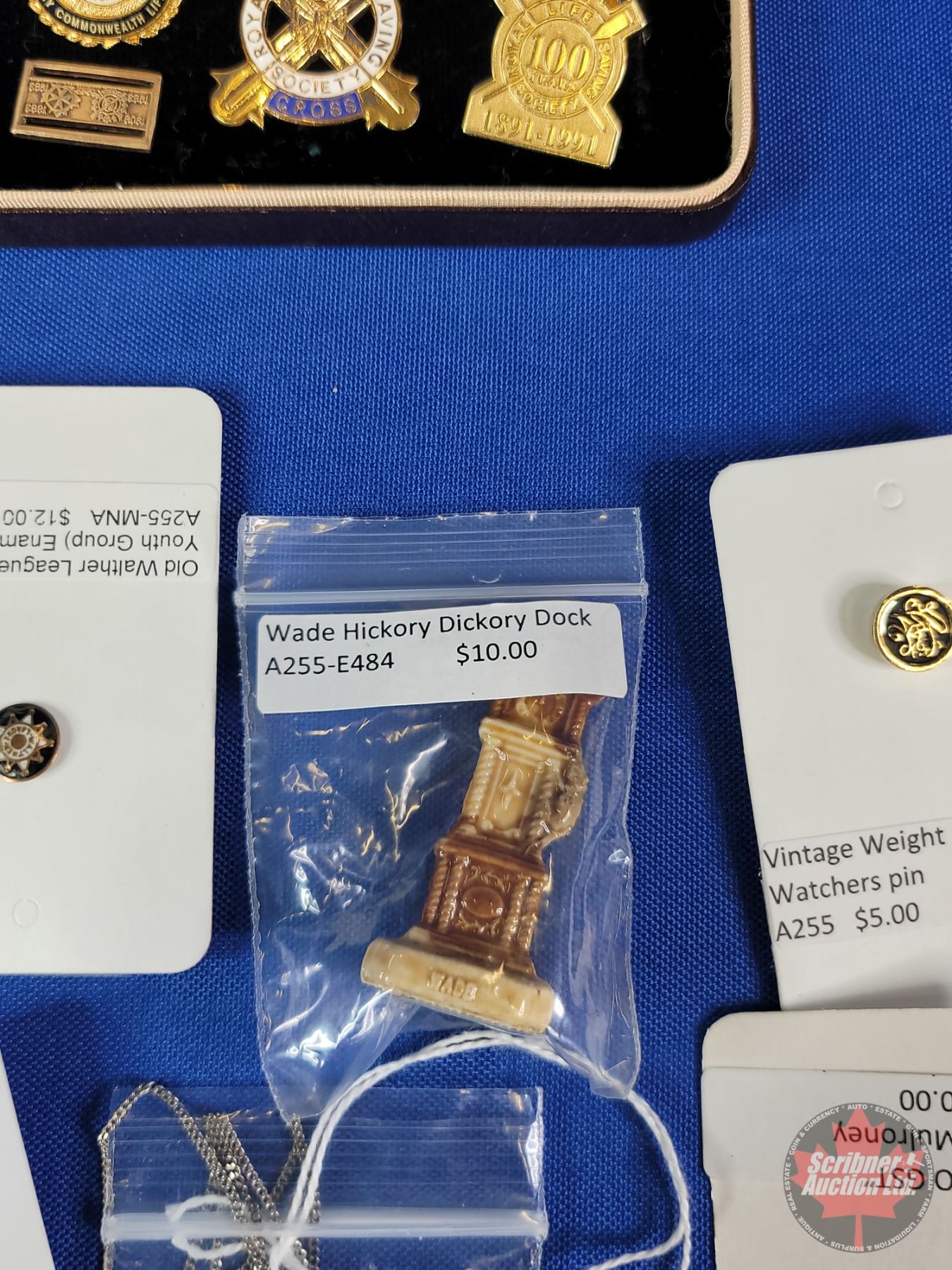 Brass Cricket Box w/Pins, Medallions, Tokens, Shark Tooth, Wade Ornament, Tie Clip, Key Tag, etc