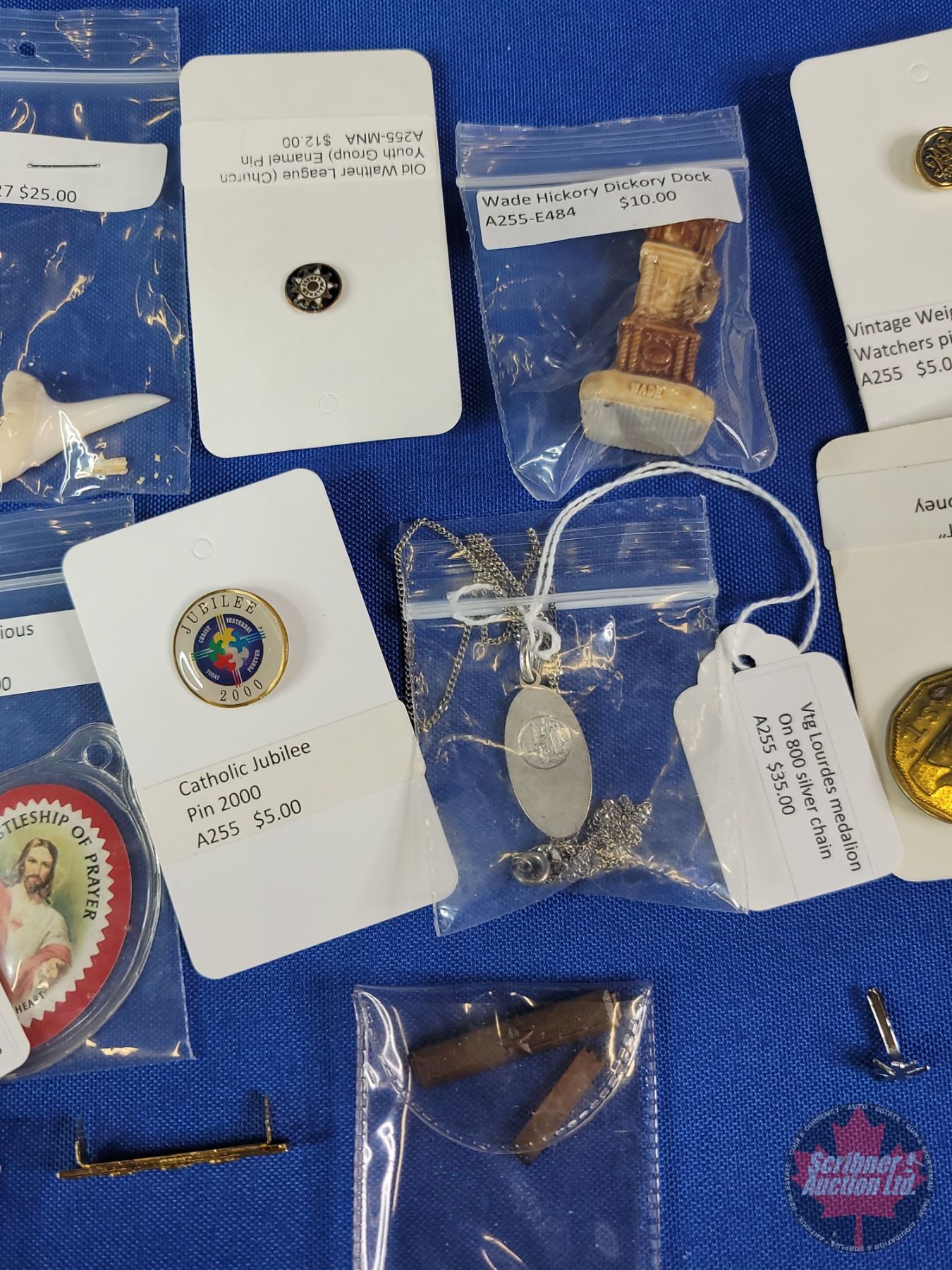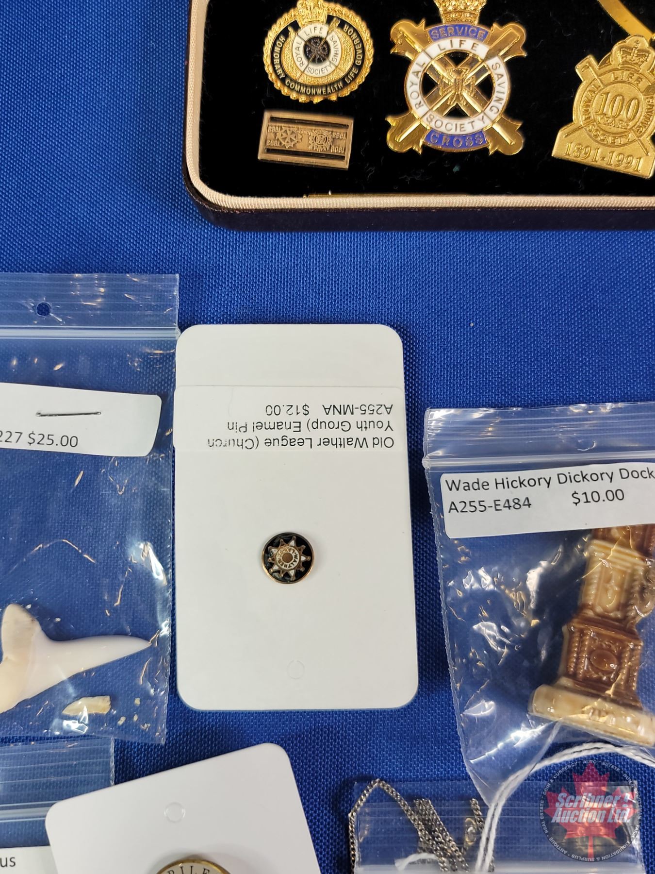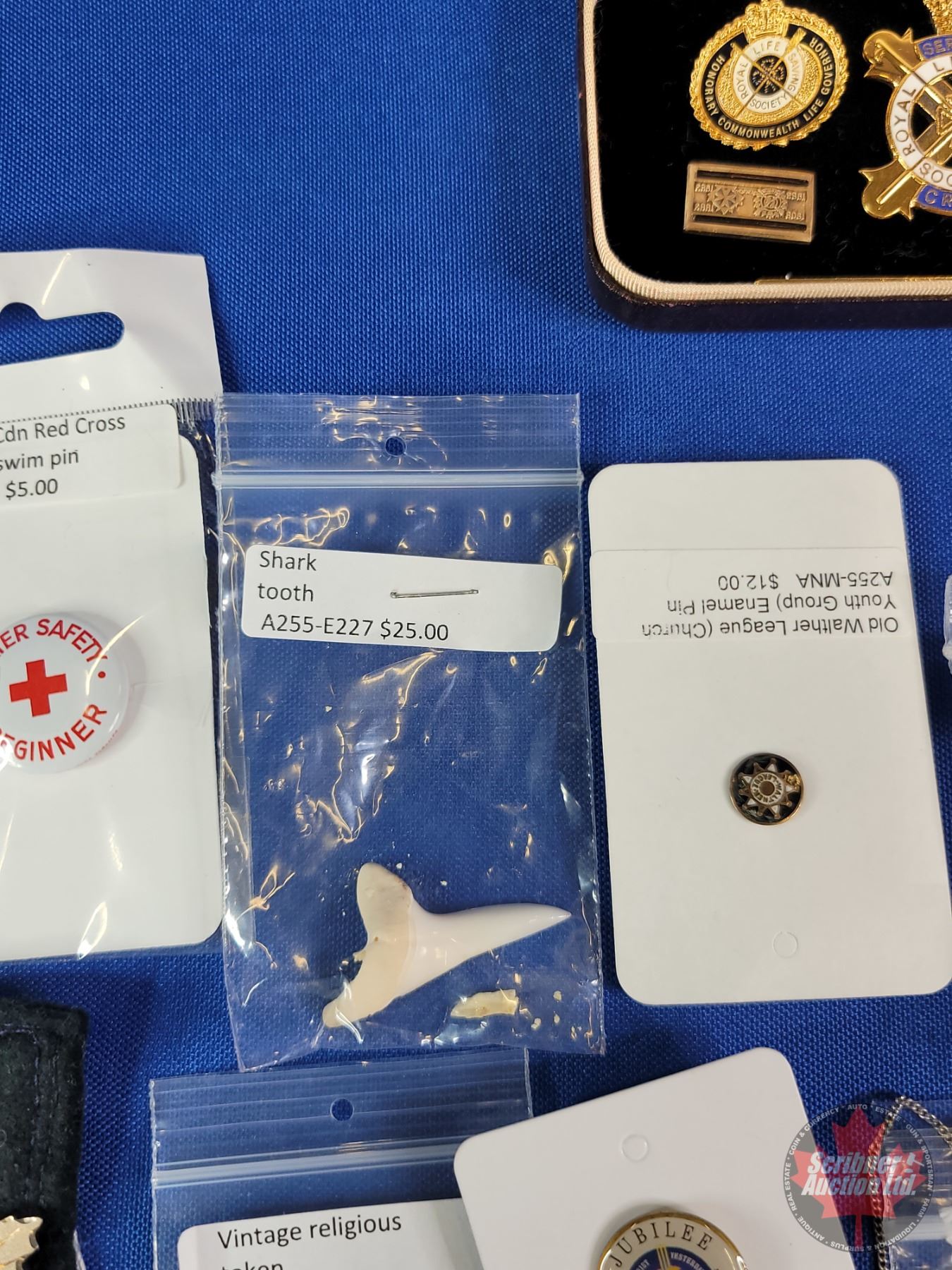 Brass Cricket Box w/Pins, Medallions, Tokens, Shark Tooth, Wade Ornament, Tie Clip, Key Tag, etc (Bo