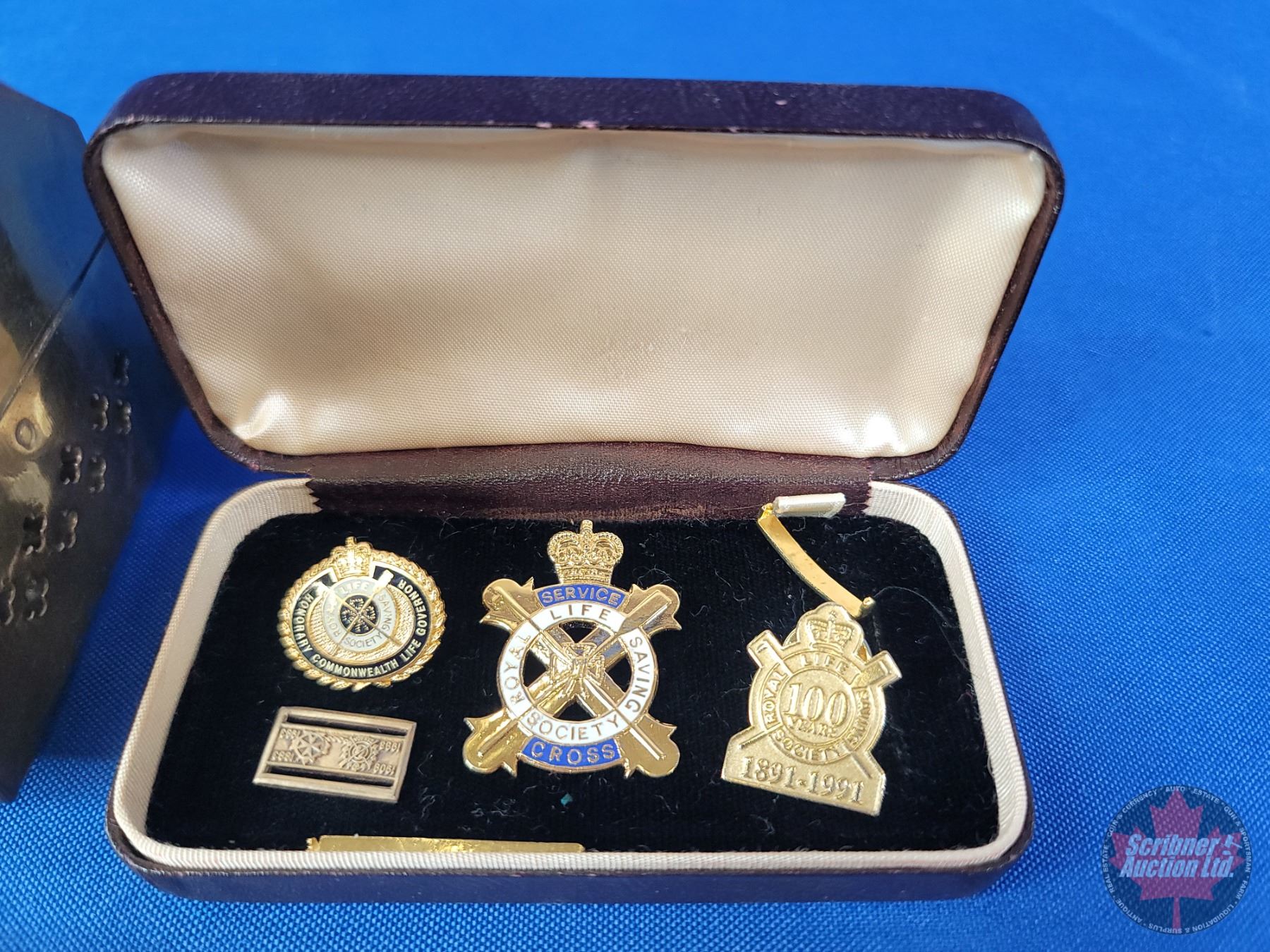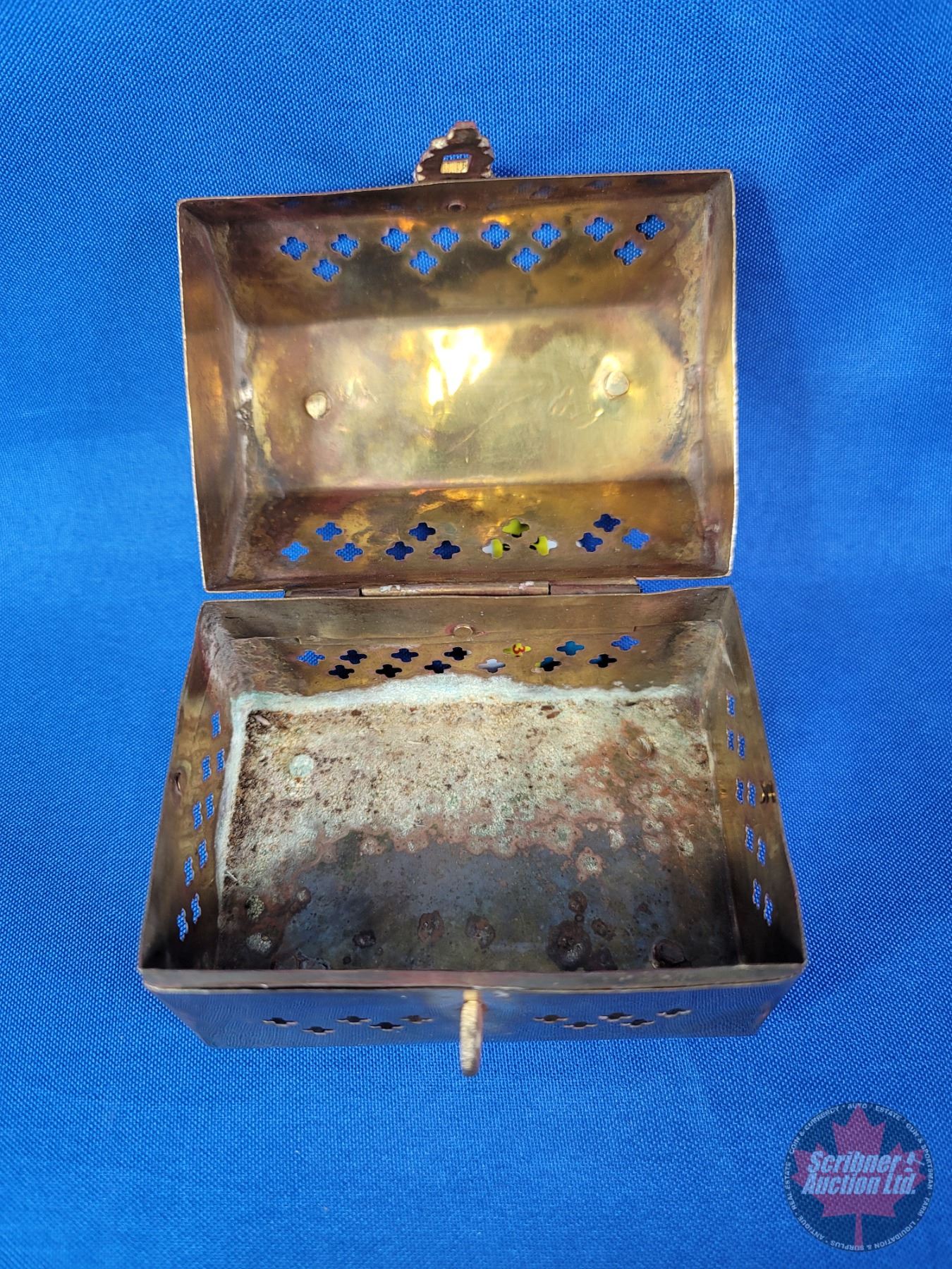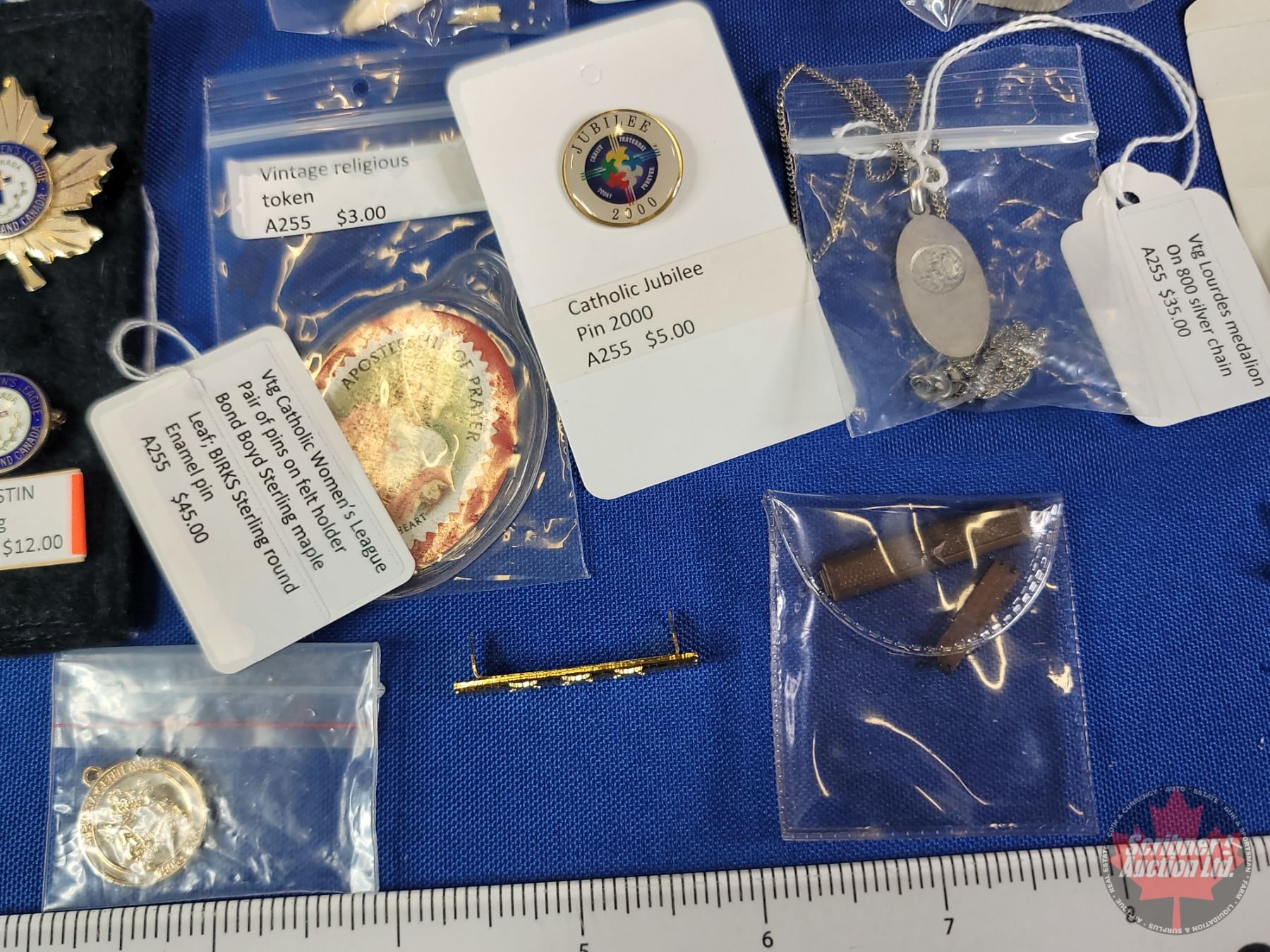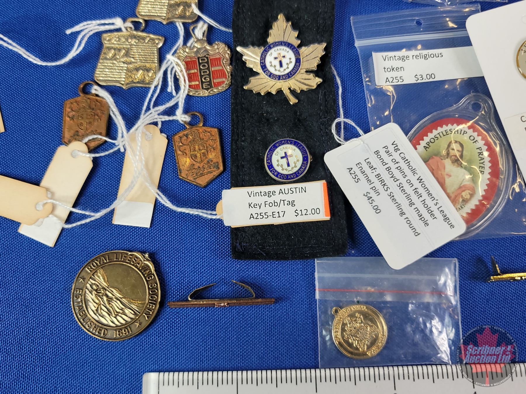 Brass Cricket Box w/Pins, Medallions, Tokens, Shark Tooth, Wade Ornament, Tie Clip, Key Tag, etc (Bo