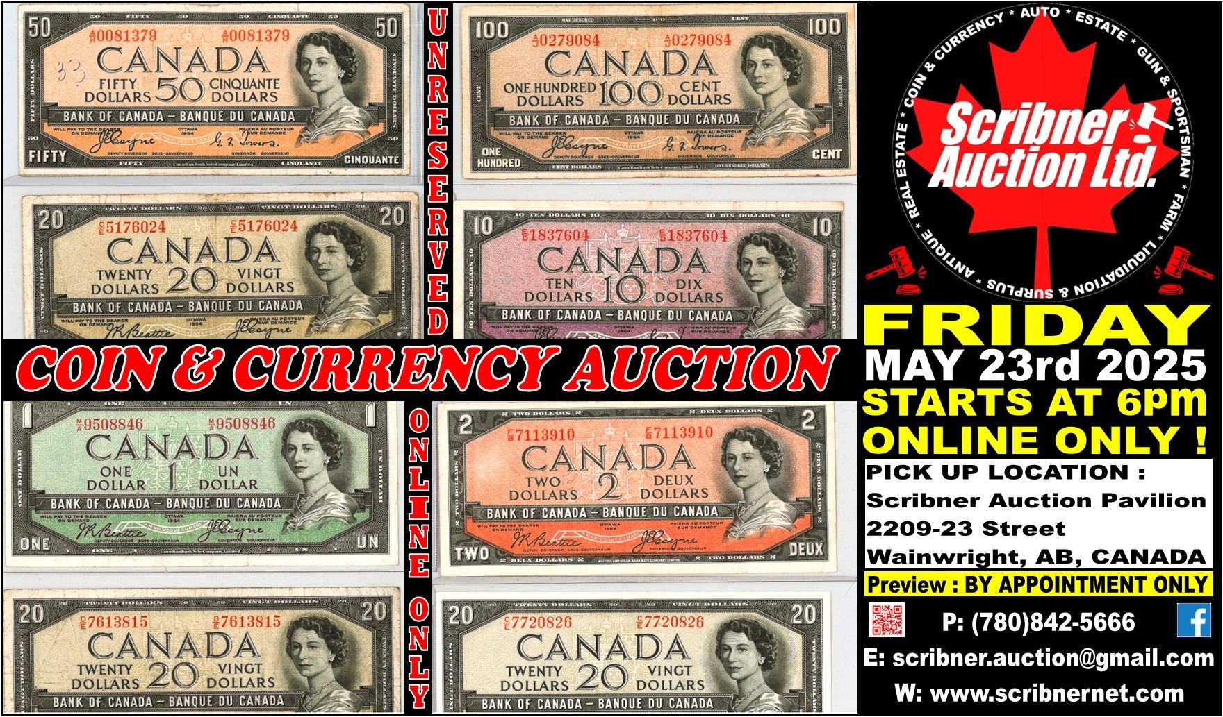 FRIDAY - SATURDAY - SUNDAY : Purchases will be packaged up after the auction and shipped via Canada Post or PUROLATOR (please let us know which of those 2 Couriers you prefer) within 12-16 days of the auction sale. Please contact us via email (reception.scribnerauction@gmail.com) or call 780-842-5666 prior to the auction if you wish to arrange alternate shipping. Shipping & Handling Charges will be charged to your credit card at the time of shipping. Most packages shipped via Canada Post come with $100 insurance. Please review Canada Post Terms & Conditions & Purolator Terms & Conditions for their respective Insurance Policies. If you want EXTRA Insurance from the carrier, you must instruct our office to purchase additional insurance! Scribner Auction Ltd. will not be responsible for any damage or breakage to any item for any reason (shipping, handling or otherwise). If you wish to arrange for Pick Up at our Wainwright, AB location, please call our office to make an appointment 780-842-5666. You MUST schedule an appointment (NO DROP INS PLEASE!)