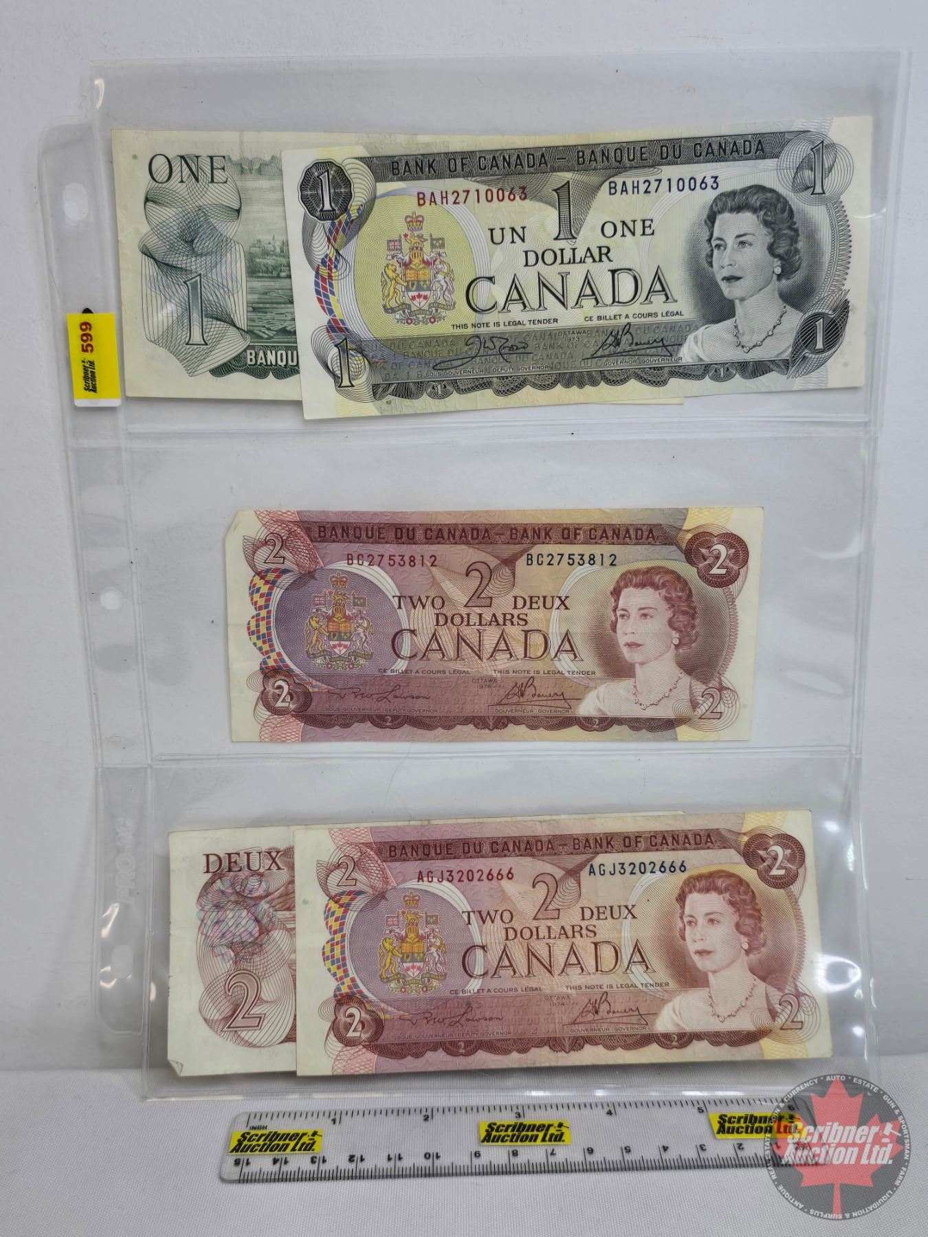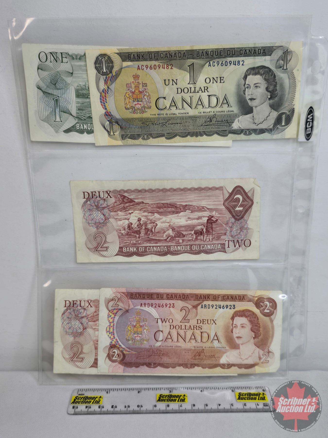 Canada $1 & $2 Bills (5) : - 1973 : Crow/Bouey #BAH2710063 - 1973 : Lawson/Bouey #AC9609482 - 1974 : Lawson/Bouey #BC2753812 - 1974 : Lawson/Bouey #AGJ3202666 - 1974 : Crow/Bouey #ARD9246923 (See Pics for Varieties, Conditions, Serial Numbers, Printing Dates & Signatures) (Listing & Descriptions are a GUIDE ONLY and are subject to changes, errors, additions or deletions. Please use the provided pictures to satisfy yourself to the Condition and/or Grades. Please Read & Understand All Terms & Conditions for this Auction Sale.)