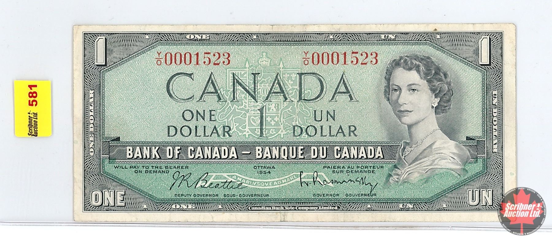 Canada $1 Bill 1954 (Low Serial #) : Beattie/Rasminsky #YO0001523 (See Pics for Varieties, Conditions, Serial Numbers & Signatures)