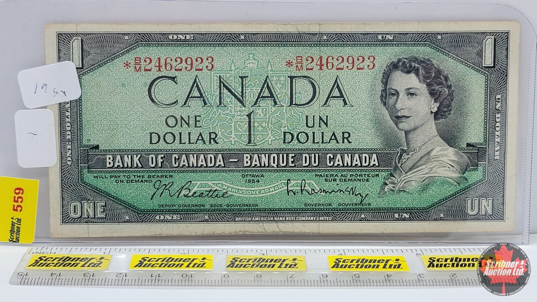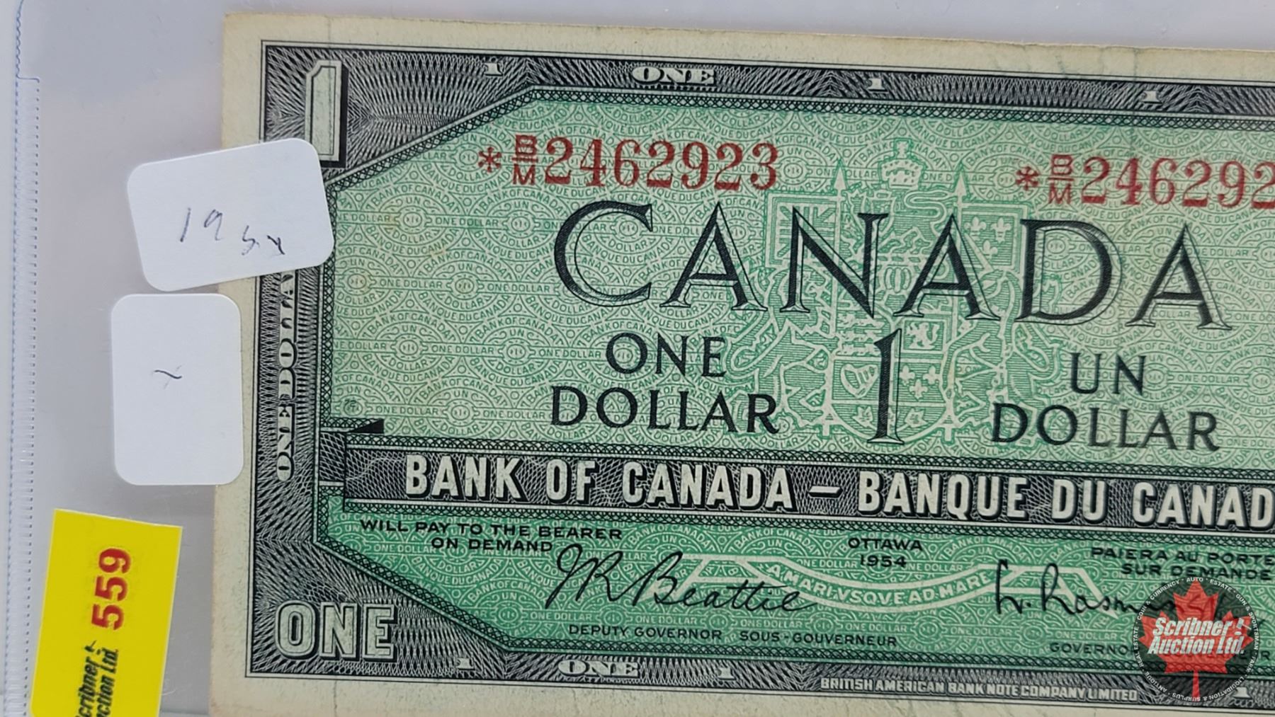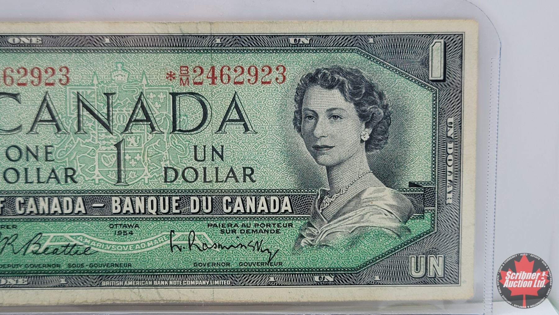 Canada $1 Bill 1954 *Replacement : S/N# *BM2462923 Beattie/Rasminsky (See Pics for Varieties, Conditions, Serial Numbers & Signatures)