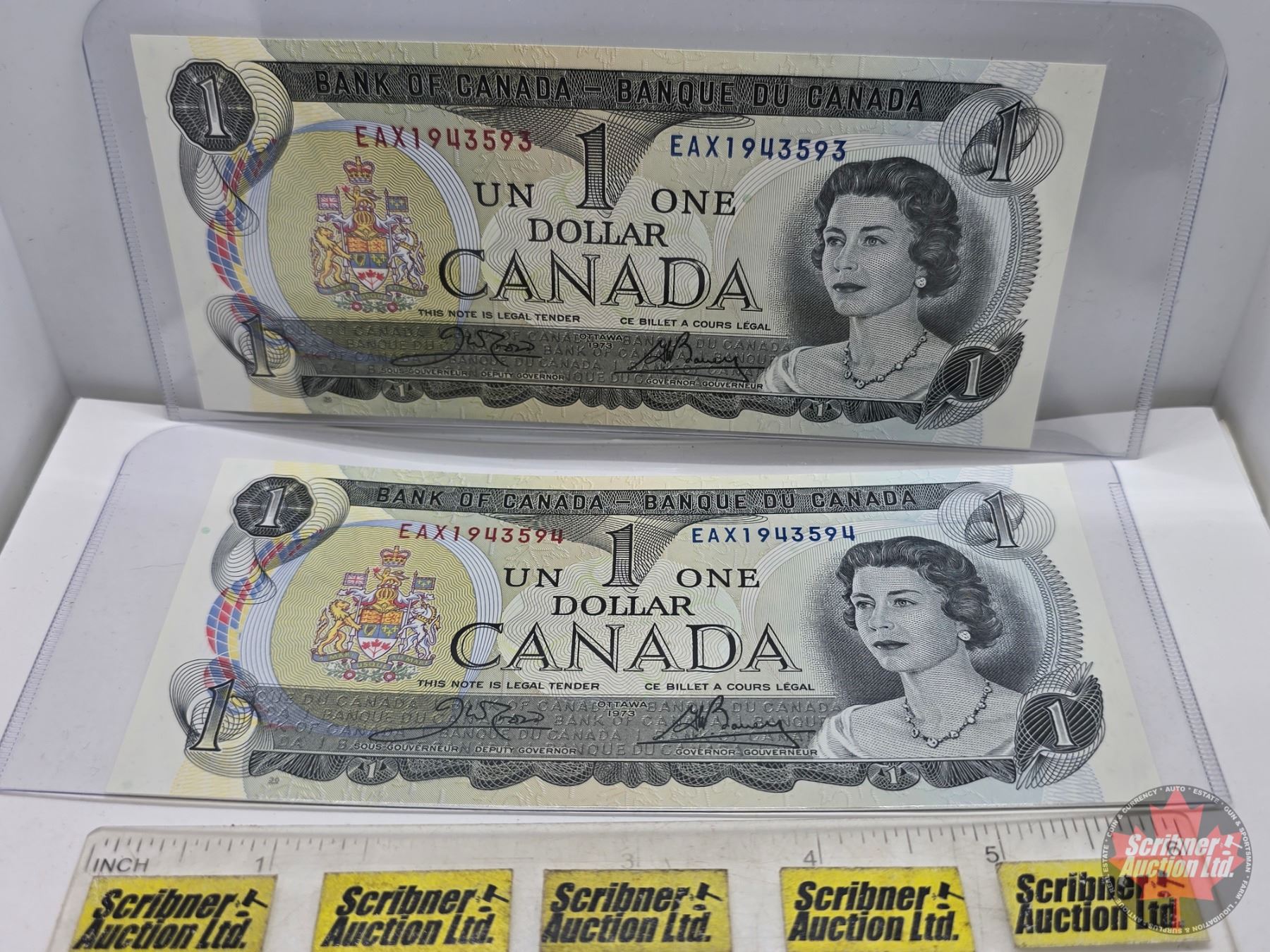 Canada $1 Bill 1973 "X" Replacements (2 Consecutive) : Crow/Bouey #EAX1943593-3594