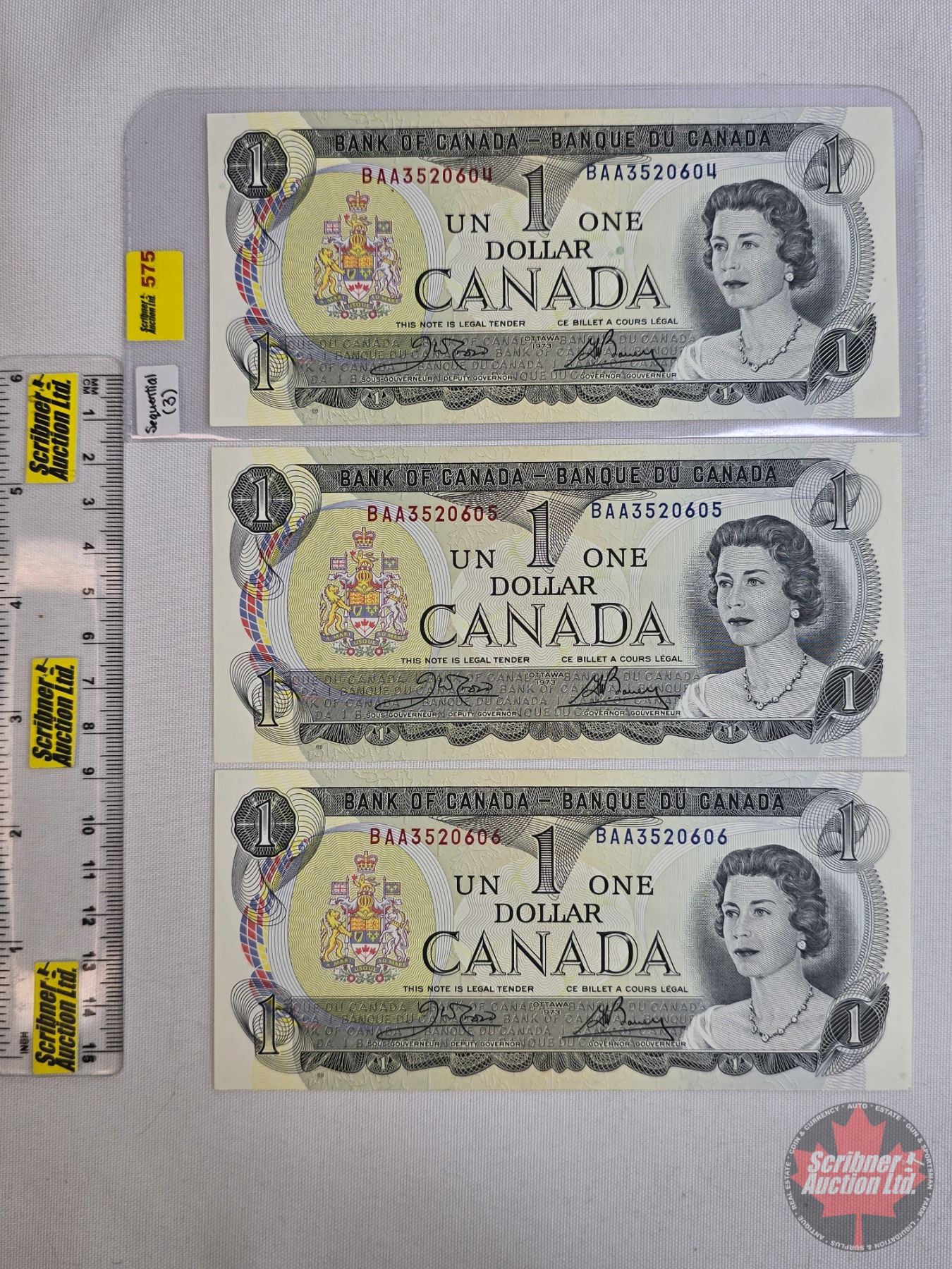 Canada $1 Bills 1973 (3 Consecutive): Crow/Bouey #BAA3520604-605-606 (See Pics for Varieties, Conditions, Serial Numbers, Printing Dates & Signatures) (Listing & Descriptions are a GUIDE ONLY and are subject to changes, errors, additions or deletions. Please use the provided pictures to satisfy yourself to the Condition and/or Grades. Please Read & Understand All Terms & Conditions for this Auction Sale.)