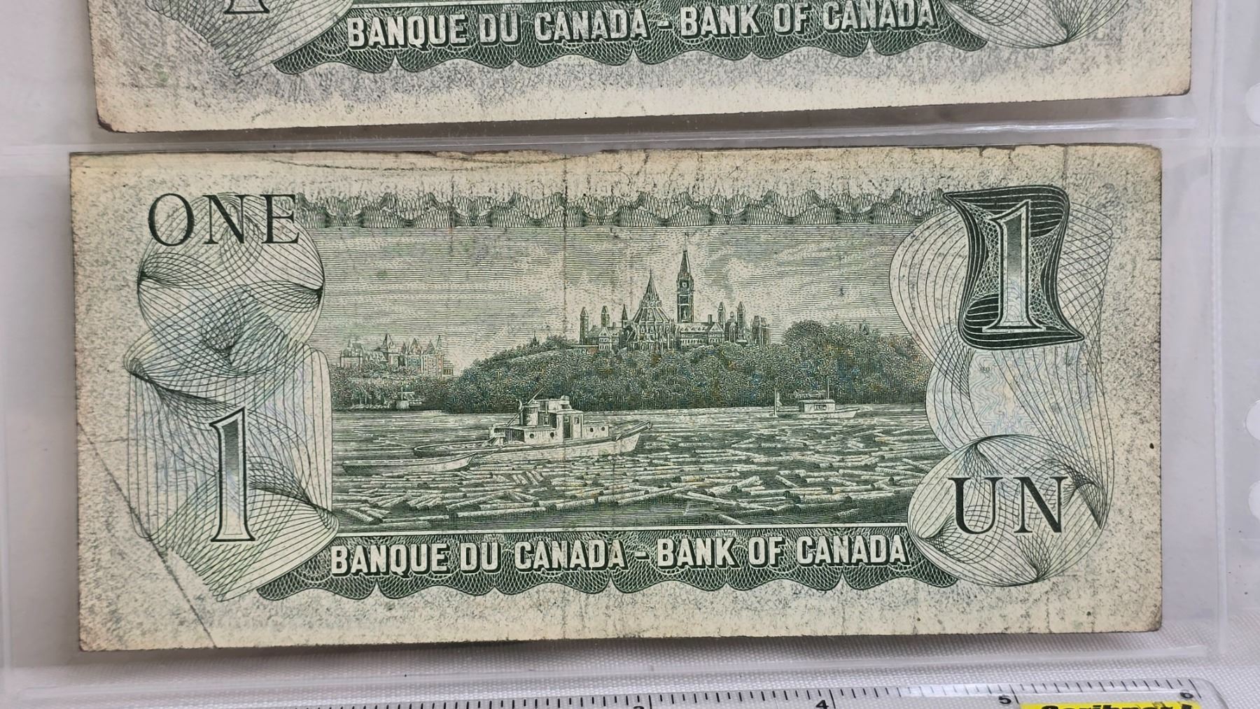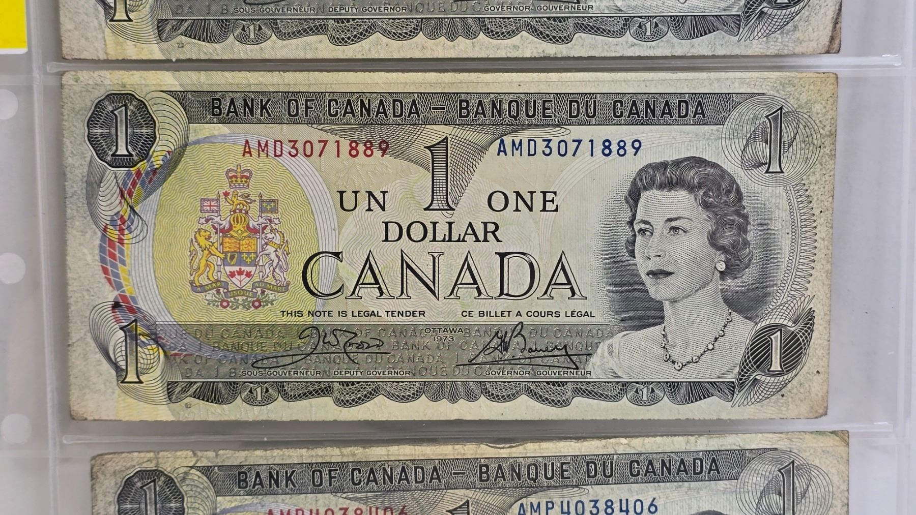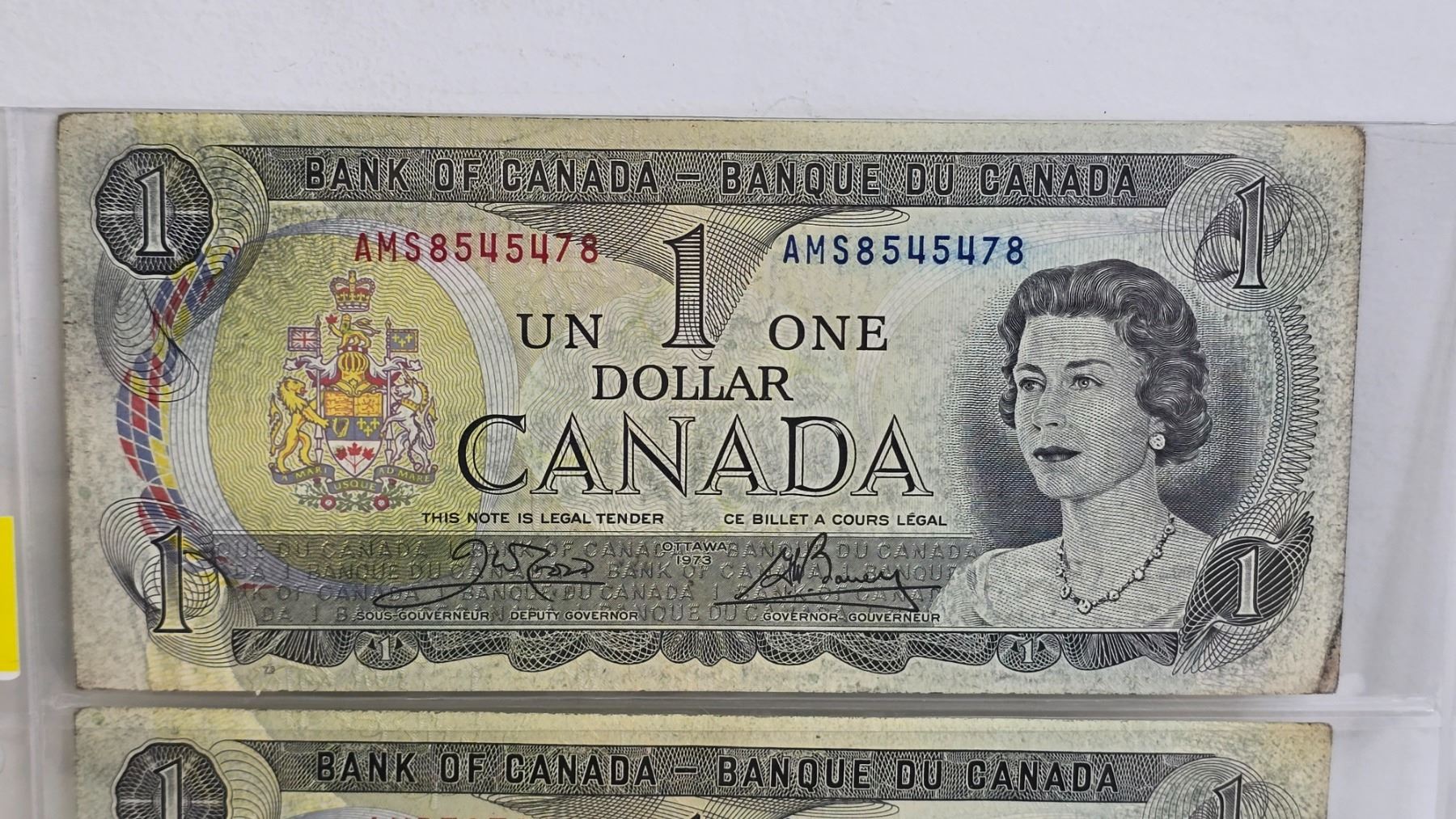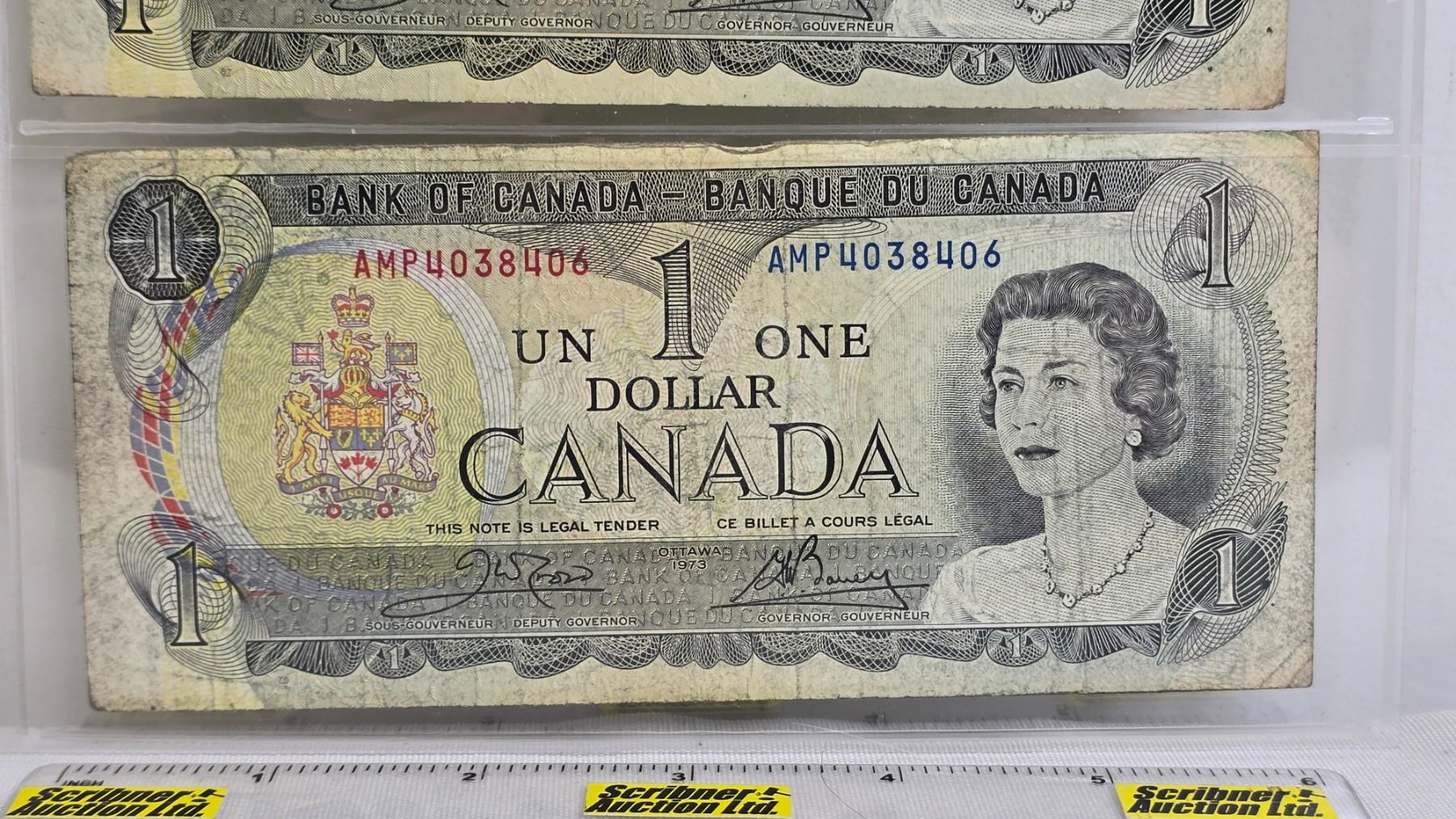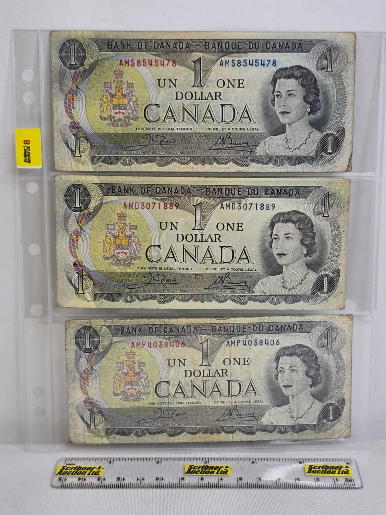 Canada $1 Bills 1973 (3): - Crow/Bouey #AMS8545478 - Crow/Bouey #AMD3071889 - Crow/Bouey #AMP4038406 (See Pics for Varieties, Conditions, Serial Numbers, Printing Dates & Signatures) (Listing & Descriptions are a GUIDE ONLY and are subject to changes, errors, additions or deletions. Please use the provided pictures to satisfy yourself to the Condition and/or Grades. Please Read & Understand All Terms & Conditions for this Auction Sale.)