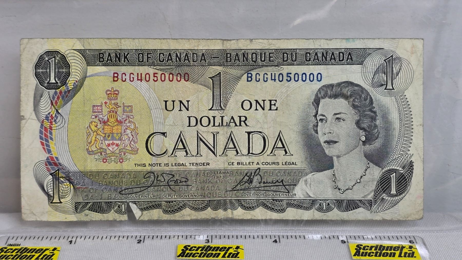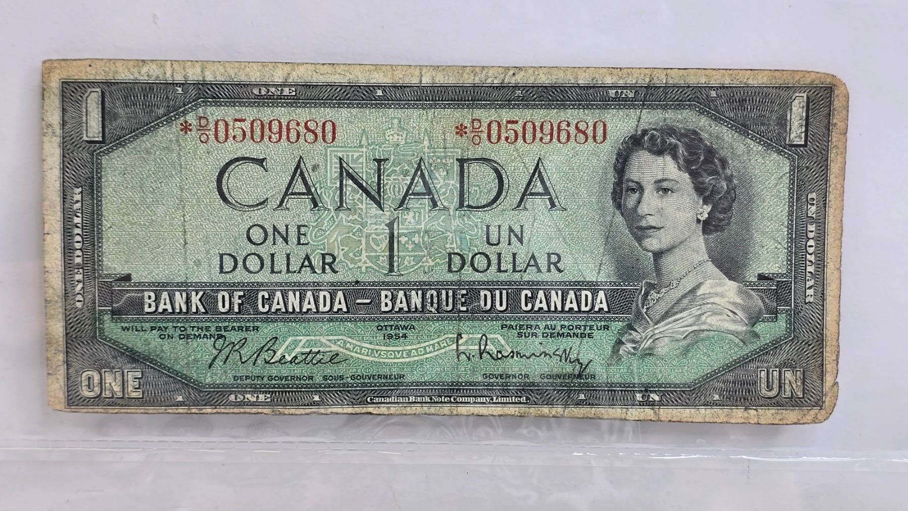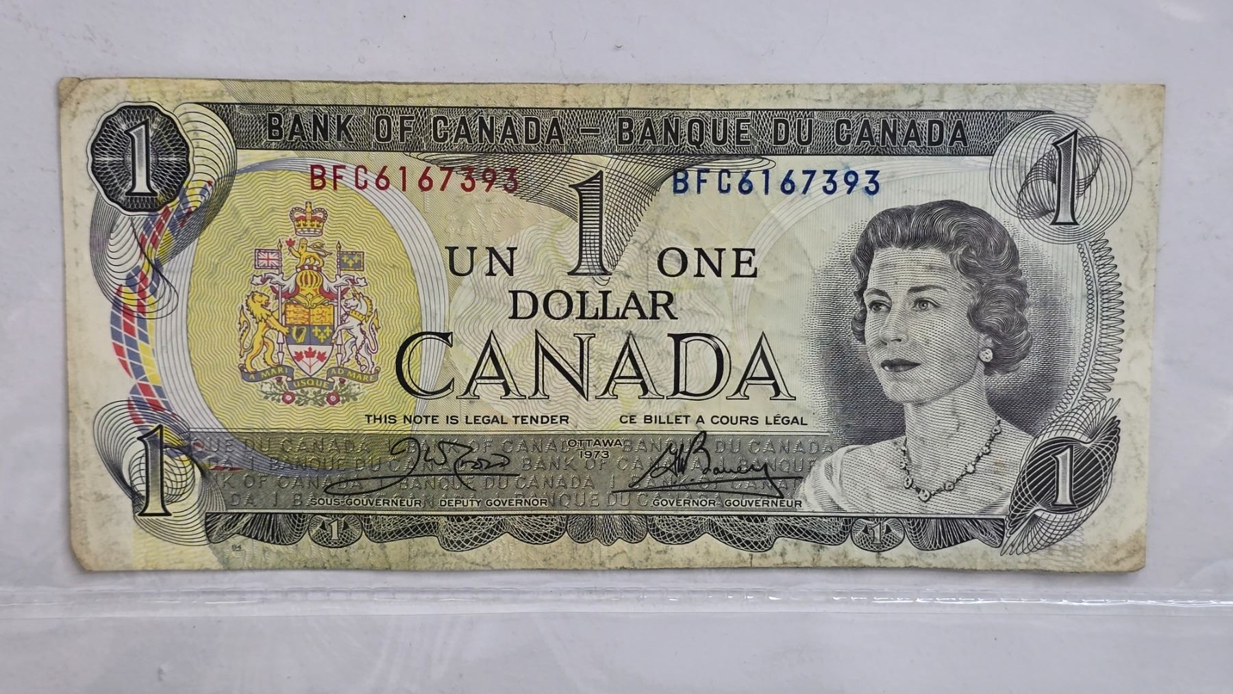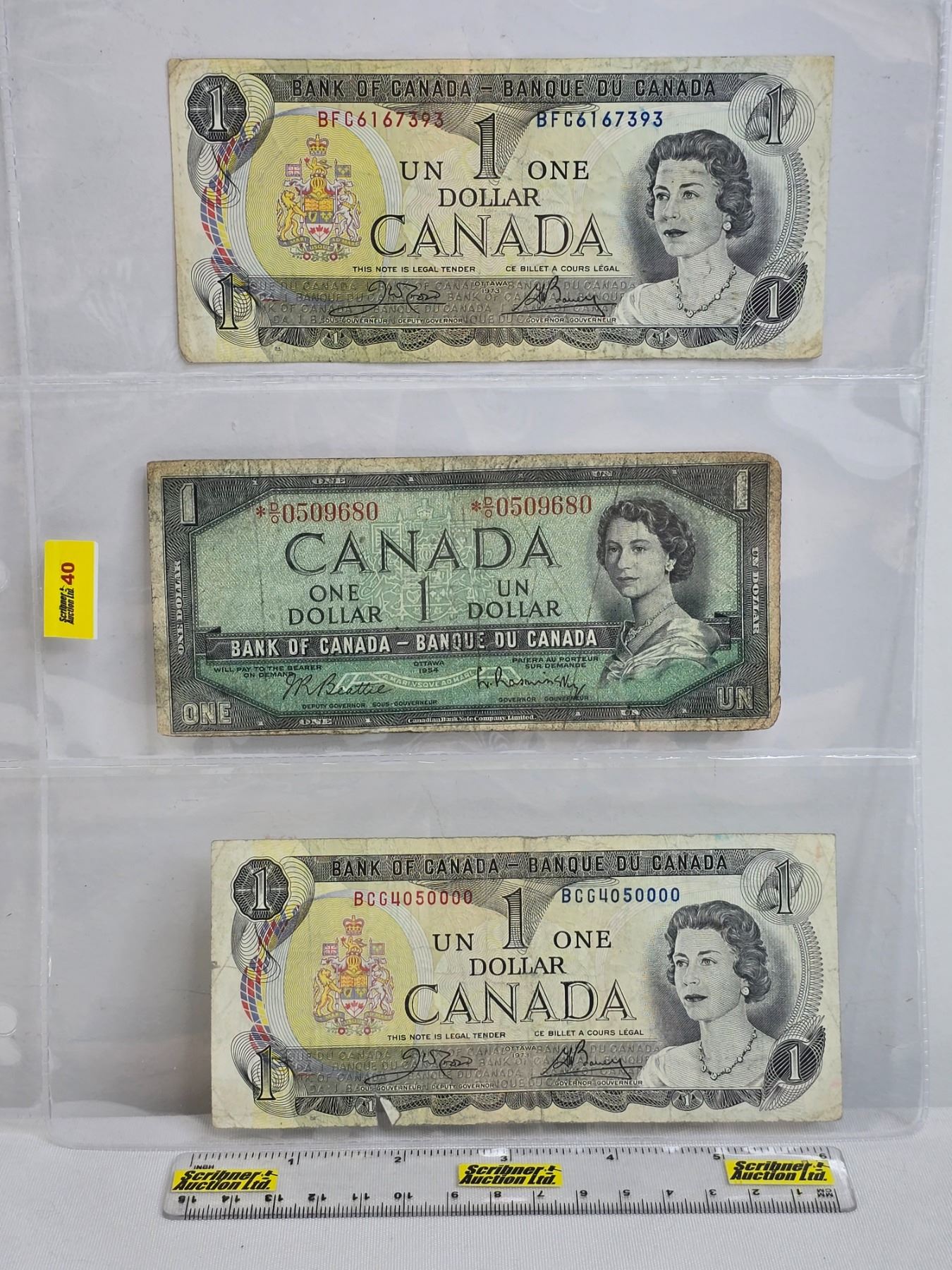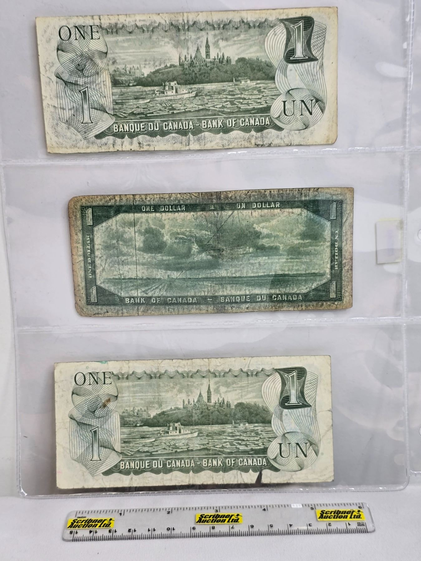 Canada $1 Bills (3): -1973 : Crow/Bouey #BFC6167393 - 1954 *Replacement : Beattie/Rasminsky # *DO0509680 - 1973 : Crow/Bouey #BCG4050000 (See Pics for Varieties, Conditions, Serial Numbers, Printing Dates & Signatures) (Listing & Descriptions are a GUIDE ONLY and are subject to changes, errors, additions or deletions. Please use the provided pictures to satisfy yourself to the Condition and/or Grades. Please Read & Understand All Terms & Conditions for this Auction Sale.)