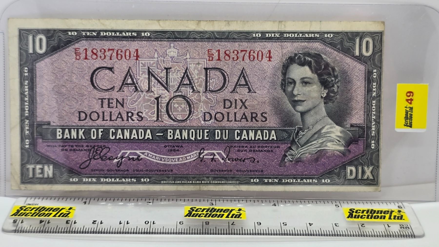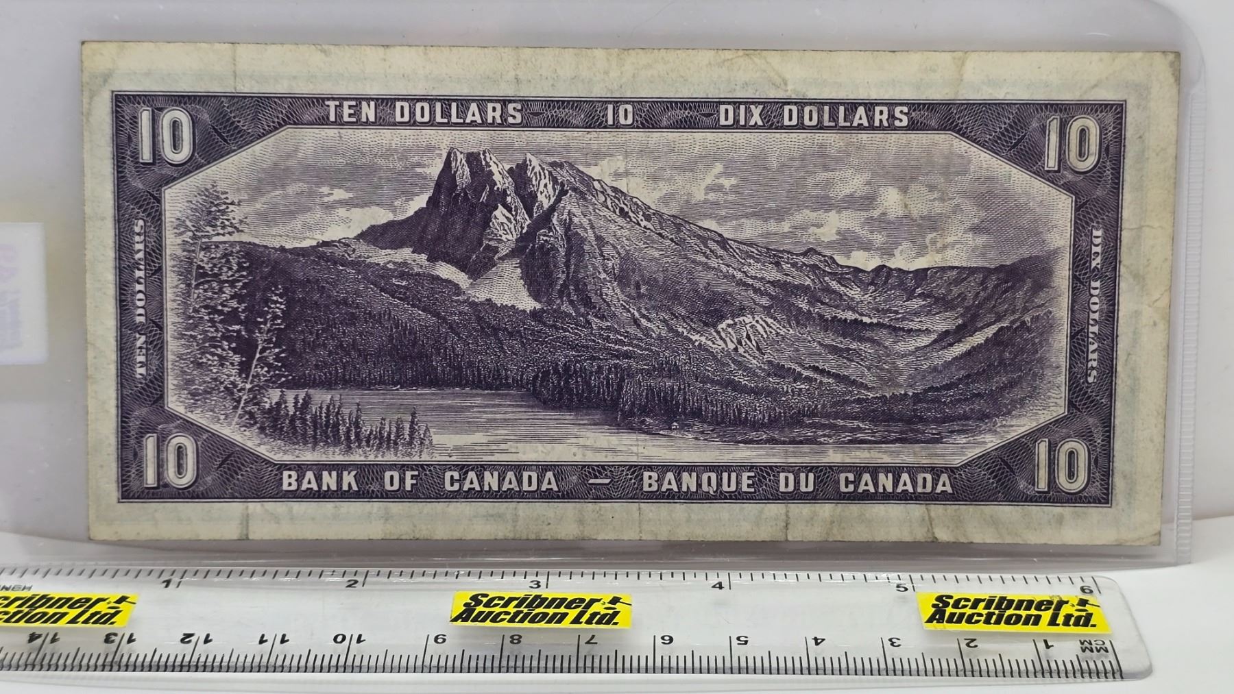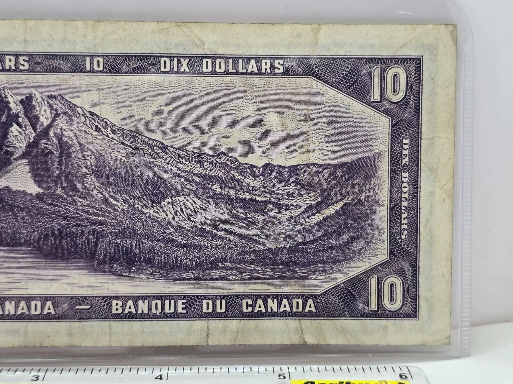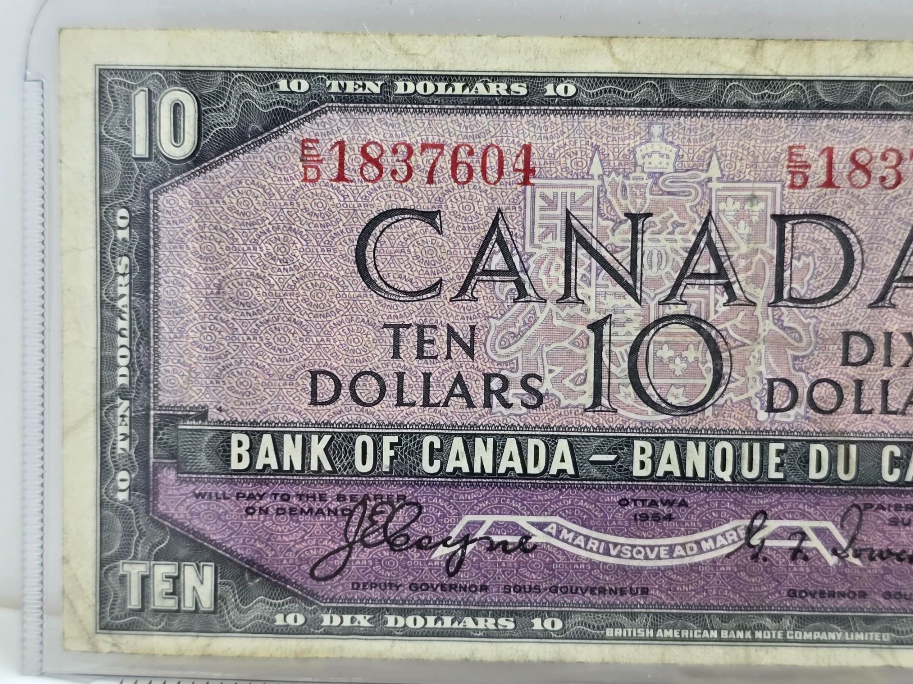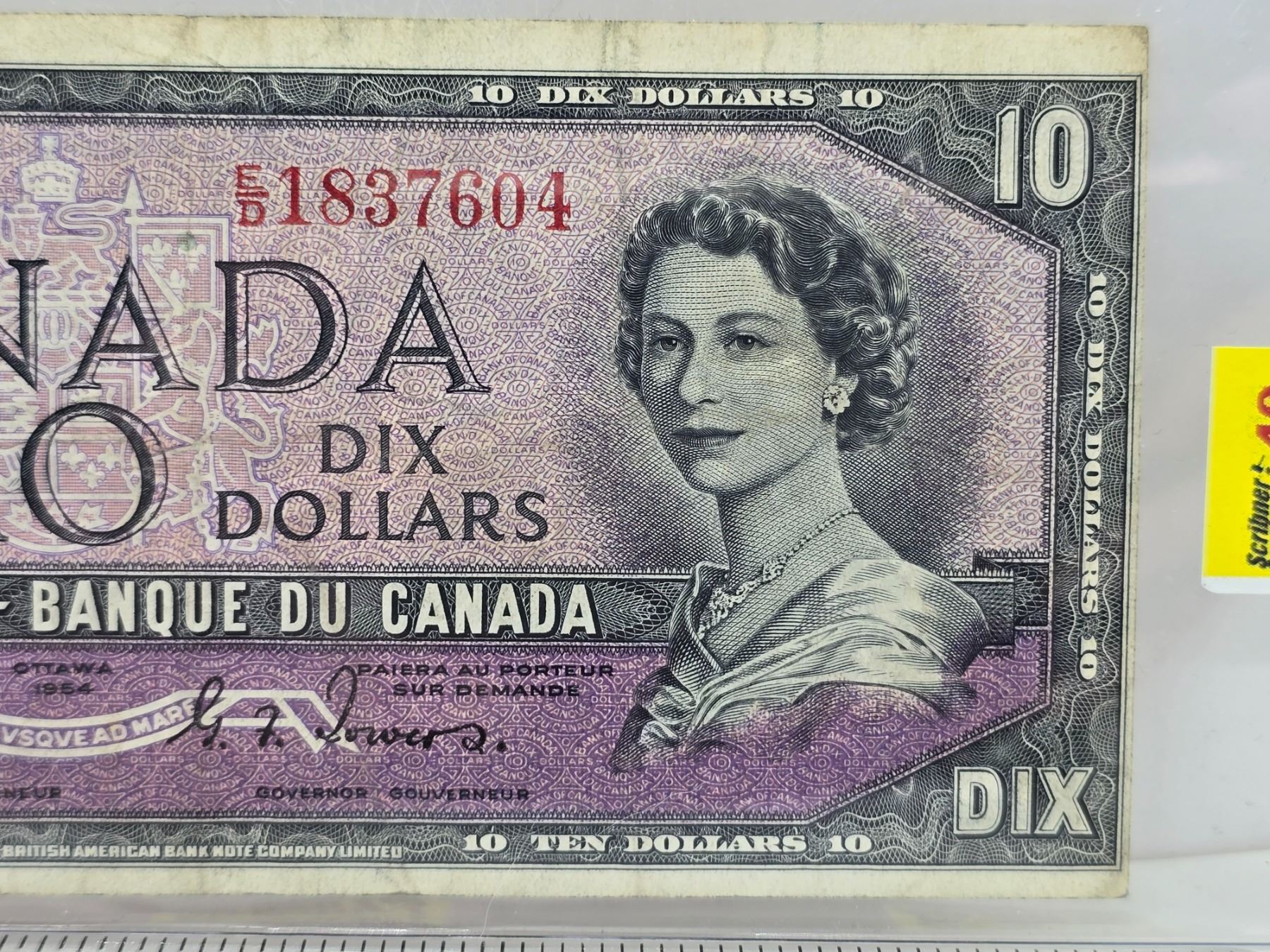 Canada $10 Bill 1954DF "Devil's Face" : Coyne/Towers #ED1837604 (See Pics for Varieties, Conditions, Serial Numbers, Printing Dates & Signatures) (Listing & Descriptions are a GUIDE ONLY and are subject to changes, errors, additions or deletions. Please use the provided pictures to satisfy yourself to the Condition and/or Grades. Please Read & Understand All Terms & Conditions for this Auction Sale.)