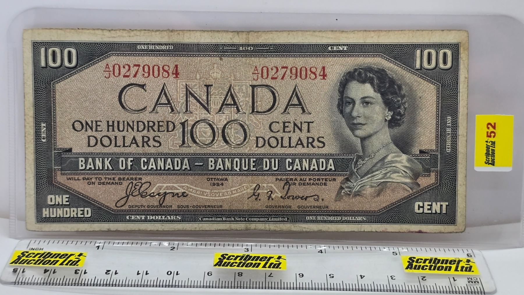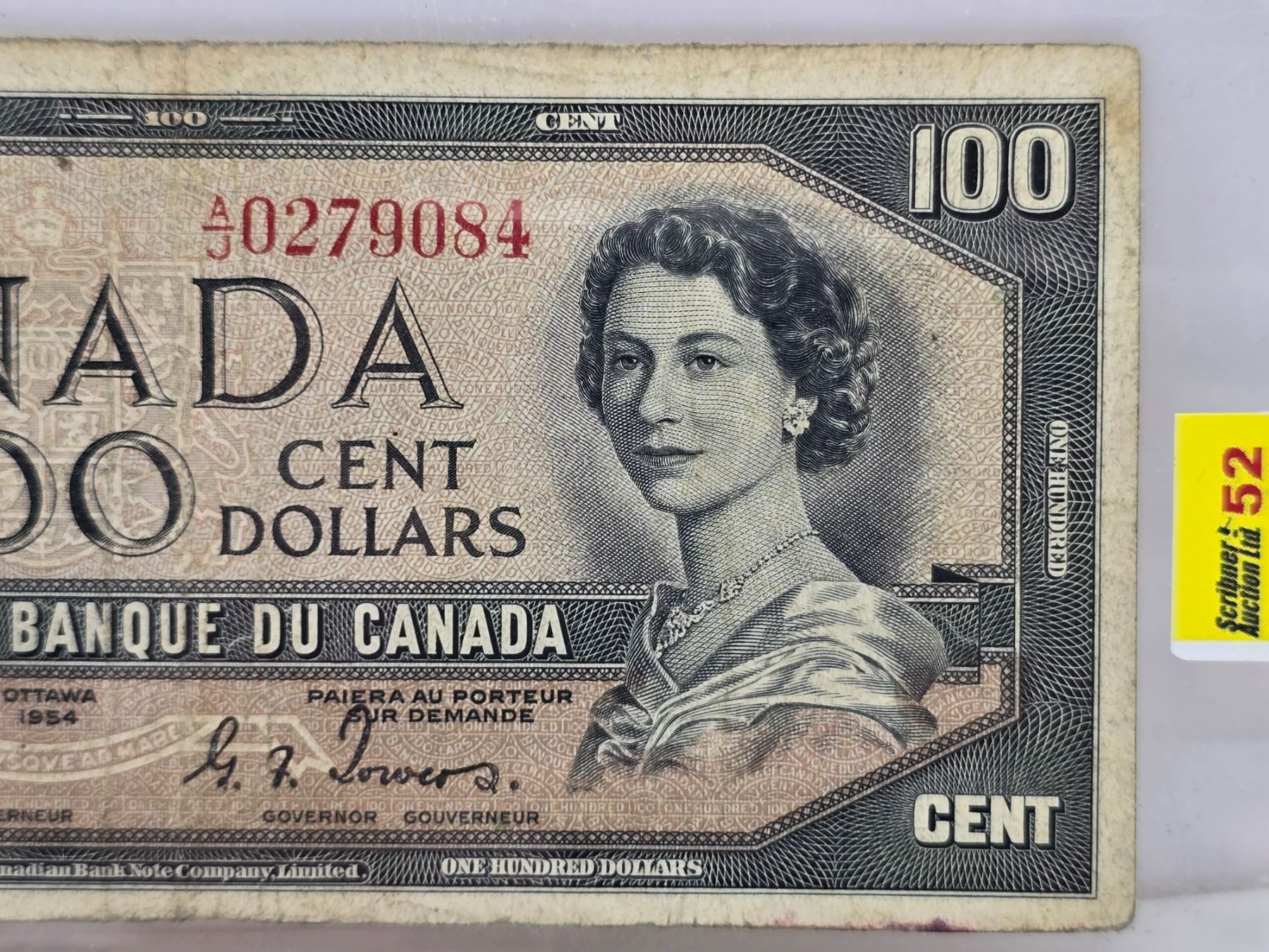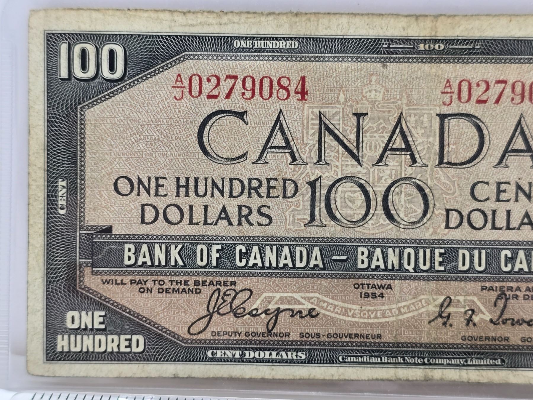 Canada $100 Bill 1954DF "Devil's Face" : Coyne/Towers #AJ0279084 (See Pics for Varieties, Conditions, Serial Numbers, Printing Dates & Signatures) (Listing & Descriptions are a GUIDE ONLY and are subject to changes, errors, additions or deletions. Please use the provided pictures to satisfy yourself to the Condition and/or Grades. Please Read & Understand All Terms & Conditions for this Auction Sale.)