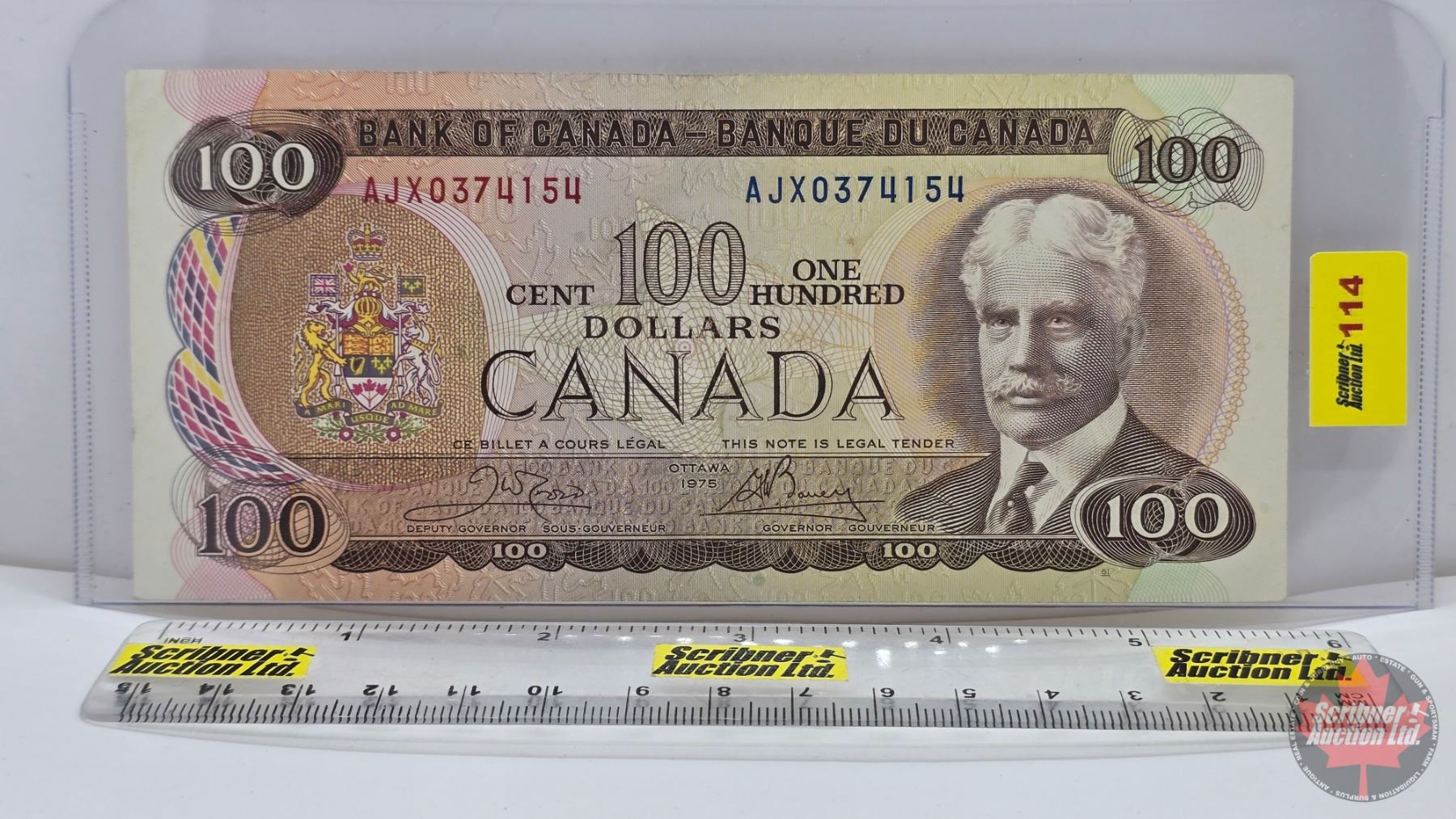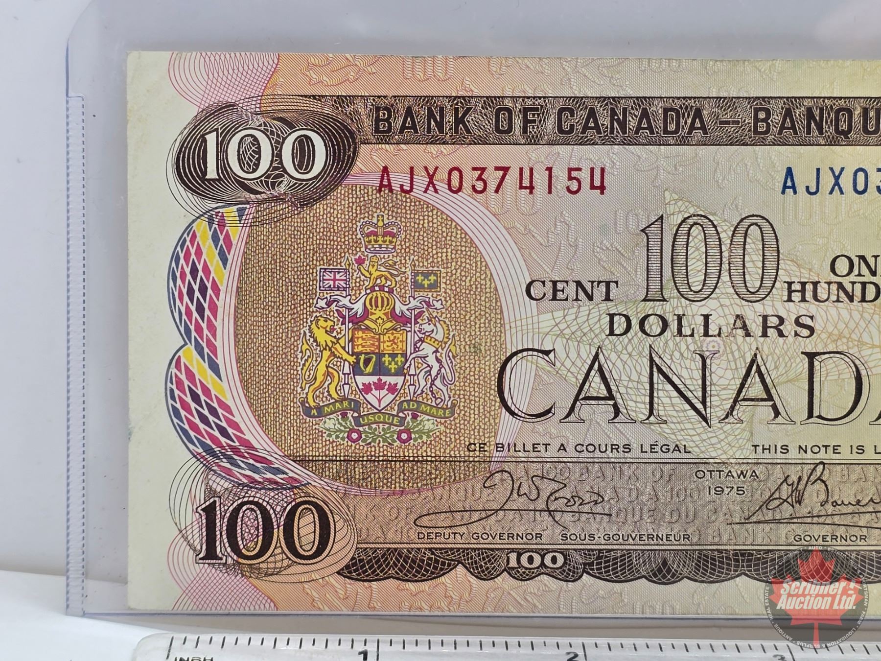Canada $100 Bill 1975 "X-Replacement" : Crow/Bouey #AJX0374154 (See Pictures for Varieties, Conditio