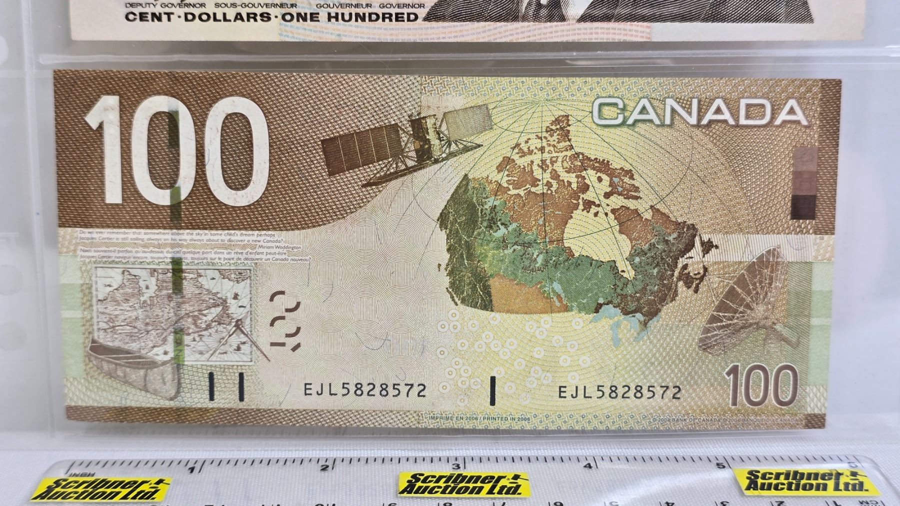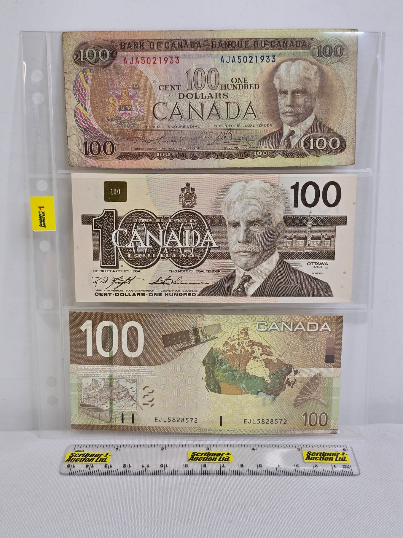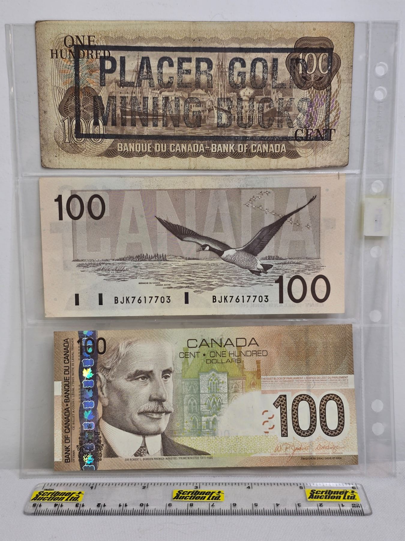 Canada $100 Bills (3): - 1975 Lawson/Bouey #AJA5021933 (Note: Back Stamped "PLACER GOLD MINING BUCKS" - 1988 Knight/Thiessen #BJK7617703 - 2004 Jenkins/Dodge #EJL5828572 (See Pics for Varieties, Conditions, Serial Numbers, Printing Dates & Signatures) (Listing & Descriptions are a GUIDE ONLY and are subject to changes, errors, additions or deletions. Please use the provided pictures to satisfy yourself to the Condition and/or Grades. Please Read & Understand All Terms & Conditions for this Auction Sale.)