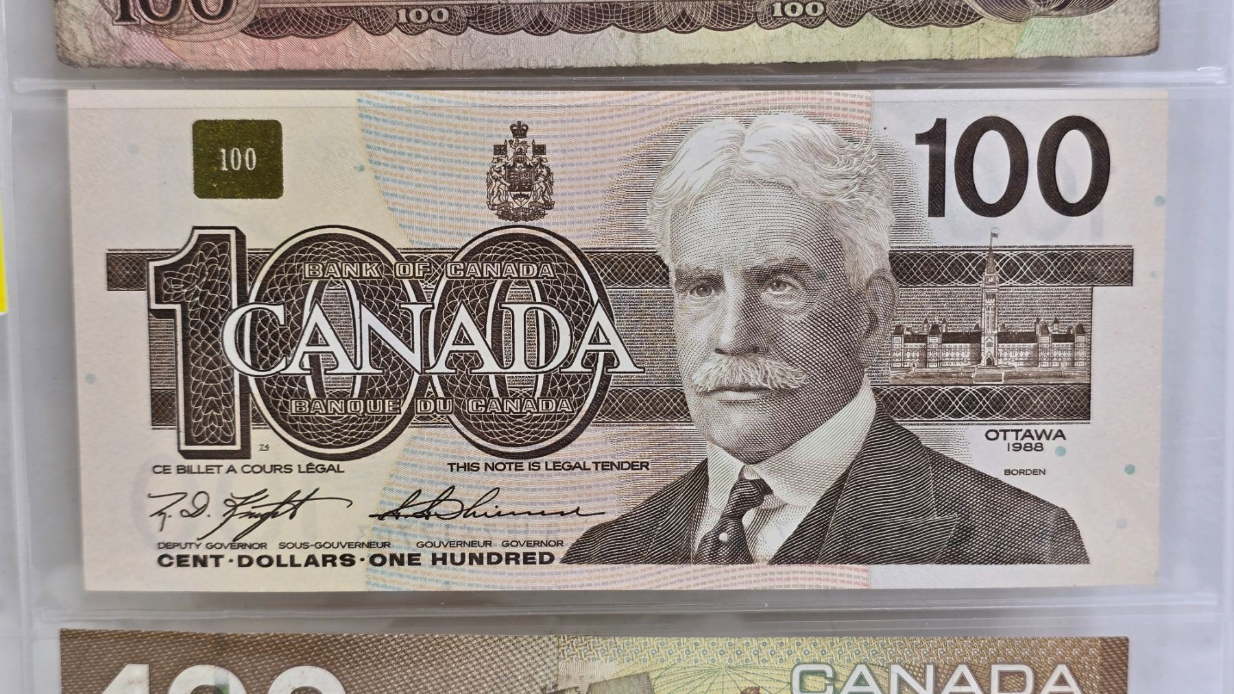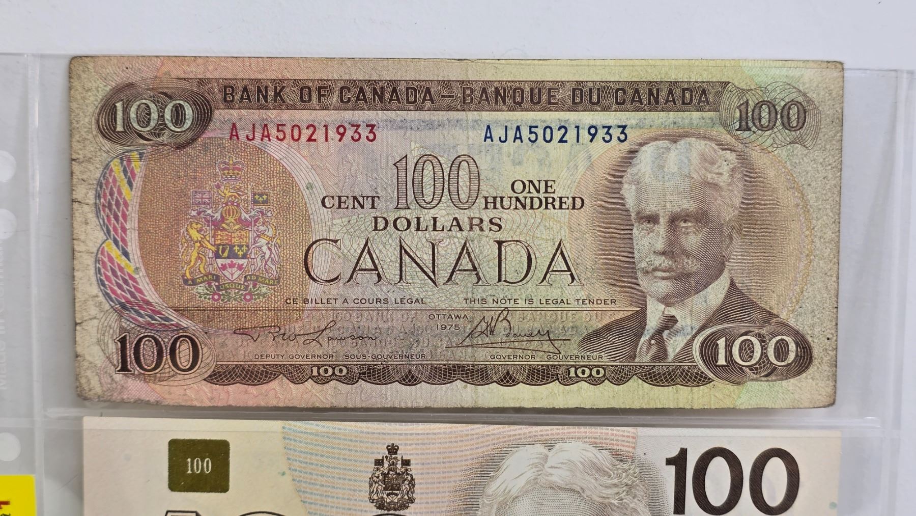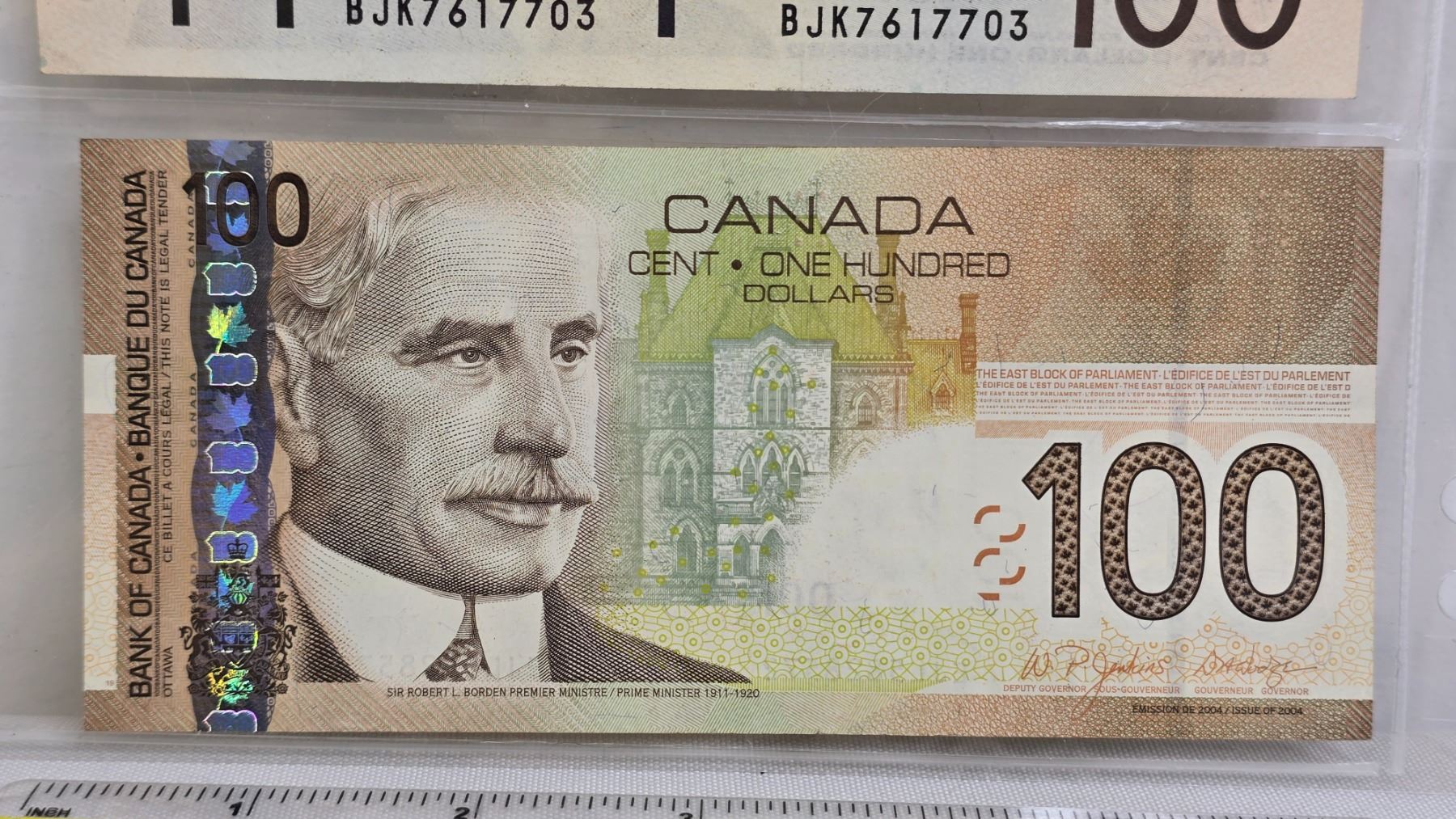 Canada $100 Bills (3): - 1975 Lawson/Bouey #AJA5021933 (Note: Back Stamped "PLACER GOLD MINING BUCKS" - 1988 Knight/Thiessen #BJK7617703 - 2004 Jenkins/Dodge #EJL5828572 (See Pics for Varieties, Conditions, Serial Numbers, Printing Dates & Signatures) (Listing & Descriptions are a GUIDE ONLY and are subject to changes, errors, additions or deletions. Please use the provided pictures to satisfy yourself to the Condition and/or Grades. Please Read & Understand All Terms & Conditions for this Auction Sale.)