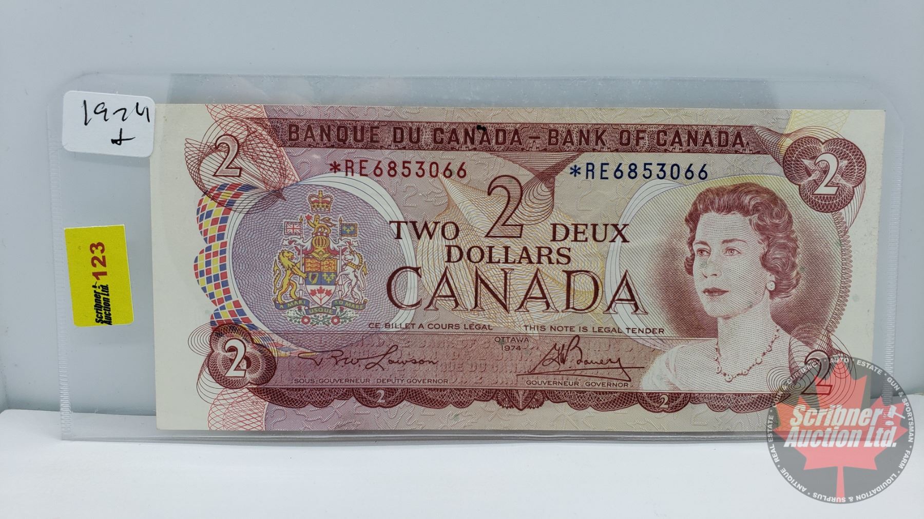 Canada $2 Bill 1974 Replacement : Lawson/Bouey S/N#*RE6853066