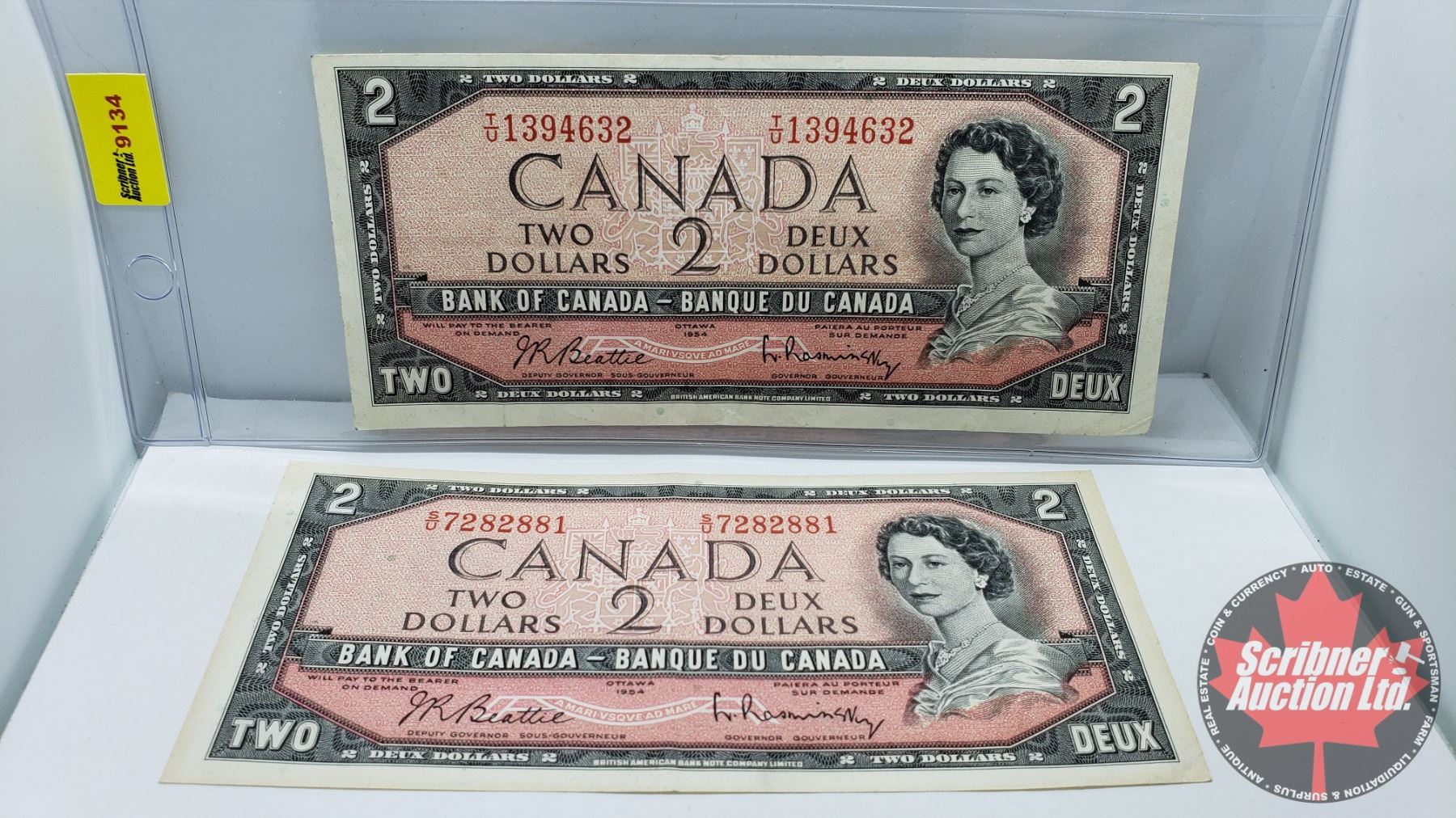 Canada $2 Bills 1954 (2): Beattie/Rasminsky #SU7282881 & #TU1394632