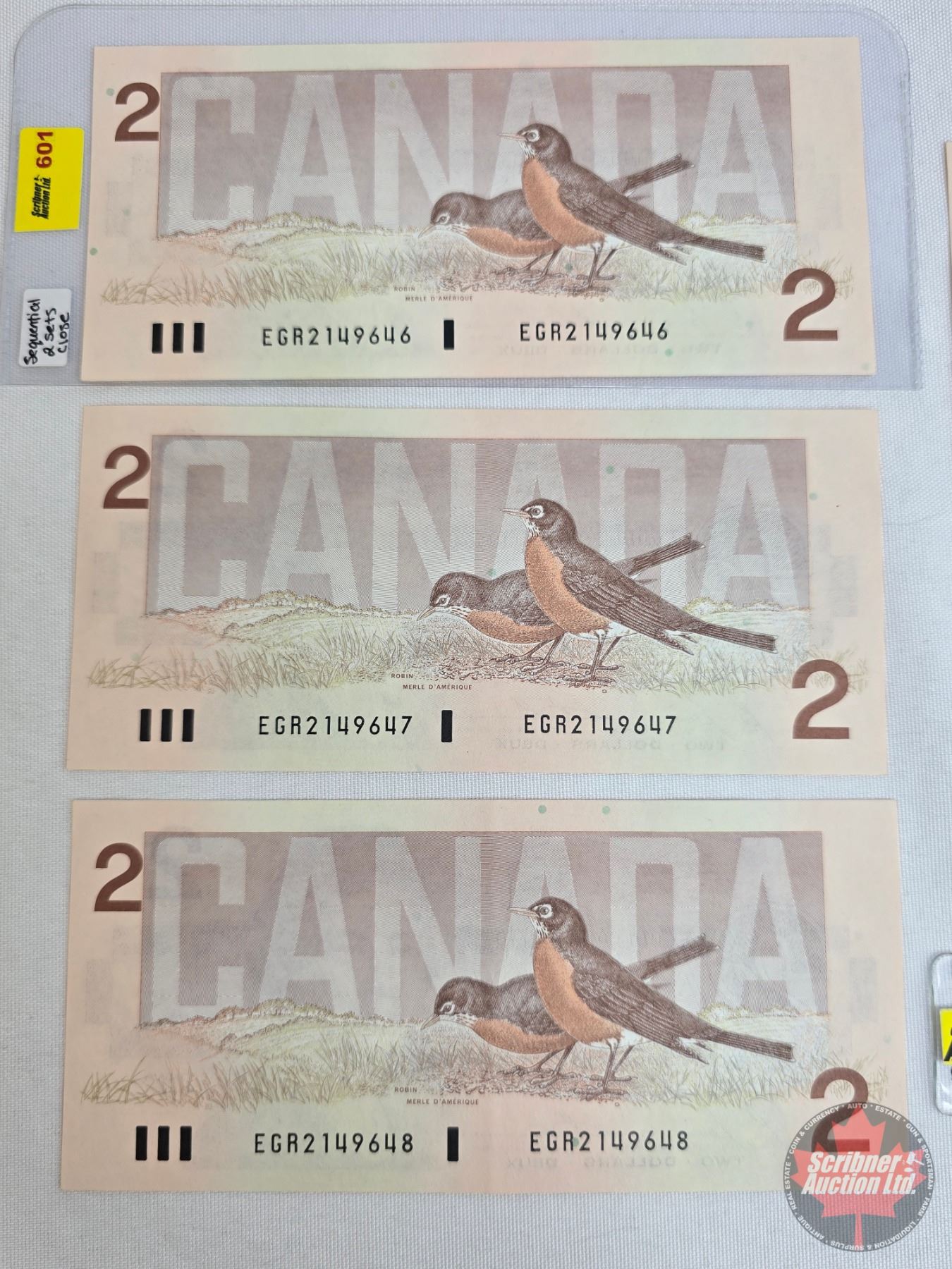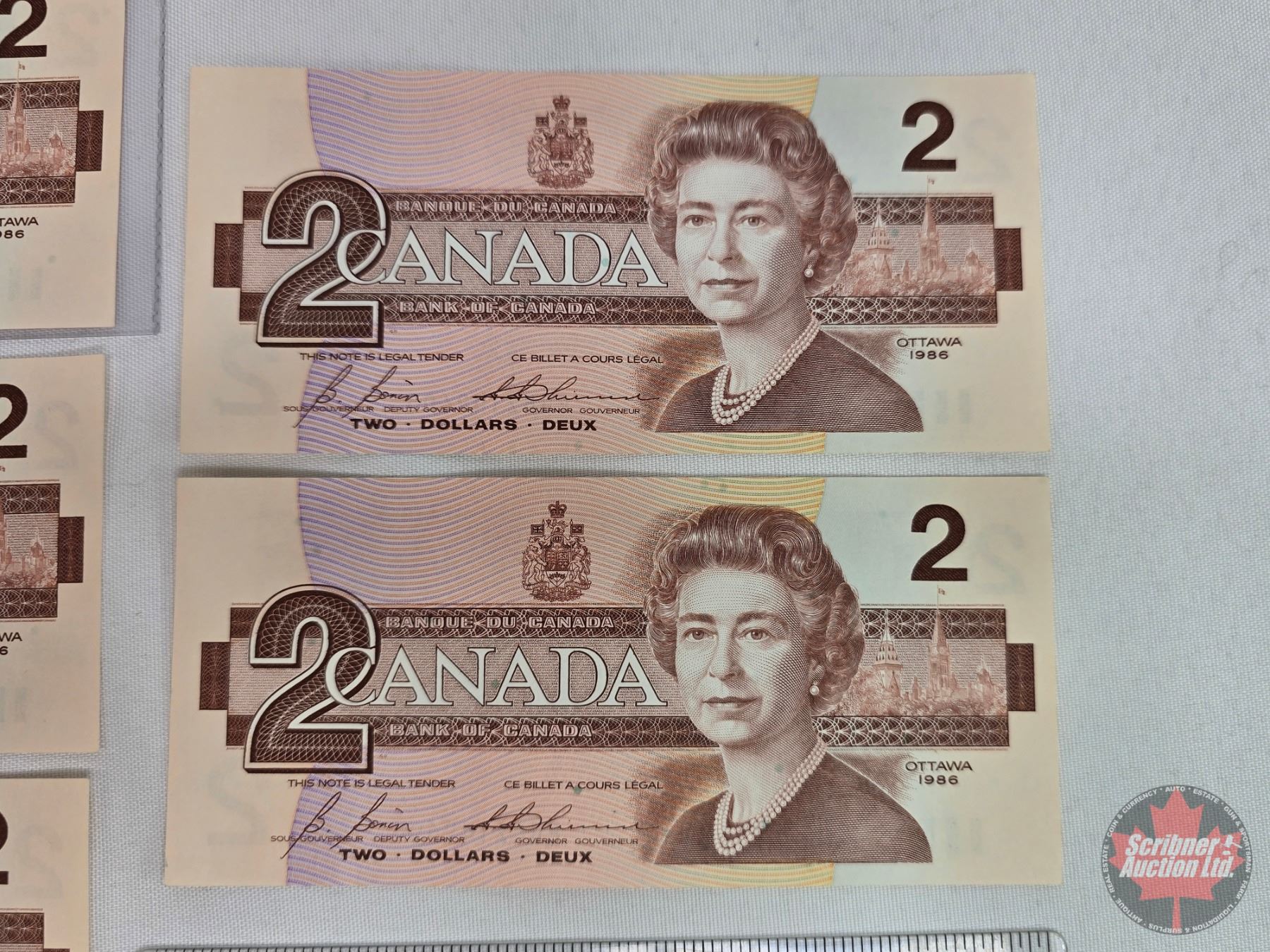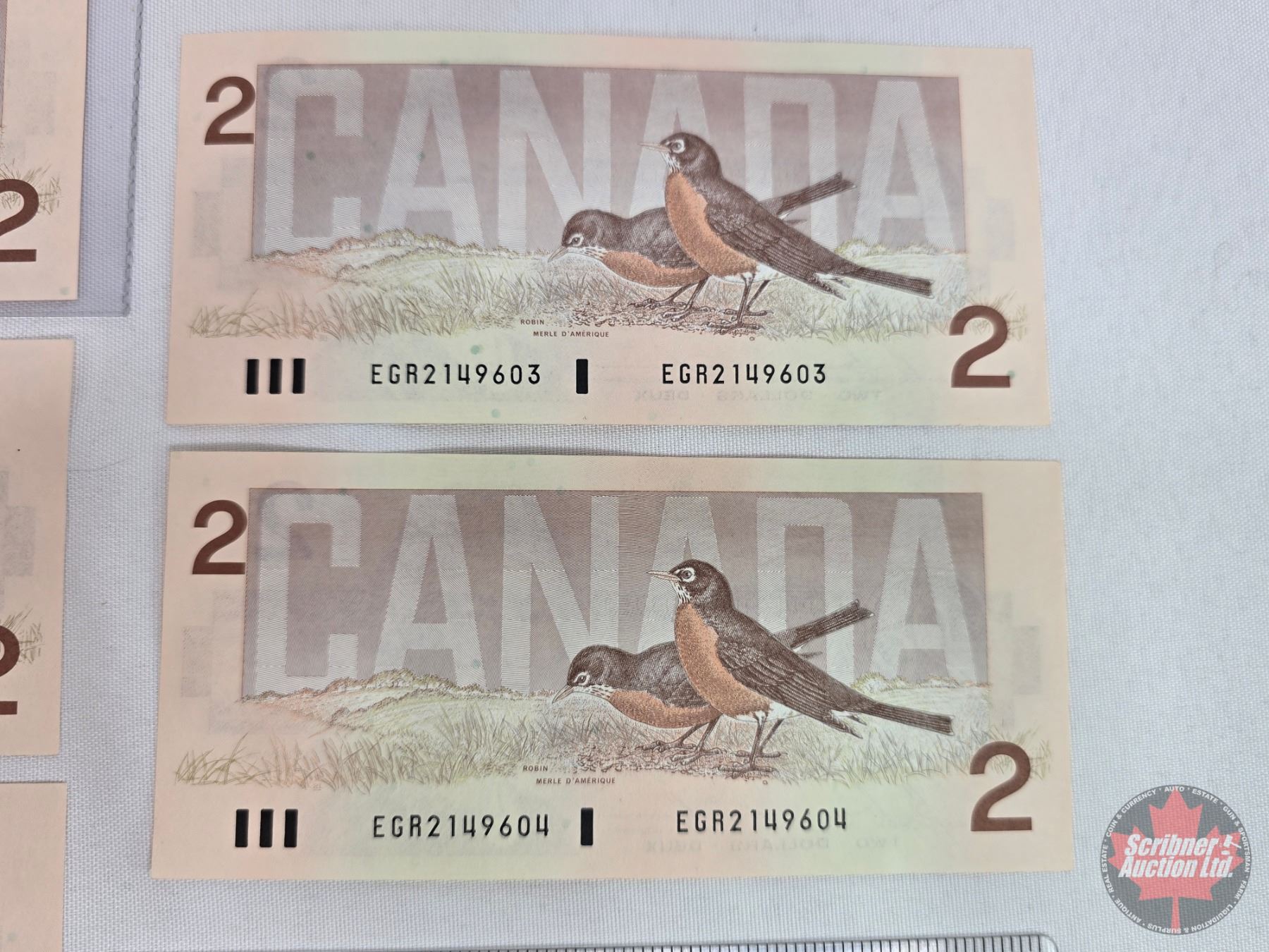 Canada $2 Bills 1986 (3 Consecutive + 2 Consecutive) : - Bonin/Thiessen #EGR2149646-647-648 - Bonin/Thiessen #EGR2149603-9604 (See Pics for Varieties, Conditions, Serial Numbers, Printing Dates & Signatures) (Listing & Descriptions are a GUIDE ONLY and are subject to changes, errors, additions or deletions. Please use the provided pictures to satisfy yourself to the Condition and/or Grades. Please Read & Understand All Terms & Conditions for this Auction Sale.)