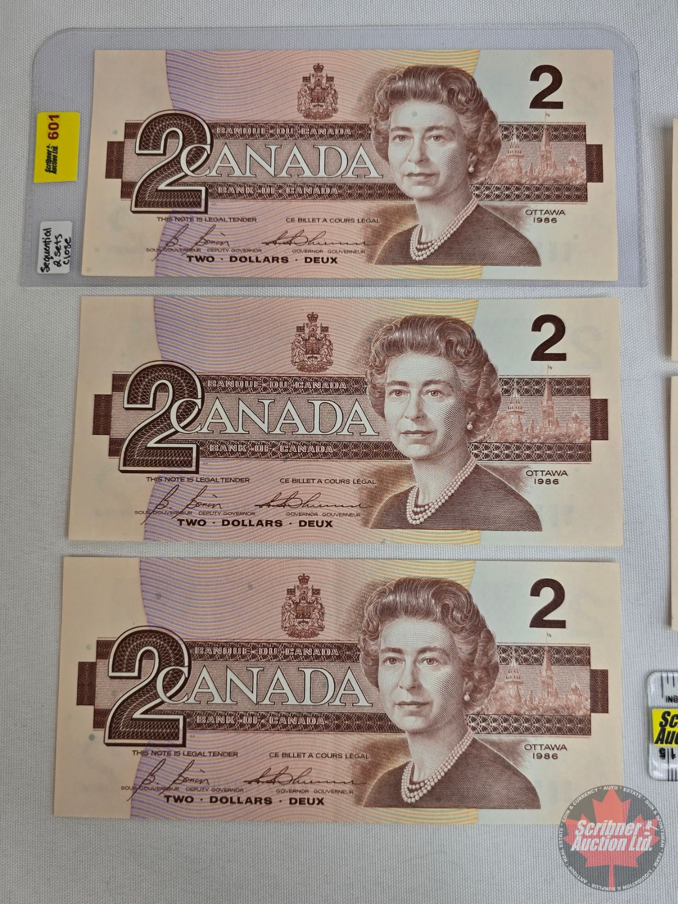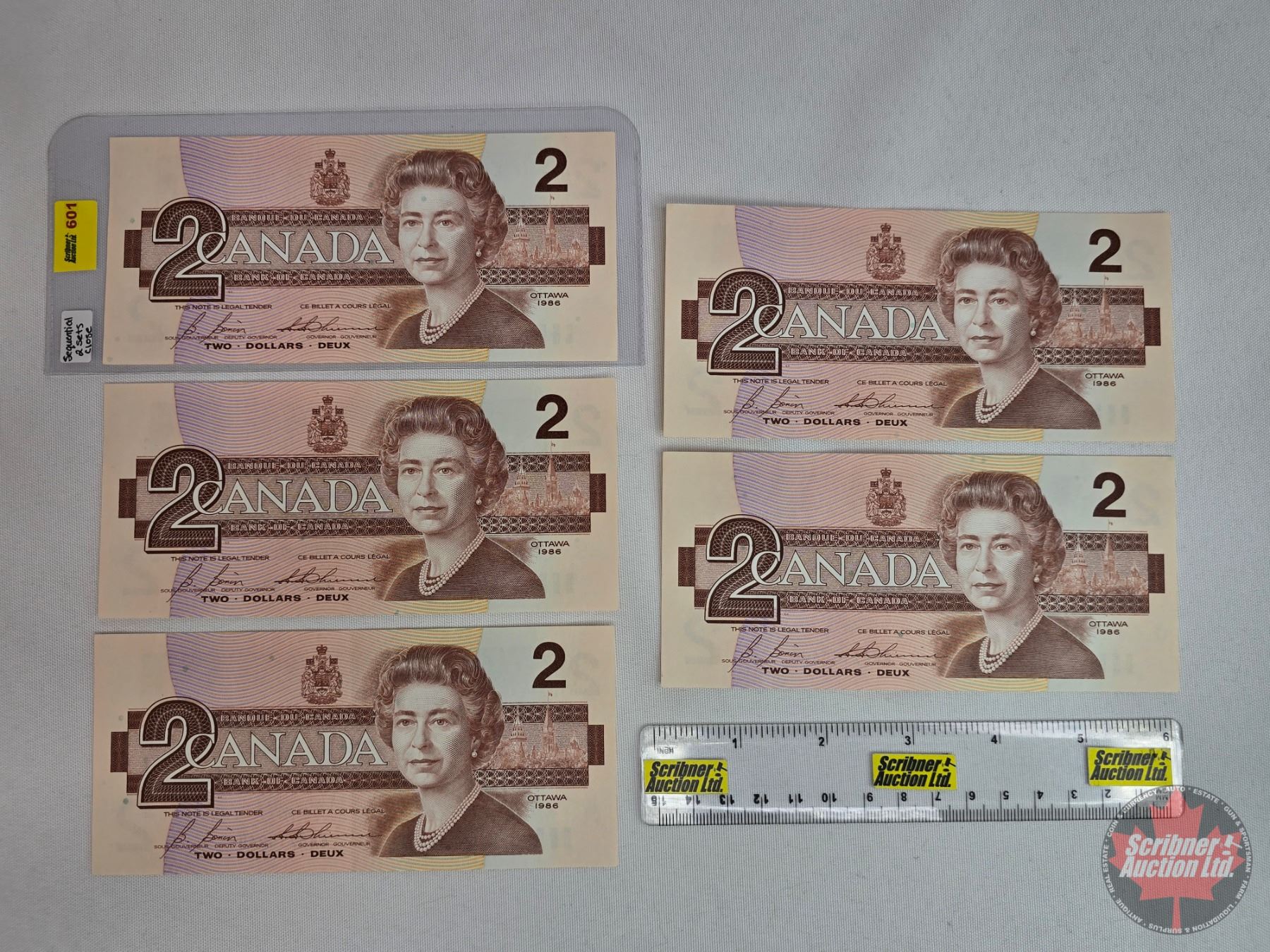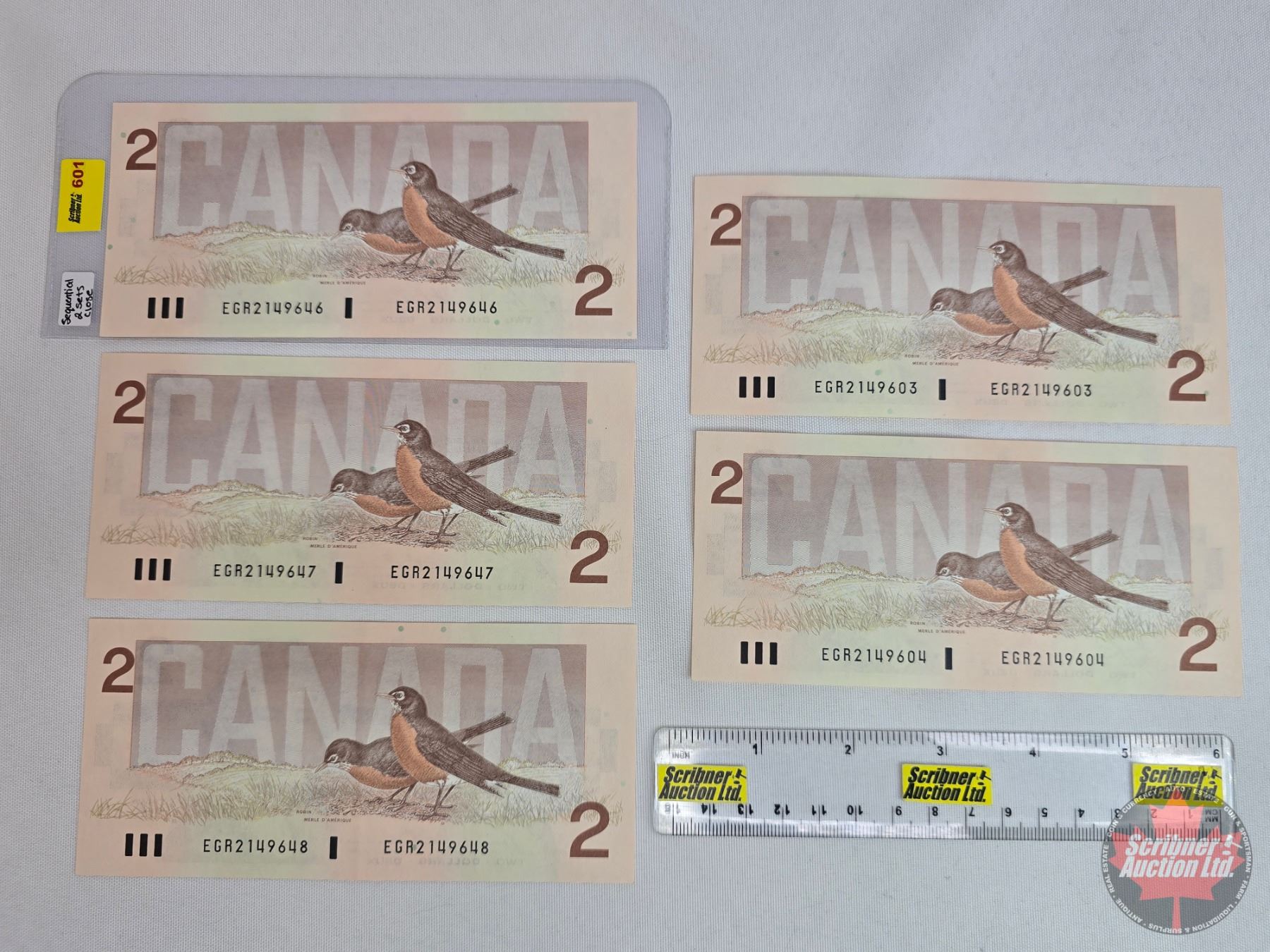 Canada $2 Bills 1986 (3 Consecutive + 2 Consecutive) : - Bonin/Thiessen #EGR2149646-647-648 - Bonin/Thiessen #EGR2149603-9604 (See Pics for Varieties, Conditions, Serial Numbers, Printing Dates & Signatures) (Listing & Descriptions are a GUIDE ONLY and are subject to changes, errors, additions or deletions. Please use the provided pictures to satisfy yourself to the Condition and/or Grades. Please Read & Understand All Terms & Conditions for this Auction Sale.)
