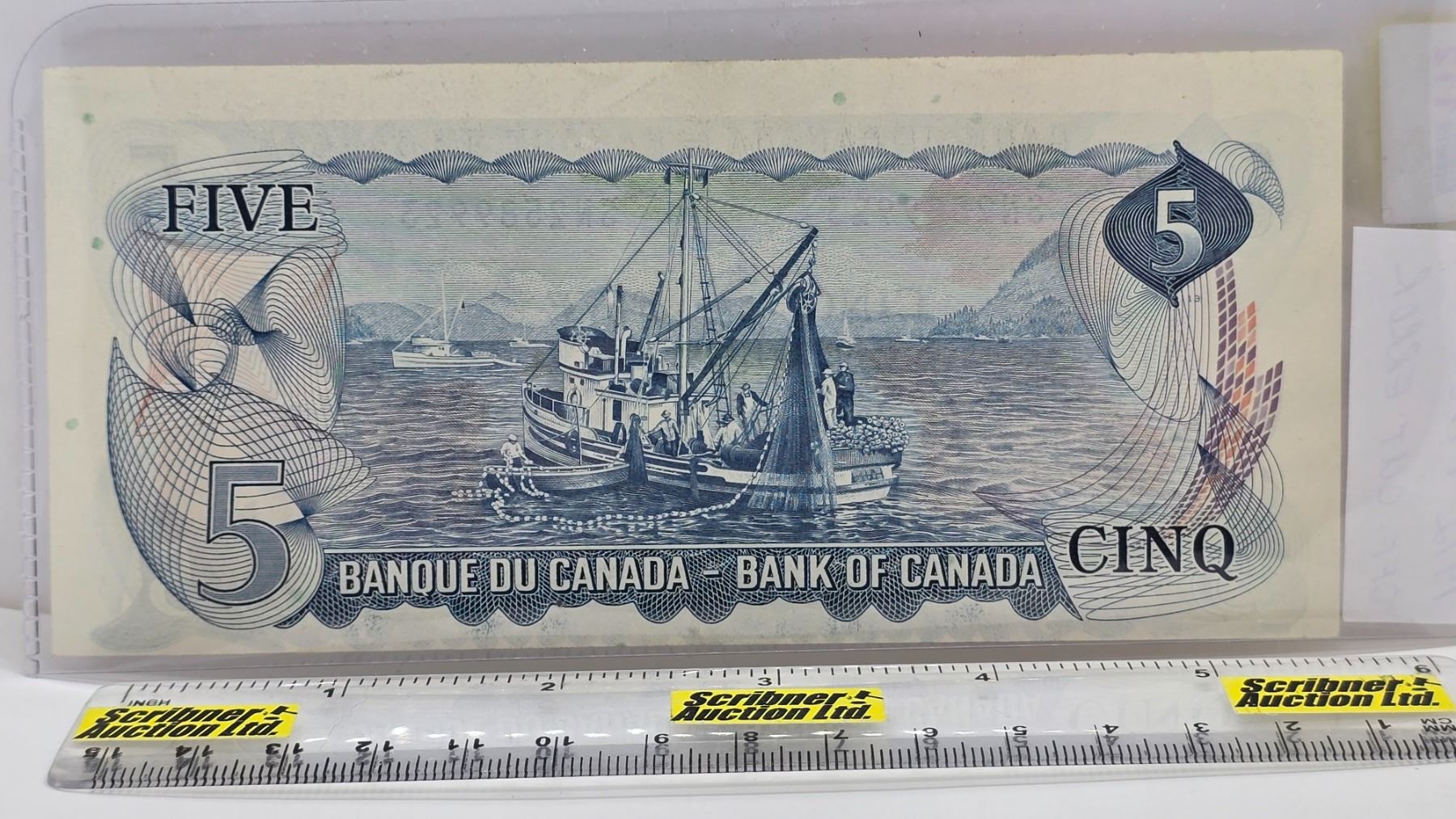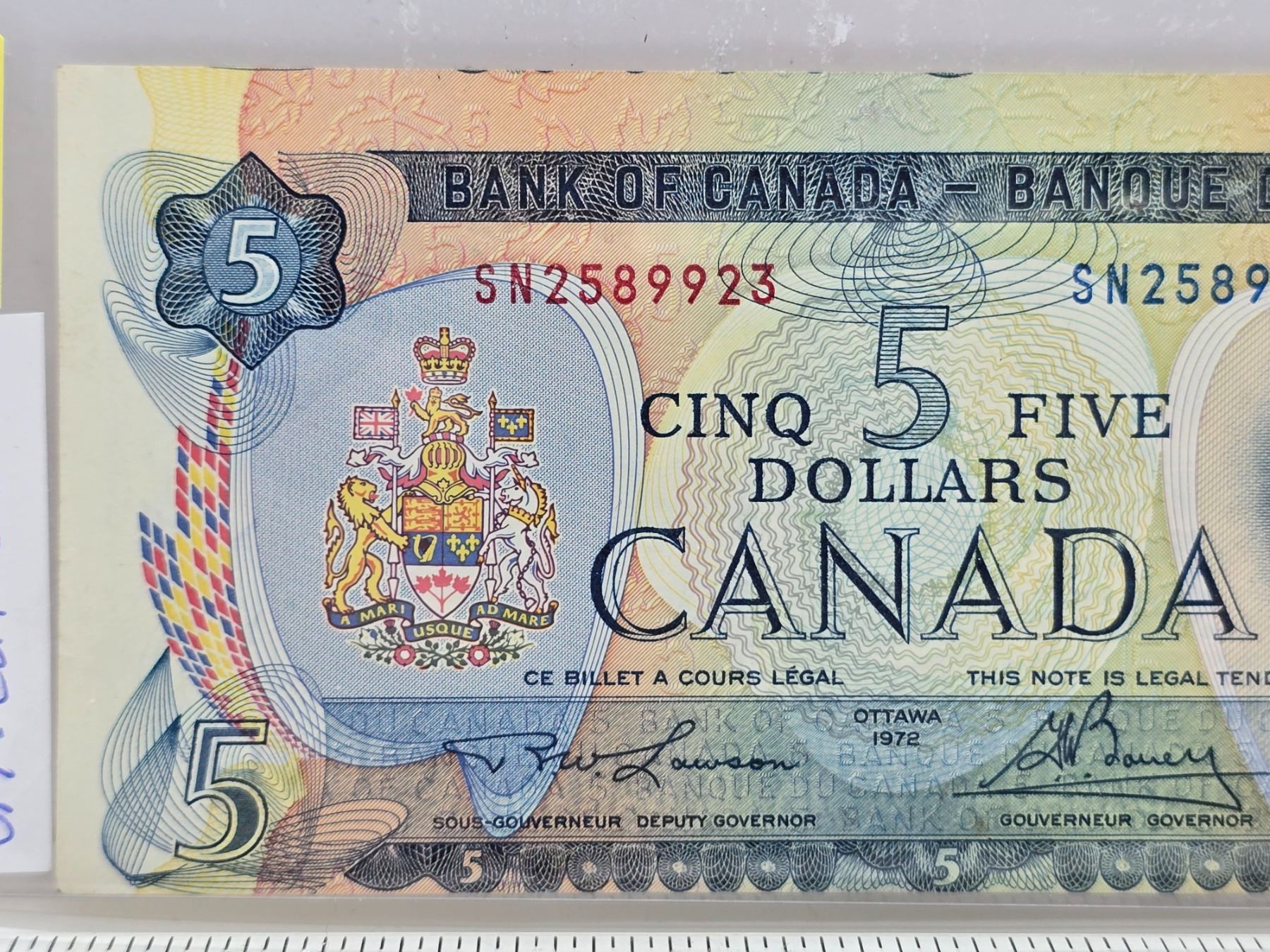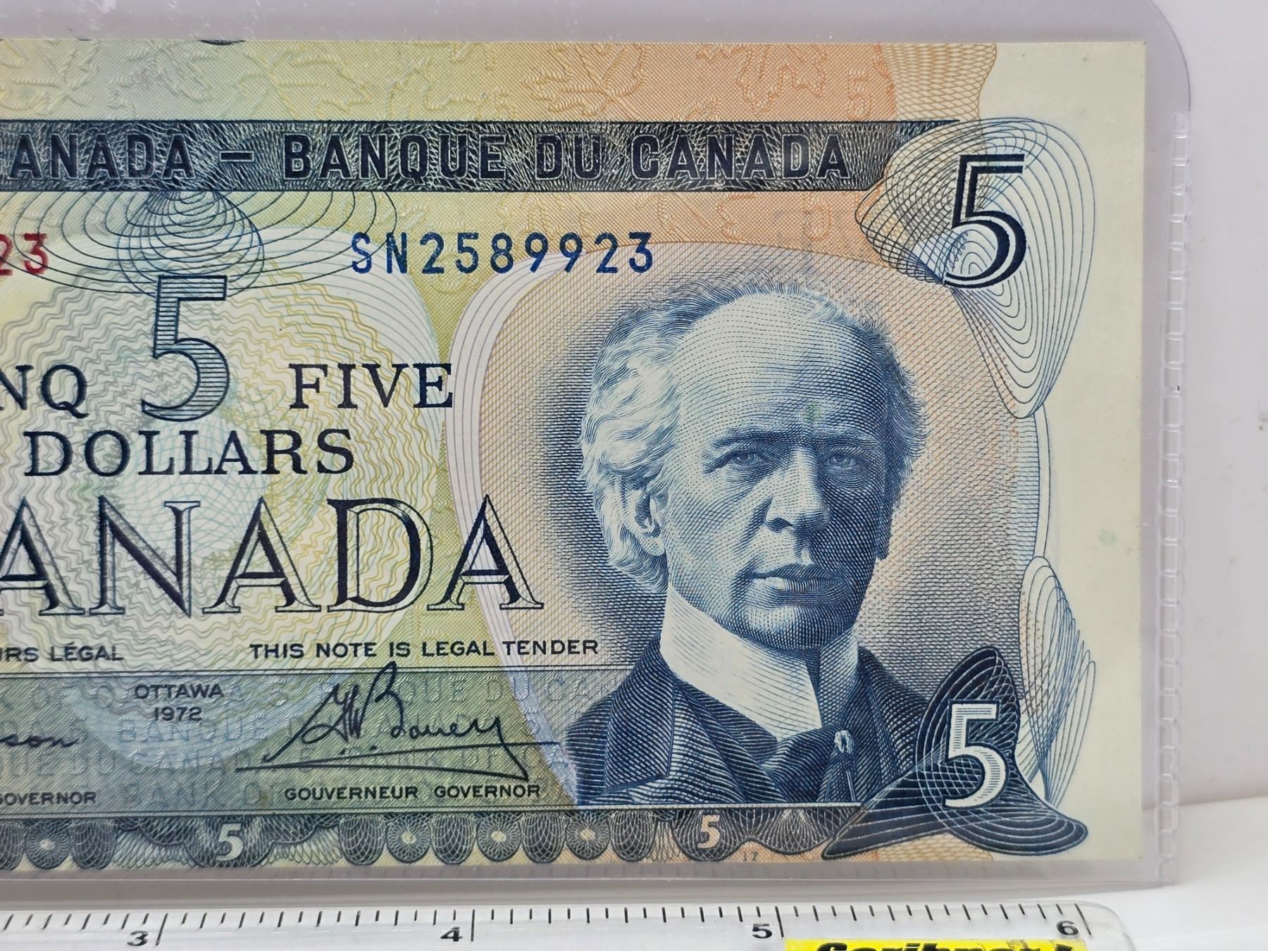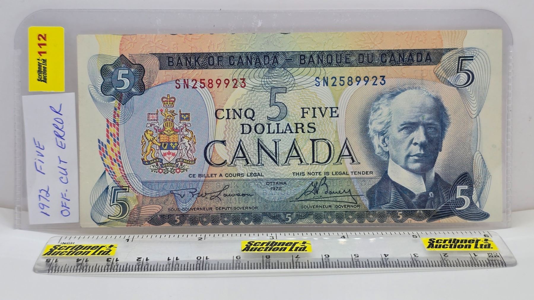 Canada $5 Bill 1972 (Off-Cut Error) : Lawson/Bouey #SN2589923 (See Pics for Varieties, Conditions, S